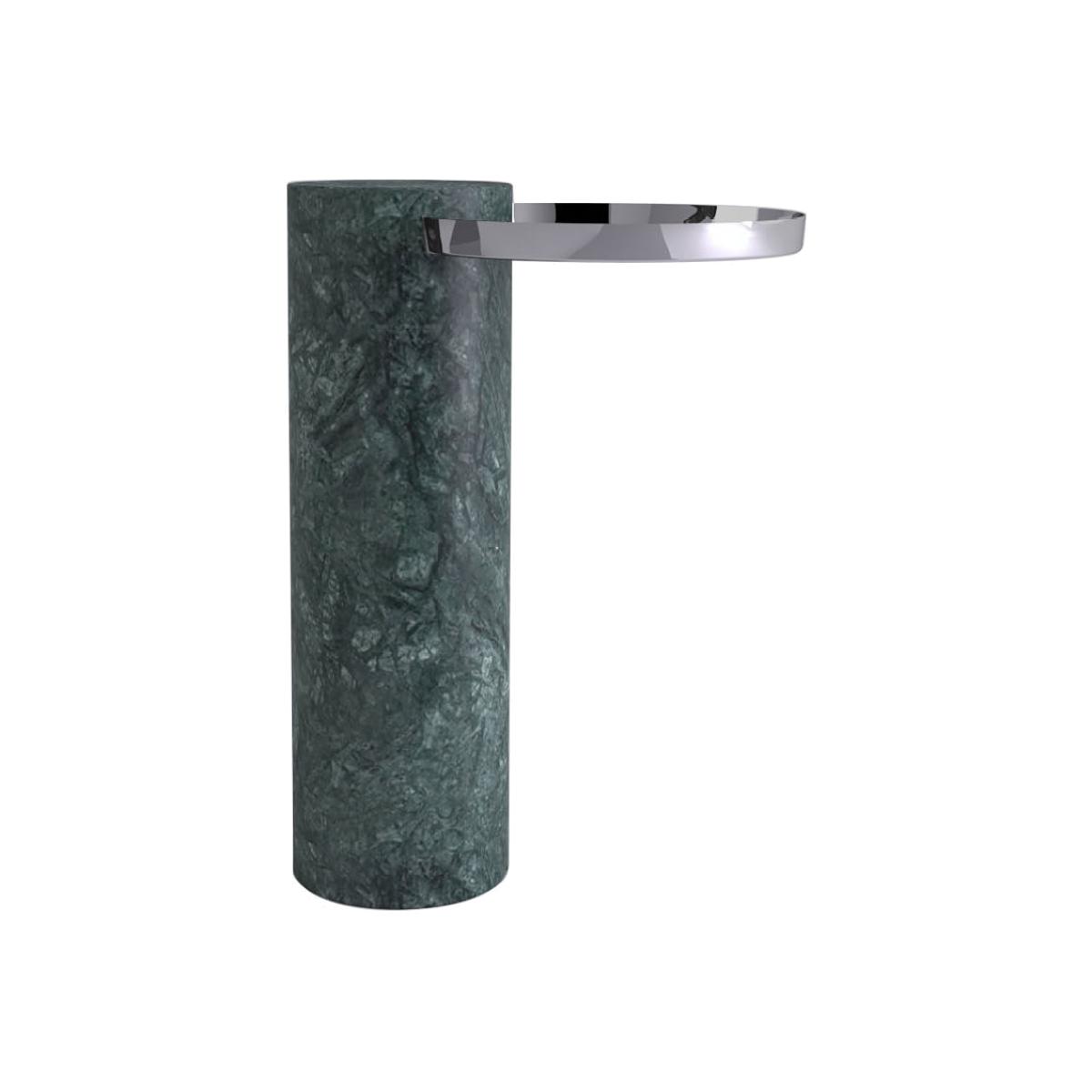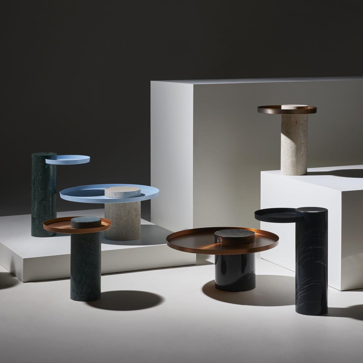 An incredible mix of styles and materials for this collection of refined yet modern coffee tables. These tables feature a sophisticated, sculptural construction that explores the notion of balance. They feature a slim, balancing Metal Tray perched atop an imposing Marble Column. The off-center top gives a sense of precarious balance that is only apparent. In reality, the table is perfectly stable thanks to the solid marble Base that acts as a counterweight. The massive lines of the Marble Column and its classic style are counterbalanced by the visual lightness of the Tray.