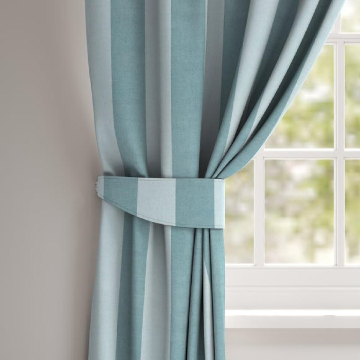 * Premium Polyester Composition * Sophisticated, stripe design * Available with a plain or piped edge * Coordinating Made to Measure and Made to Order items available to purchase separately Elevate your curtain styling with the sophisticated simplicity of the Saluzzo Stripe Made to Order Tieback. Featuring bold, closely matched colour stripes, this design delivers a sleek, tailored finish that suits both contemporary and classic interiors. Made from premium polyester, the fabric offers durability, easy maintenance, and a smooth hand-feel, ensuring it looks fresh and structured over time. The option to choose between a plain or piped edge allows for subtle personalisation, making it easy to align with your overall aesthetic. Whether you're tying back heavy curtains in a formal living room or adding structure to light drapes in a modern bedroom, this tieback blends effortlessly with your décor. Pair with matching made to measure curtains or Roman blinds to create a refined, cohesive window scheme. The clean lines and colour-coordinated stripes lend a sense of order and calm, making this tieback the perfect finishing detail for a polished interior.