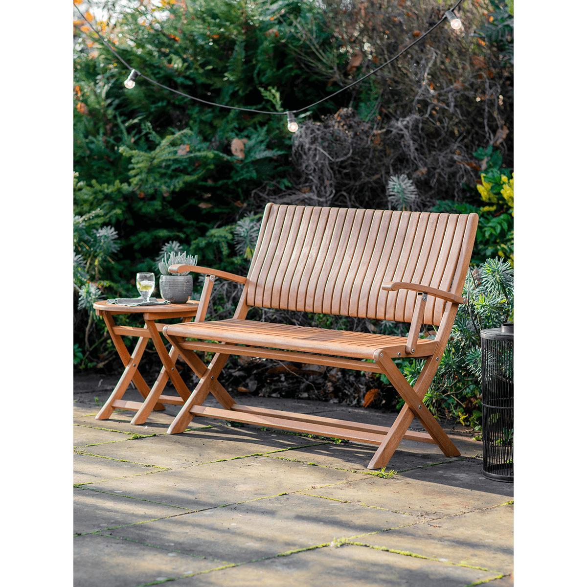A summer essential for every garden, sit side-by-side with your loved ones on our Salva Folding Bench. Merging classic outdoor furniture design with the rich chestnut hues of eucalyptus wood to create a laid back, Scandinavian-inspired outdoor aesthetic, this is the ideal place to sit and enjoy the fine weather.