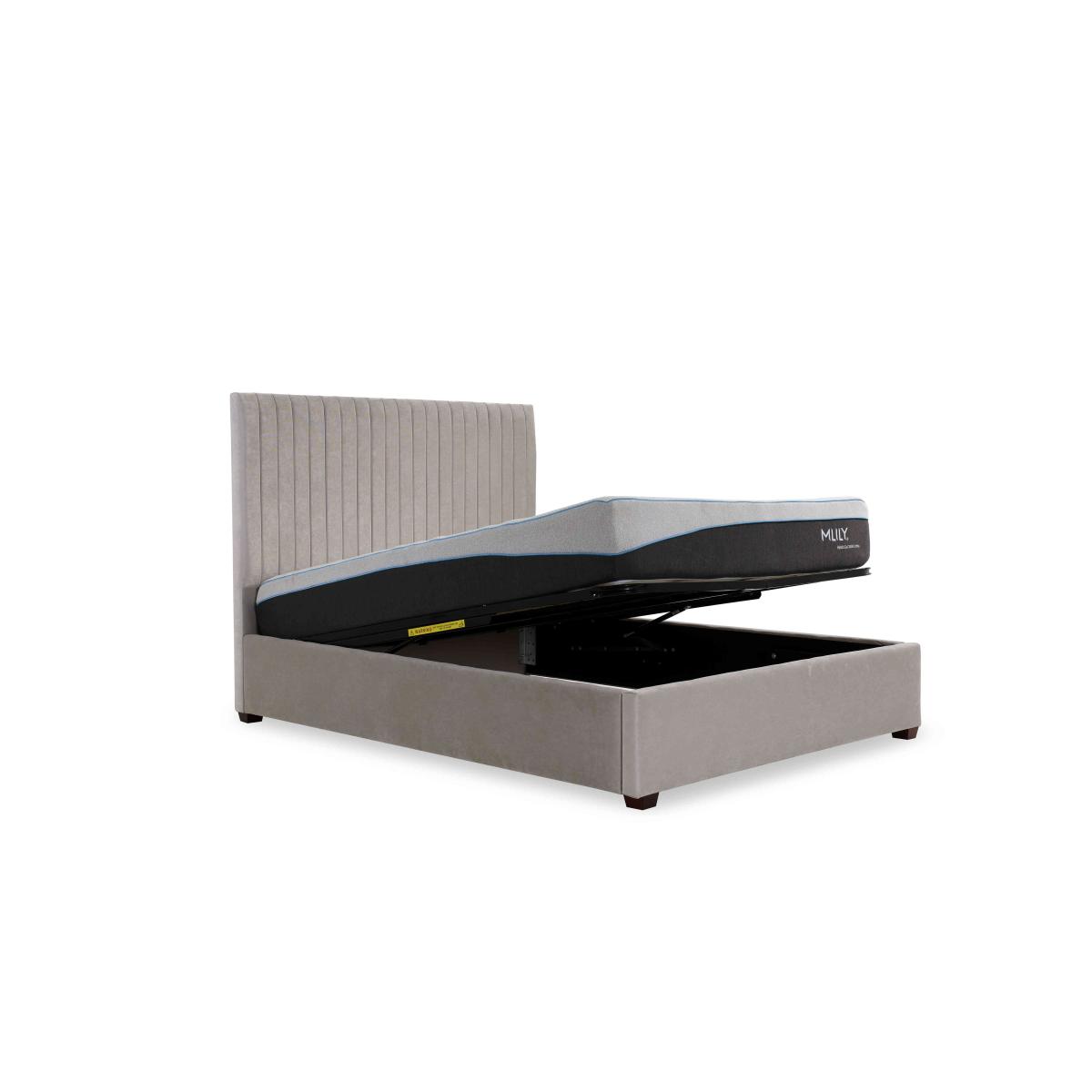 What if you could design your ideal ottoman bed frame? What if you could choose from a range of sumptuous cushioned headboards in dozens of upholstery fabrics, add headboard wings and a matching footboard and more? It’s all possible with our exclusive Mix and Match collection of electric and manual ottoman bed frames. And because there are literally hundreds of possible combinations, it’s impossible to show them all. That’s why you’ll find just a small selection of carefully designed Mix and Match bed frames here which we hope you'll love – or perhaps even inspire you to create your own. The Mix and Match range of customisable ottoman bed frames is exclusively available at Furniture Village. Understated and elegant, this lovely upholstered ottoman bed frame brings extra storage to your bedroom. And as it comes complete with our fluted Sam headboard, it brings exceptional style too. Why you'll love it Luxury style, everyday practicality – this ottoman bed frame will transform your bedroom. Comes complete with our elegant fluted Sam headboard. Large ottoman storage compartment is ideal for lightweight items like duvets, pillows and clothing. Sprung slatted wood base provides excellent support for all kinds of mattresses. Huge choice of high-quality fabric upholstery options. In double, king and super king bed sizes. Also available with an electric-powered ottoman lift mechanism. Handmade in the UK exclusively for Furniture Village. This ottoman bed frame with headboard is part of our Mix and Match range. Mix and match headboard styles and sizes, ottoman mechanisms, upholstery fabrics and more. What you need to know Mattress sold separately. For easier access, the bed frame and the headboard are each available in two pieces. Maximum mattress weights: double 90 kg, king 100 kg, super king 110 kg. End-opening ottoman with manual mechanism. Please keep hands clear of the mechanism when opening and closing the ottoman. Do not sit on the foot end of this ottoman bed frame when opening. Clean regularly using a soft brush or vacuum with the curtain attachment. Deal with any spills promptly. Professional cleaning advised for oil- and grease-based stains. Some fabrics can show wear on areas of more use or in direct sunlight. Item code: SAM-MO60--017