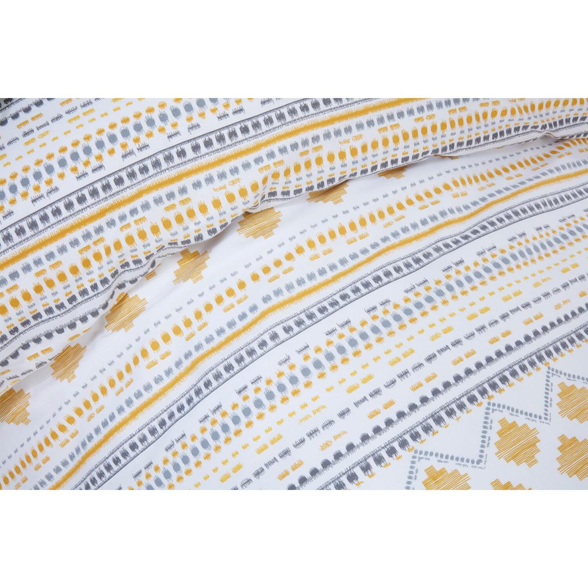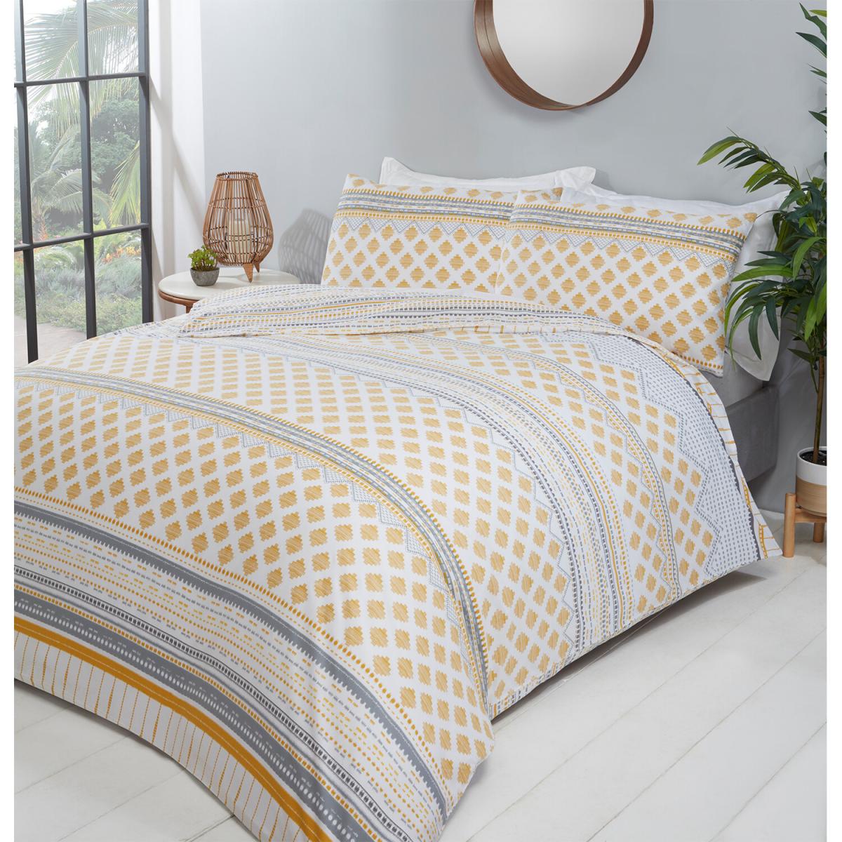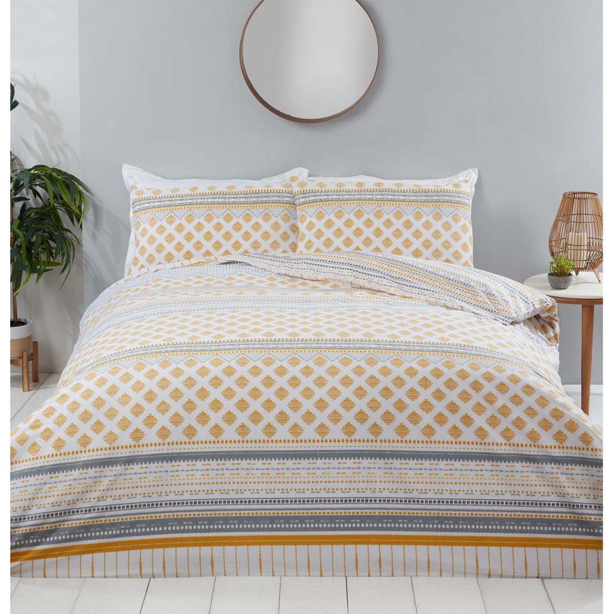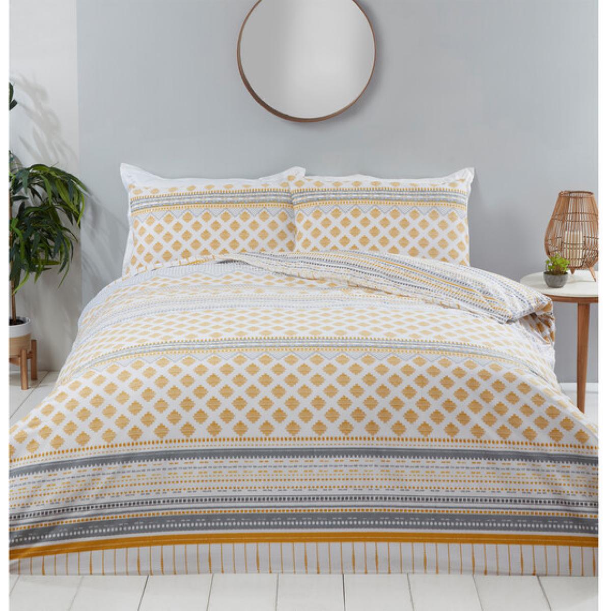 Add a fashionable and stylish element to your bedroom with this Samara Tribal Duvet Cover and Pillowcase Set. This tribal-inspired bedding set features a variety of stylish geometric patterns on one side and a dotted stripe design on the other. This bedding set is available in two colour tones, with ochre and grey for a bright, trendy vibe, or heather and grey for something a bit softer and full of charm.
