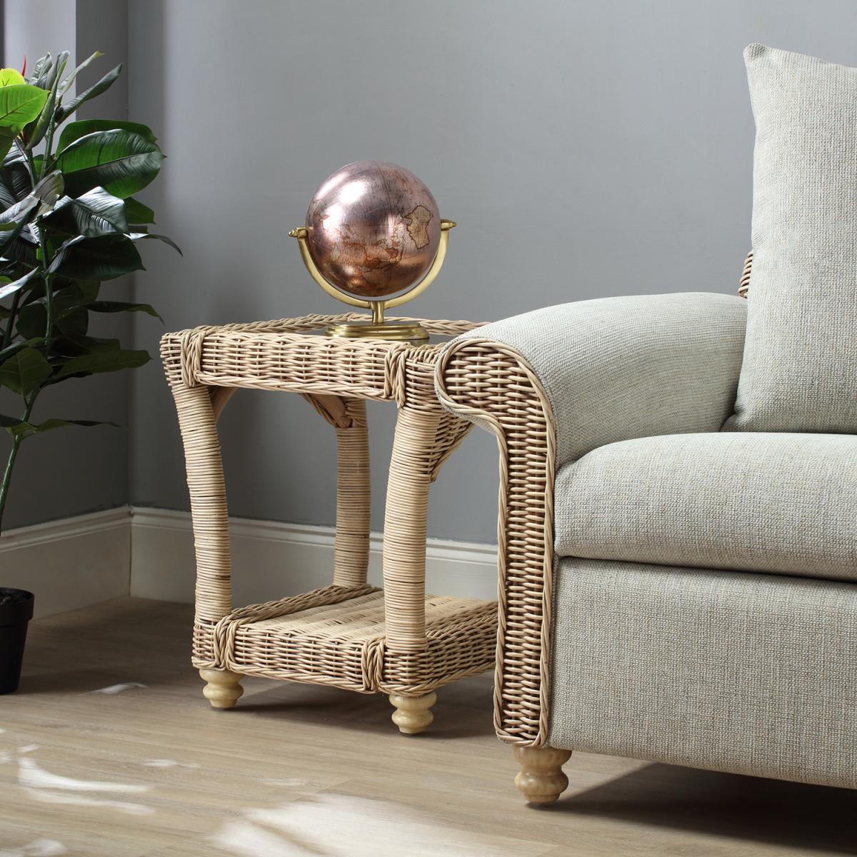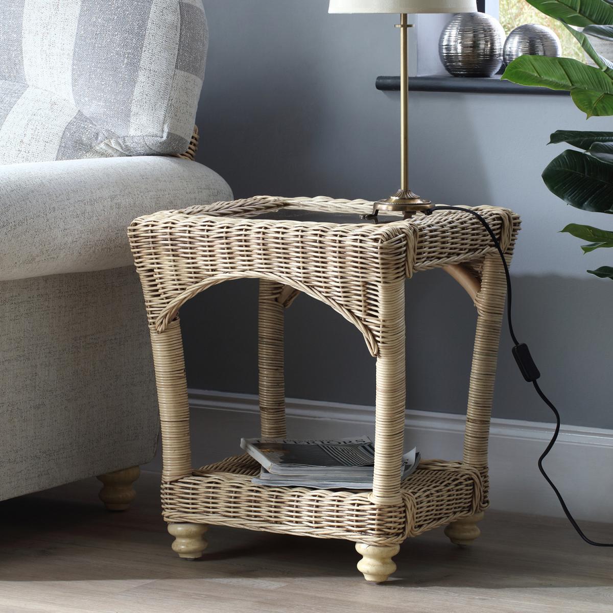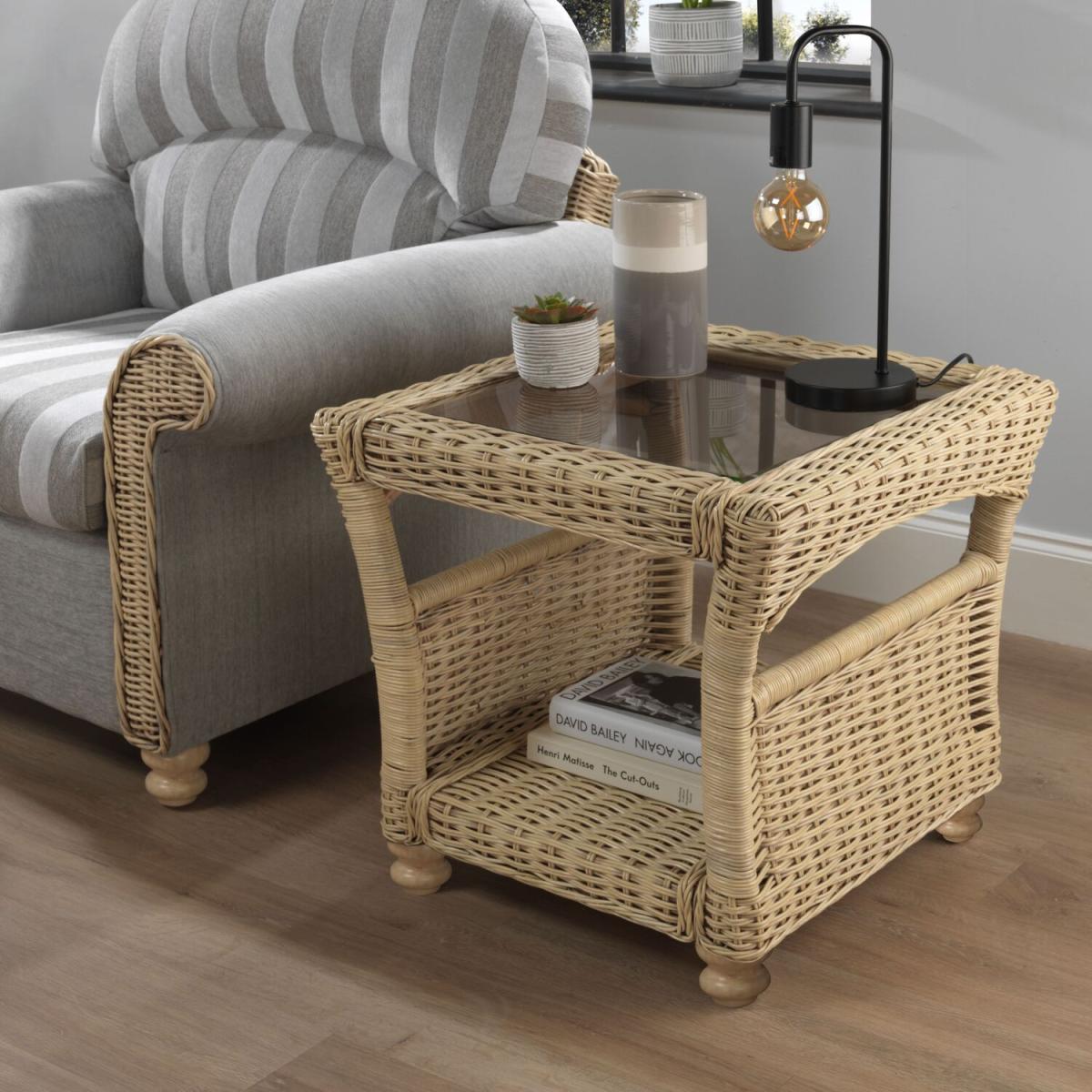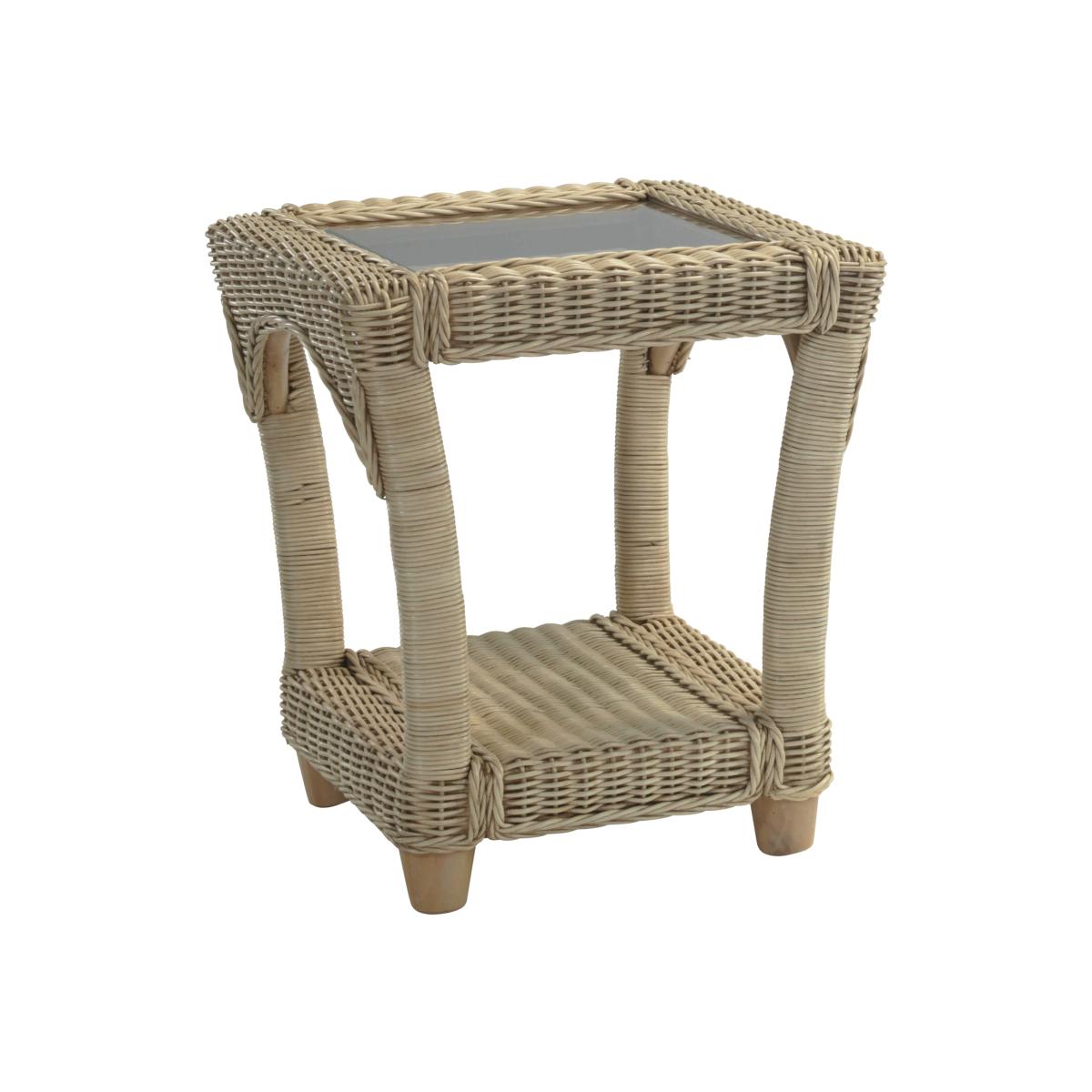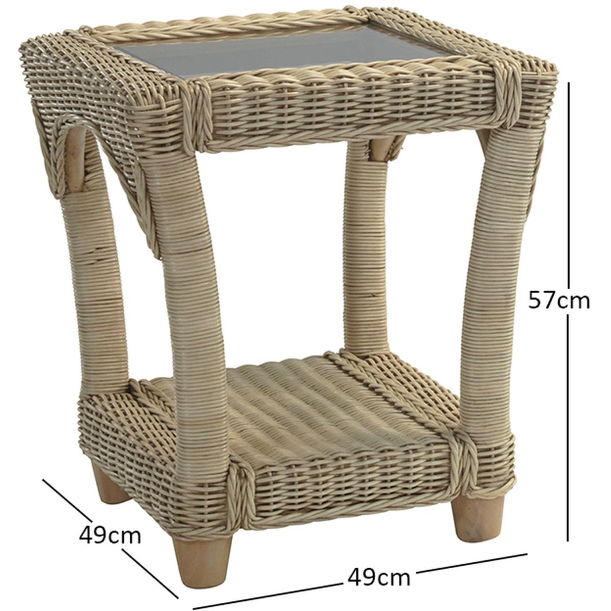 A sustainable natural rattan lamp table with 5mm toughened glass top and bottom shelf