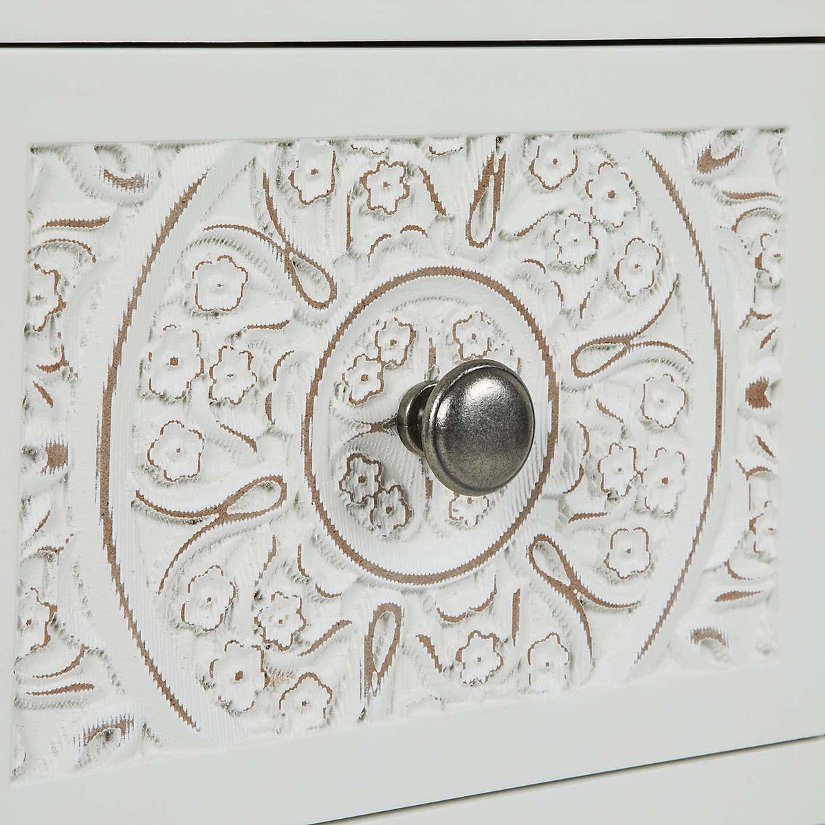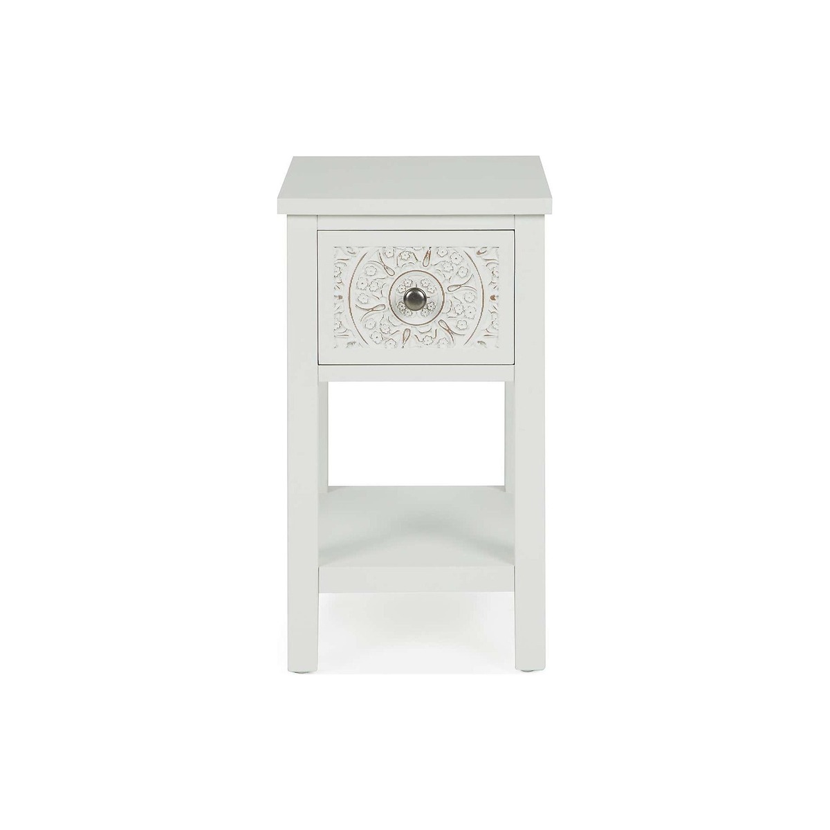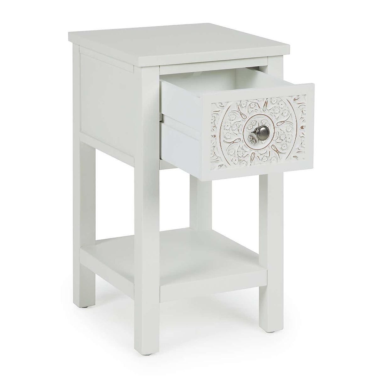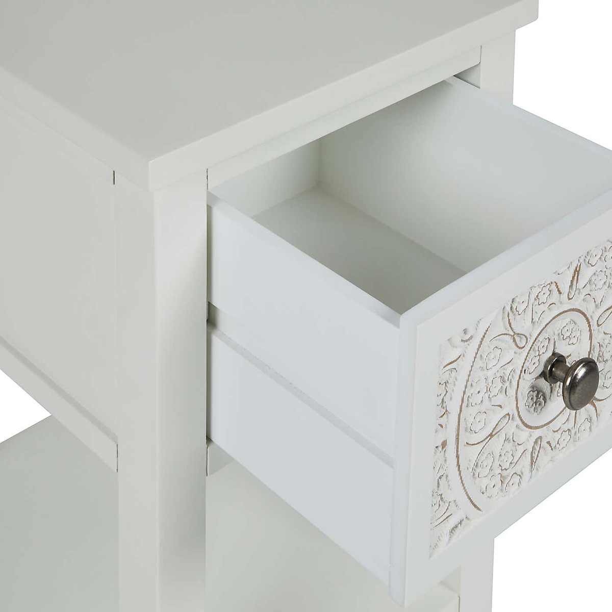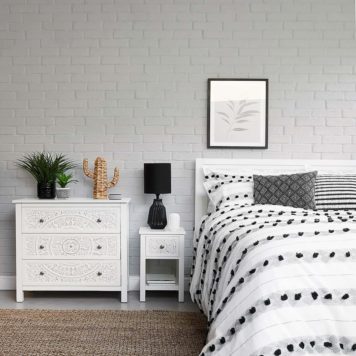 Dunelm Exclusive – Designed and Developed by Dunelm. Elegantly designed with a detailed carved out pattern front, the Samira range features a simple yet clean, structured finish. A contemporary style, the Samira range boasts a chunky, wooden design along with beautifully finished metal handles and a natural lacquered paint surface. Finished in a white colourway, the Samira Bedside Table boasts a compact, decorative design, whilst still offering plenty of storage space thanks to the single drawer and the open storage shelf. Care Instructions: Avoid prolonged exposure to direct sunlight. Wipe up spills immediately with a damp cloth, avoid common hazards such as harsh solvents or abrasives. Maintain with regular dusting. Clean metal fixtures with mild, soap and water, dry thoroughly. Do not use a brass cleaner as this will damage the lacquer. Item fully assembled.