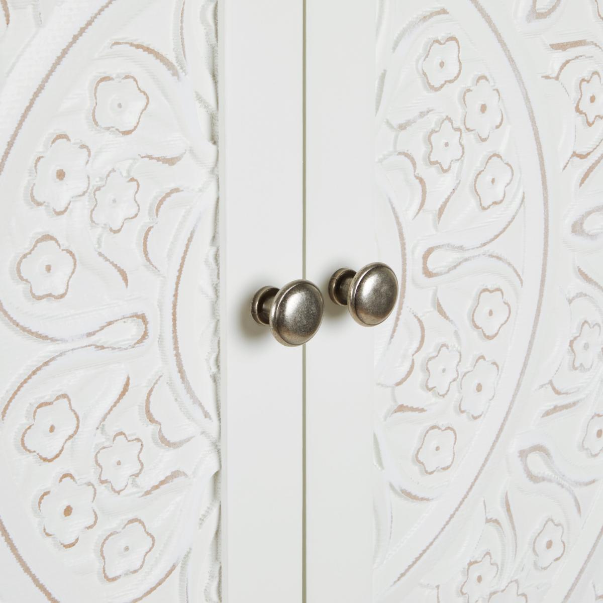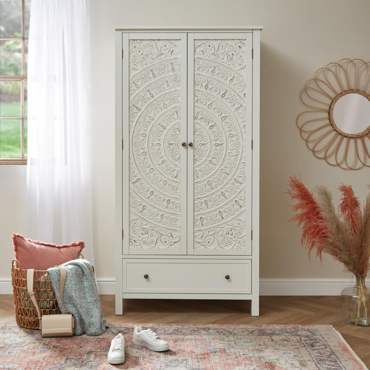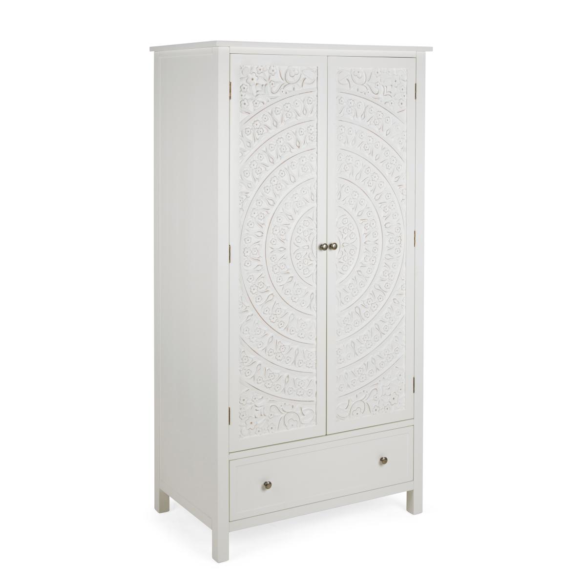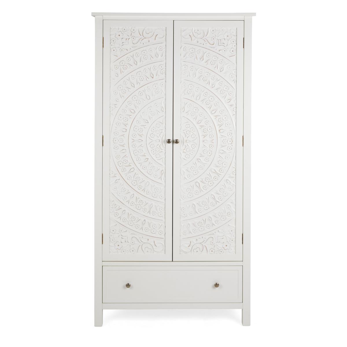 Dunelm Exclusive – Designed and Developed by Dunelm. The Samira White Double Wardrobe is a stunning piece to include in any bedroom. Featuring a delicately detailed, carved out wooden front, this wardrobe provides both style and practicality without compromising on either. This carved design is brought out with the stylish paint finish, which complements the beautifully finished brushed metal handles. Finished in a timeless white colourway, the Samira Double Wardrobe features a ample room to hang up your clothes and a drawer for extra storage space.