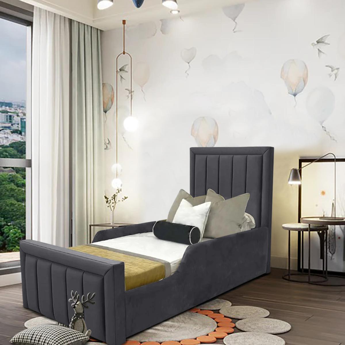 Sammy Kids Bed Plush Velvet with Safety Siderails - Steel / Double