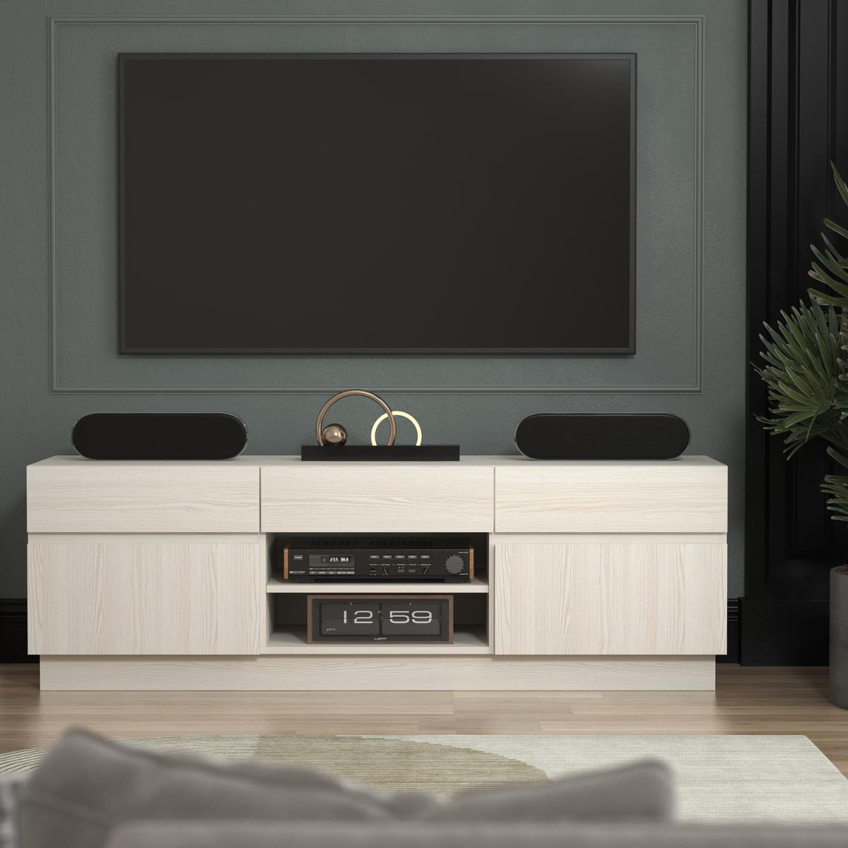 A TV stand with a simple design goes well with a variety of decor types and furnishes your living room with the perfect focal point. Divided into multiple sections, featuring an open shelf, two doors, and three drawers. It is possible to store game consoles, projectors, DVDs, books, pictures, decorations, and other items on the open shelf while maintaining an organized appearance. Your living room will look elegant and stylish with our Samford TV unit. Your room's atmosphere will brighten as a result. This TV unit is easy to clean and built to last for many years because of it's sturdy manufactured wood construction. You can have more stability and durability without sacrificing style with this TV unit With a simple yet elegant design that is aesthetically pleasing, it comes in a variety of colors to fit the decor of your house. Your house will feel neater and more lived in with our space-saving console. Place a plant, decorations, or your family photo on the tabletop. Instructions and all the parts are contained in one package. packed in an extremely safe box with foam and padded boards around it to prevent damage to your real TV furniture. Is assembling furniture a constant source of worry? You will receive comprehensive instructions to help you complete the installation.