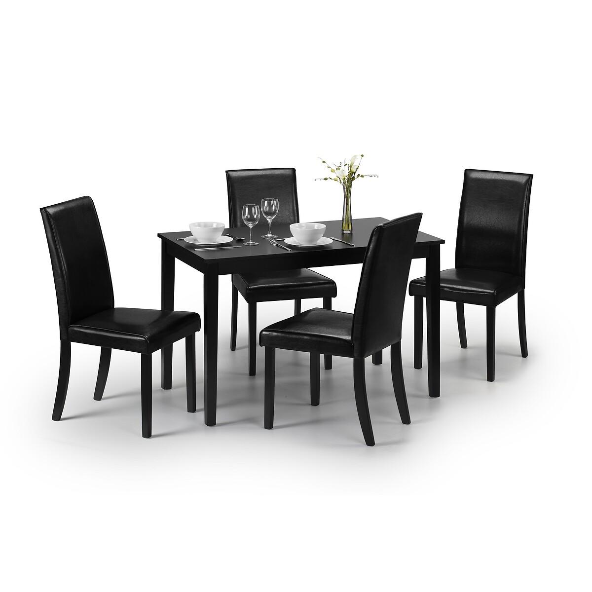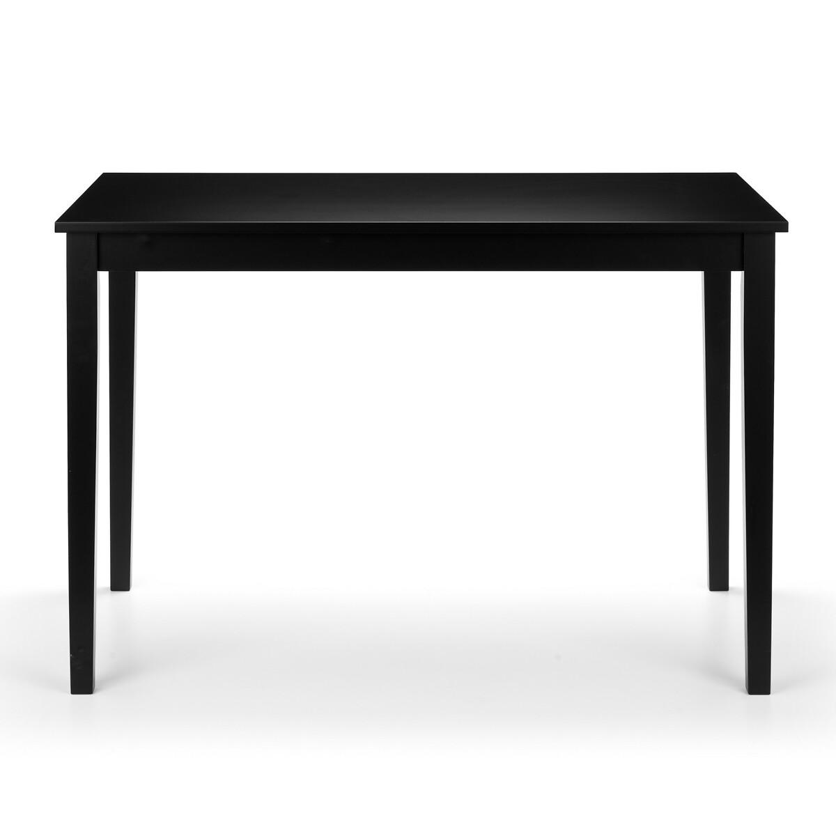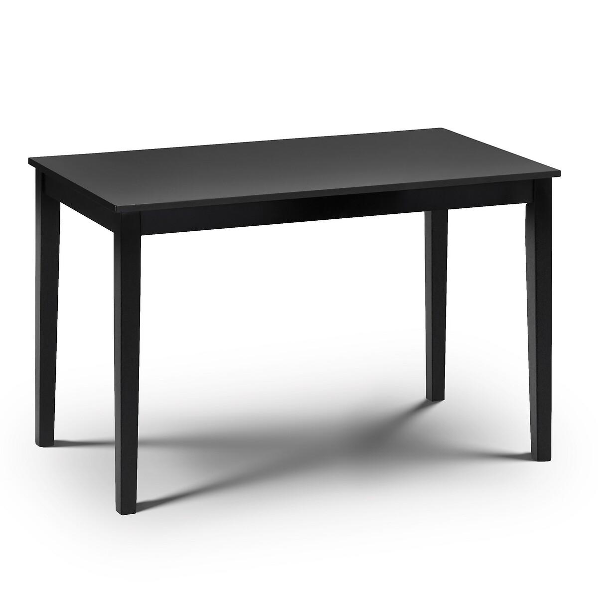 This lacquered particleboard and rubberwood dining table offers a simple, space saving design, meeting the requirements of the modern domestic home. Finished in a block black colour, allowing this dining table to coordinate with a wide range of décor. Product details• Sleek black finish• Space saving design• Full assembly required. Product Composition - 99% wood, 1% metal. Product Dimensions - 114 cm x65 cm x75 cm , Weight - 15.5 KG• Minimum Length: 114 cm• Maximum Length:114 cm• With extension: 4 seater Package Dimensions - 123 cm x 73 cm x 12 cm, Weight -17.6 KGThis product will be dispatched by one of our trusted suppliers. You’ll be contacted by their selected courier about your delivery. Please note: this product cannot be delivered to all Offshore Islands, Northern Ireland or Republic of Ireland. JULIA01