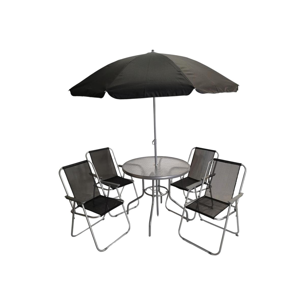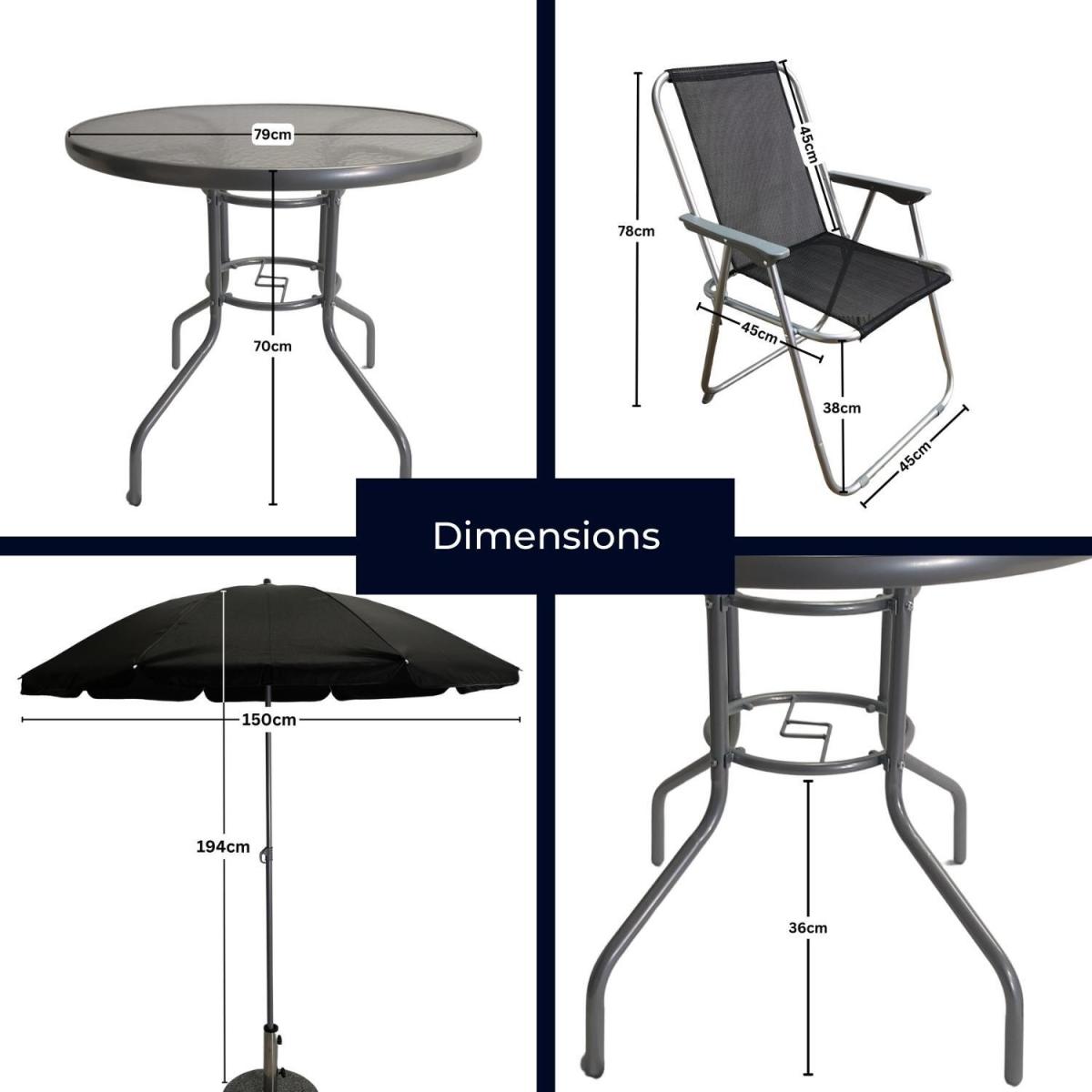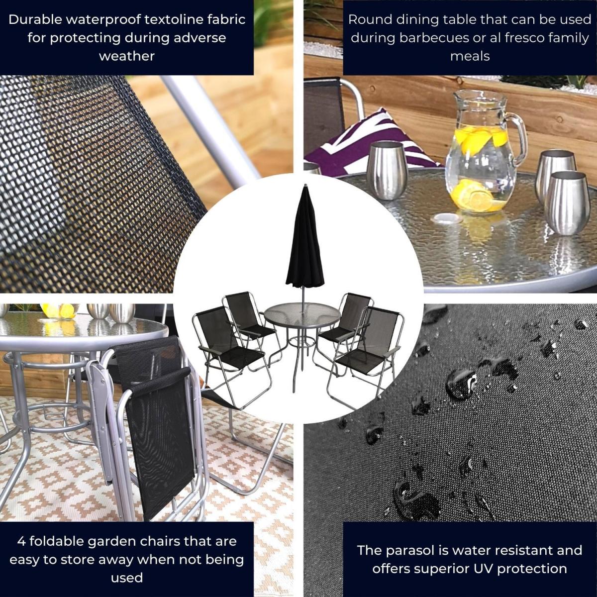 Transform your outdoor space into a comfortable and stylish dining area with the Samuel Alexander 4 Seater Garden Table and Chairs Set. This patio furniture set includes a bistro table with a glass tabletop, 4 folding garden chairs, and a black parasol umbrella to provide shade on sunny days. The table and chairs are made with a sturdy and durable frame, and the chairs can support up to 100kg. The table measures 80x80x71cm, providing ample space for four people to dine or relax. The chairs measure 53x58x76cm and are designed to be folded for easy storage when not in use. The black parasol umbrella has a size of 150x200cm and offers excellent protection from the sun's harmful rays, allowing you to enjoy your outdoor space for longer periods. The set's outdoor garden parasol is perfect for those lazy afternoons with family and friends, whether you're entertaining guests or enjoying a quiet moment. The 4 Seater Garden Table and Chairs Set is an excellent choice for anyone looking to create a comfortable and stylish outdoor dining area. With its high-quality construction, easy-to-store folding chairs, and elegant black parasol, this outdoor furniture set is the perfect addition to any garden or patio. Our Samuel Alexander 4 person round glass dining table table and folding chair patio set is a high-quality piece of garden furniture, offering style, comfort, and durability. It comes with a bistro table, 4 foldable chairs, a black parasol umbrella, and a glass tabletop. Its compact design and folding chairs make it easy to store when not in use.