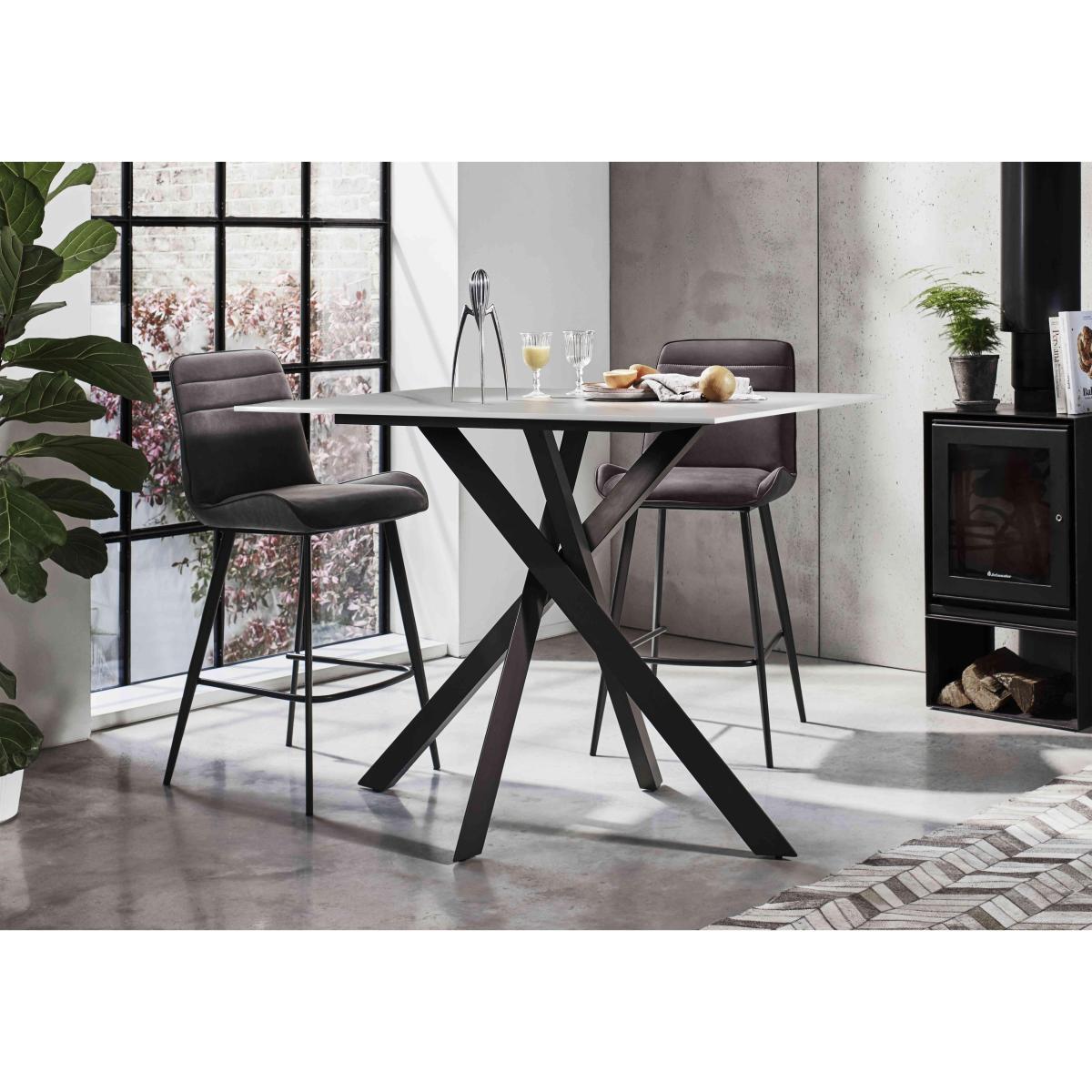 Bold and modern, the Samurai collection combines textures and finishes to eye-catching effect. Table tops are made of sturdy granite-look tempered glass, both practical and stylish. Bases are asymmetric in design, crafted from grey powder-coated metal. The range includes a large extending dining table with an innovative extension mechanism that sees the extra leaf smoothly slide into place in seconds, comfortable dining chairs in a choice of upholstery, dining sets, occasional tables and storage pieces. With its creative design and striking aesthetic, the Samurai collection makes it easy to bring home cool contemporary style. Bar table dining doesn’t have to be casual as this fabulous bar table set demonstrates. The table has a white sintered stone top, and the pair of bar stools are upholstered in velvet and faux leather. Why you'll love it. This bar table with white stone top and velvet bar stools set is so sophisticated. Well-crafted modern style. Bar table’s white sintered stone top is absolutely stunning and very hardwearing. Unique asymmetric base design in graphite grey powder-coated metal. With 2 cushioned bar stools. Two-tone upholstery in velvet, in a choice of colours, and dark grey faux leather. Simple linear stitching detail. Comfortable and supportive backs. Slender angled powder-coated metal legs with footrest in graphite grey. This bar table with white stone top and bar stool set is part of the Samurai range. What you need to know. Bar table seats 4. Metal base. Table top is made from sintered stone, which is created using natural stone. Top is coated with glass and may show light surface scratches with use. Use placemats and coasters at all times to protect the surface. Mop spills quickly, and avoid abrasive cloths and cleaning materials. Bar stool seat cushioning is made of foam.