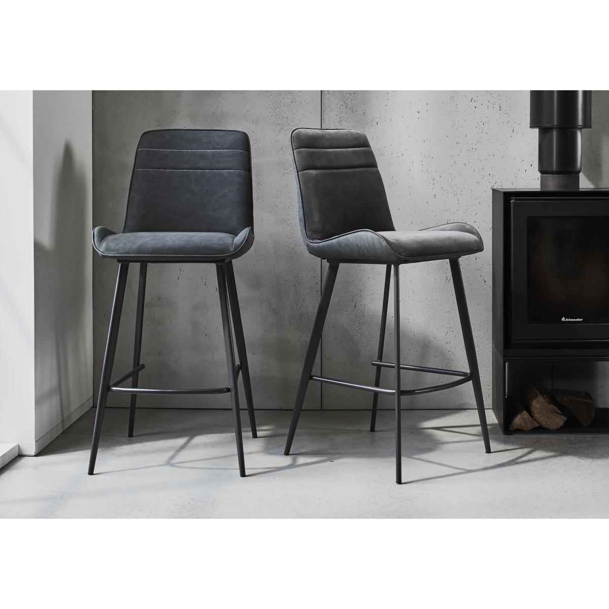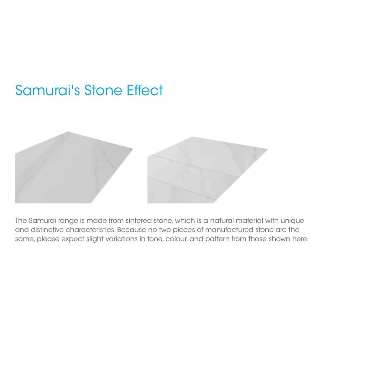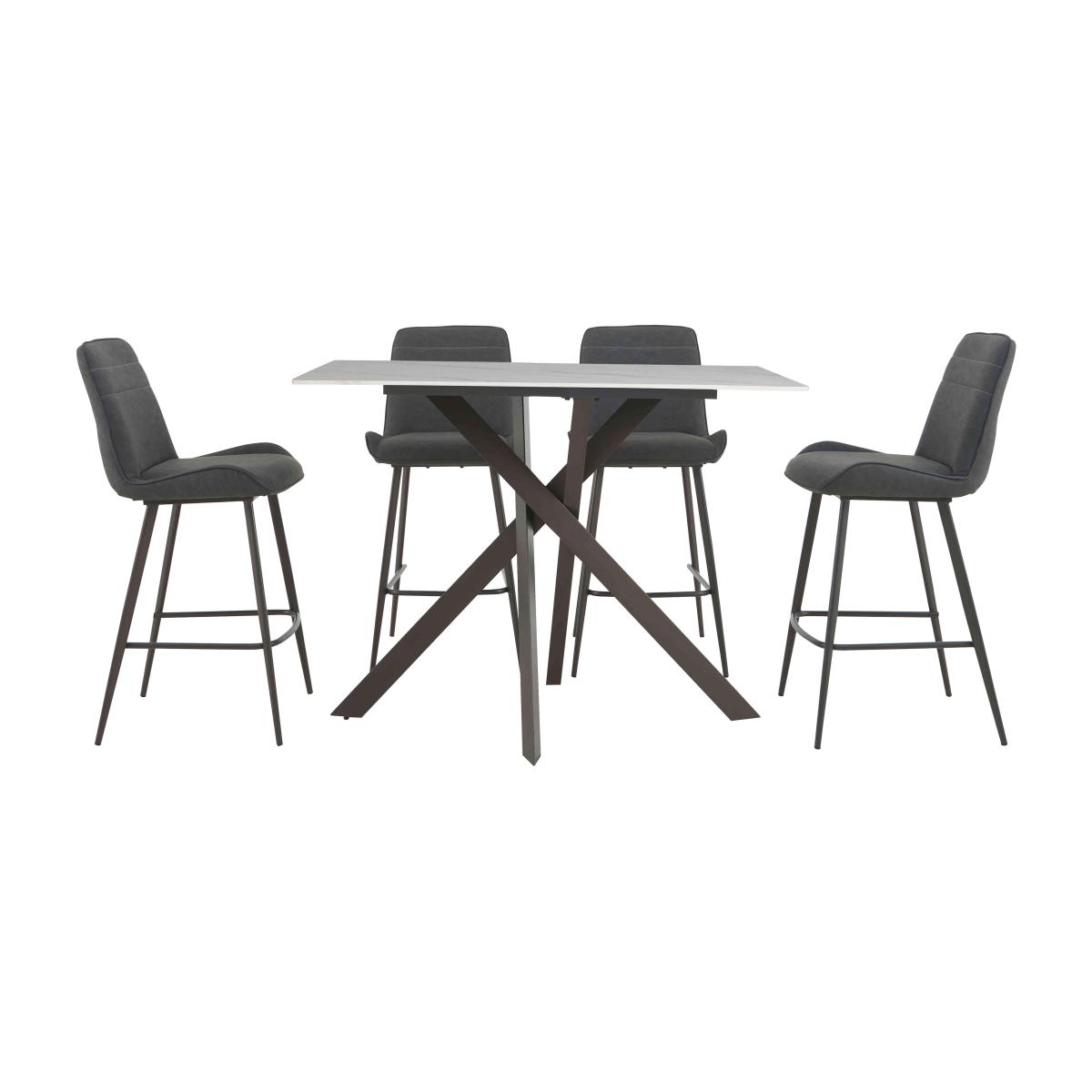 Bold and modern, the Samurai collection combines textures and finishes to eye-catching effect. Table tops are made of sturdy granite-look tempered glass, both practical and stylish. Bases are asymmetric in design, crafted from grey powder-coated metal. The range includes a large extending dining table with an innovative extension mechanism that sees the extra leaf smoothly slide into place in seconds, comfortable dining chairs in a choice of upholstery, dining sets, occasional tables and storage pieces. With its creative design and striking aesthetic, the Samurai collection makes it easy to bring home cool contemporary style. Bar table dining just got more stylish – much more stylish. The bar table in this set has a fabulous white sintered stone top and is paired with four elegant faux leather bar stools. Why you'll love it. Sophisticated bar table with white stone top and bar stools set elevates any kitchen corner. Well-crafted modern style. Bar table’s white sintered stone top is absolutely stunning and very hardwearing. Unique asymmetric base design in graphite grey powder-coated metal. With 4 cushioned bar stools. Fully upholstered in dark grey faux leather with simple linear stitching detail. Comfortable and supportive backs. Slender angled powder-coated metal legs with footrest in graphite grey. This bar table with white stone top and bar stool set is part of the Samurai range. What you need to know. Bar table seats 4. Metal base. Table top is made from sintered stone, which is created using natural stone. Top is coated with glass and may show light surface scratches with use. Use placemats and coasters at all times to protect the surface. Mop spills quickly, and avoid abrasive cloths and cleaning materials. Bar stool seat cushioning is made of foam.