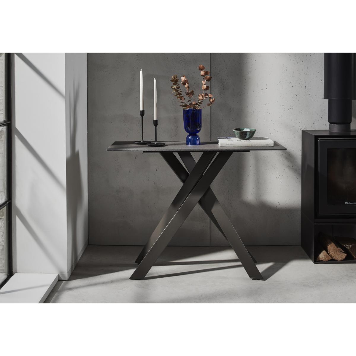 Bold and modern, the Samurai collection combines textures and finishes to eye-catching effect. Table tops are made of sturdy granite-look tempered glass, both practical and stylish. Bases are asymmetric in design, crafted from grey powder-coated metal. The range includes a large extending dining table with an innovative extension mechanism that sees the extra leaf smoothly slide into place in seconds, comfortable dining chairs in a choice of upholstery, dining sets, occasional tables and storage pieces. With its creative design and striking aesthetic, the Samurai collection makes it easy to bring home cool contemporary style. Creative modern design meets living room functionality in this very cool console table, part of our Samurai collection. We love the combo of granite-effect glass top and powder-coated metal base. Why you'll love it. Innovative coffee table makes a bold statement. Well-crafted modern style. Striking granite-effect tempered glass top. Unique asymmetric base design in graphite grey powder-coated metal. Complete the look with the Samurai coffee table and lamp table. What you need to know. Made from metal and glass. Glass-topped table may show light surface scratches with use. Use coasters at all times to protect the surface. Mop spills quickly, and avoid abrasive cloths and cleaning materials. Part of the Samurai collection of striking furniture for living and dining rooms. Warning!. Furniture can tip over unexpectedly and cause injury. This item should be fixed to a wall using the anti-tip kit provided with the furniture. Be sure to use the correct wall fixings suitable for the walls in your home.