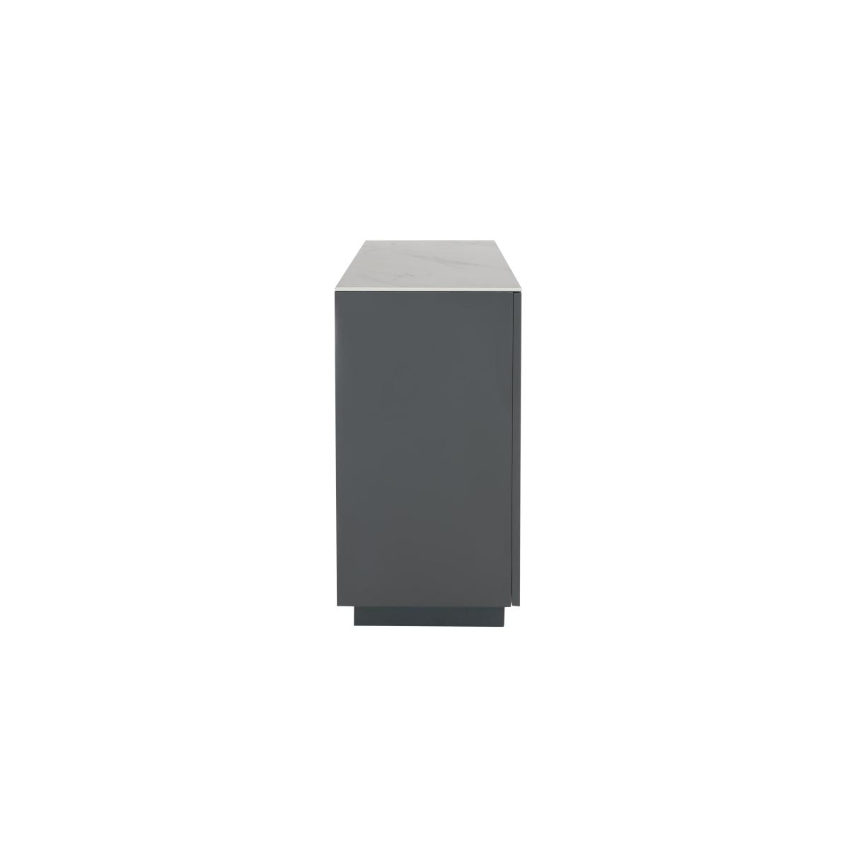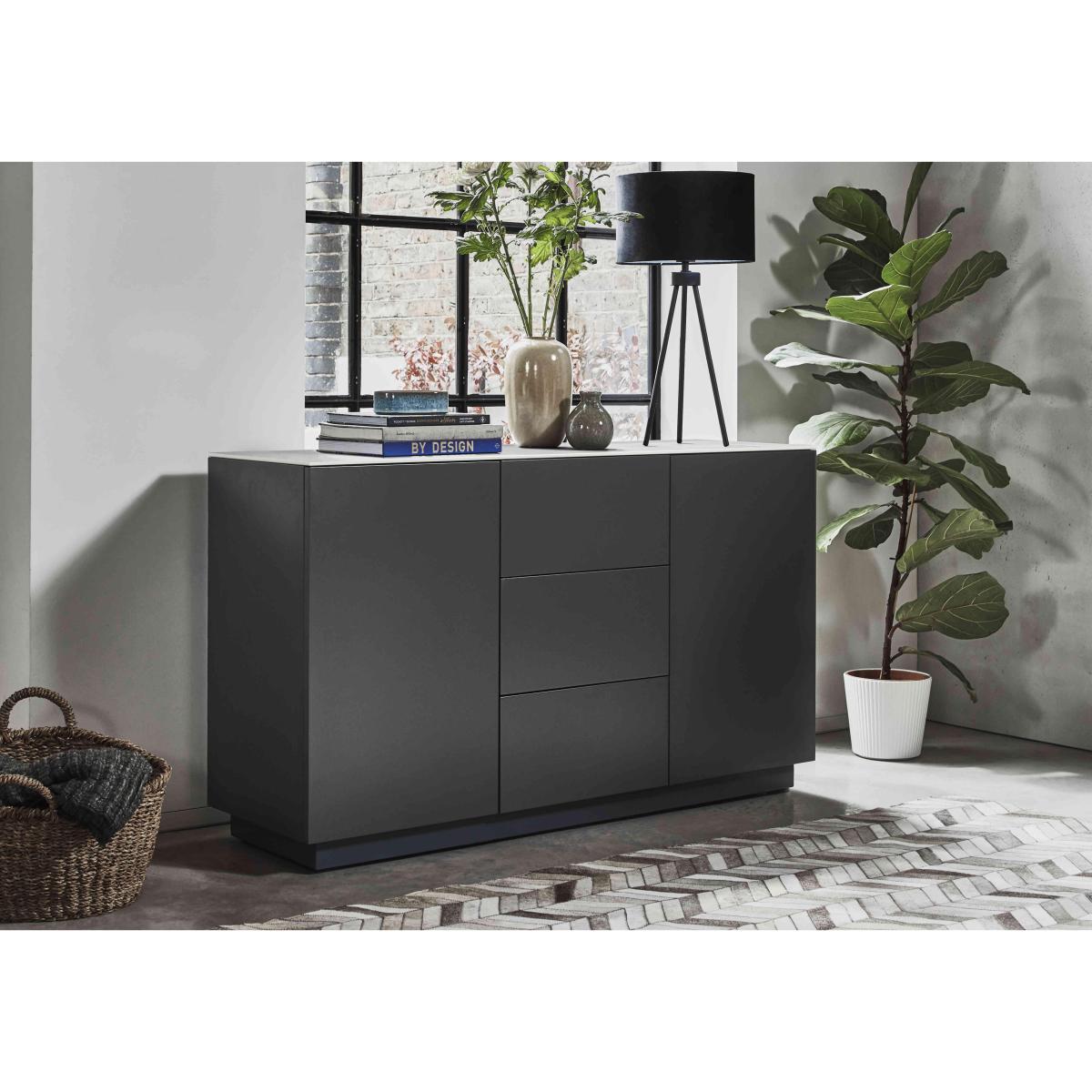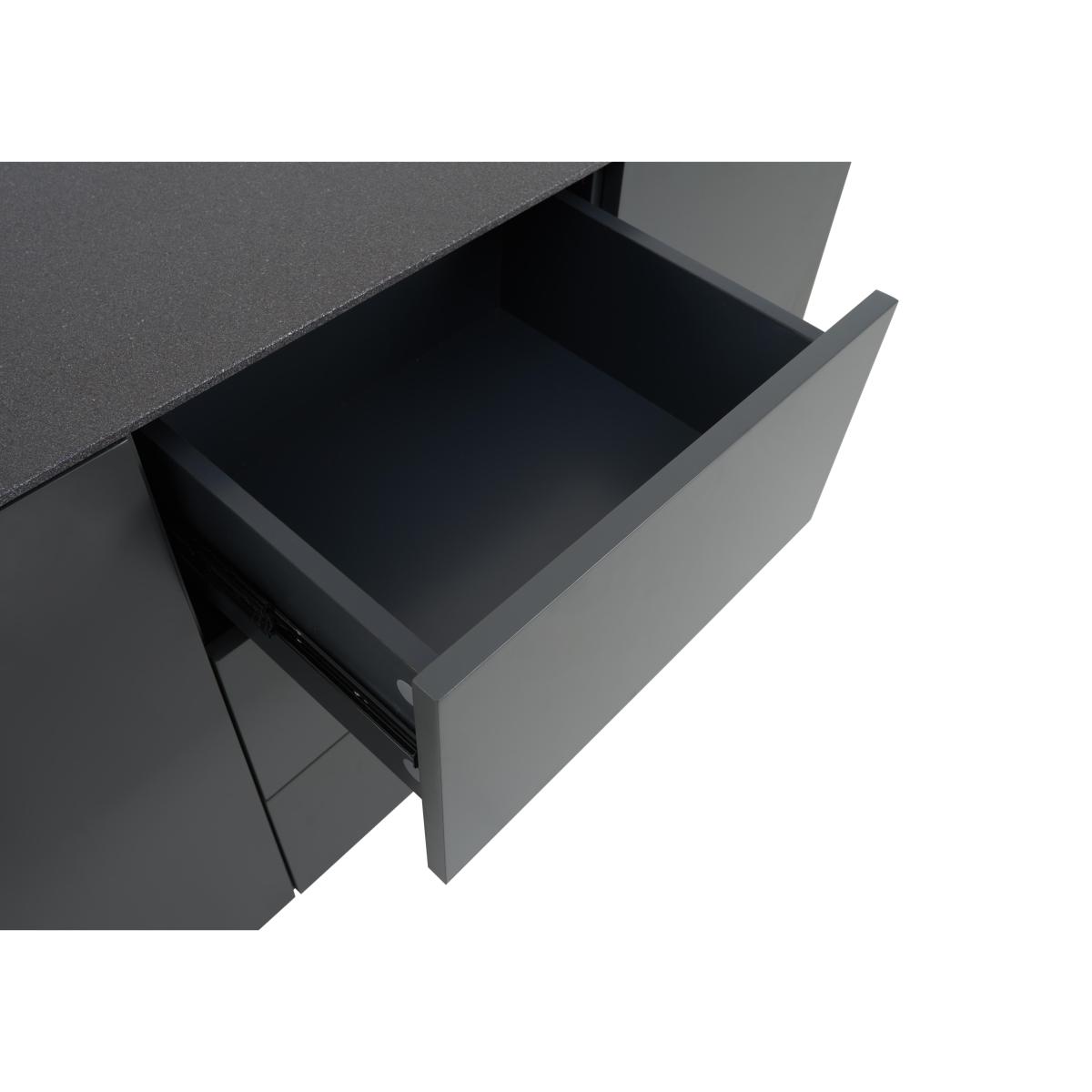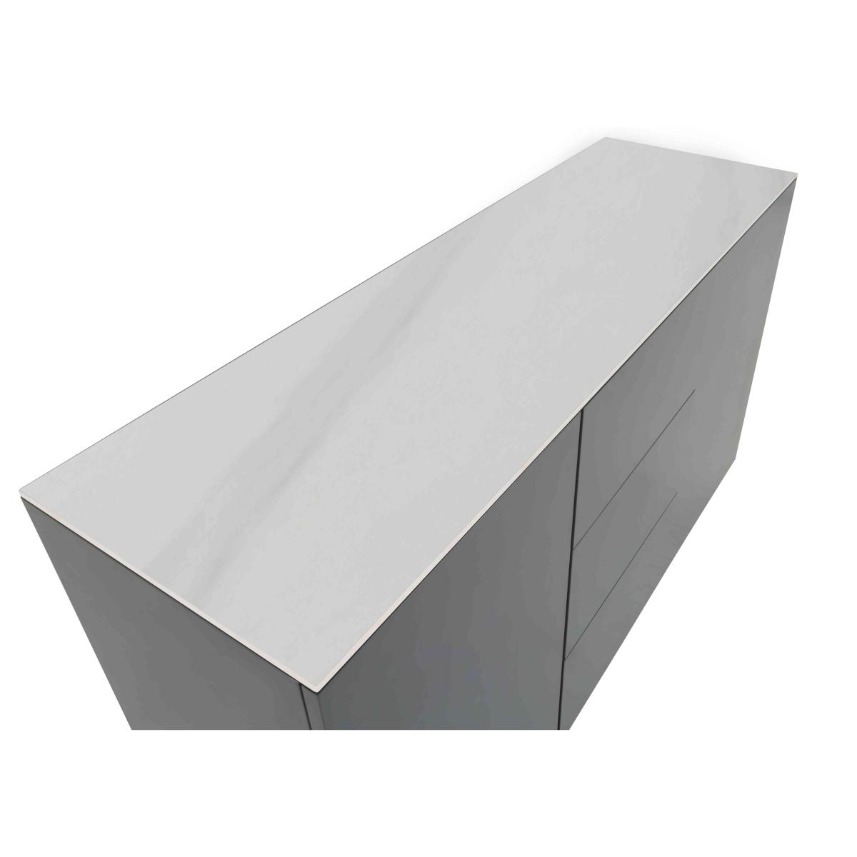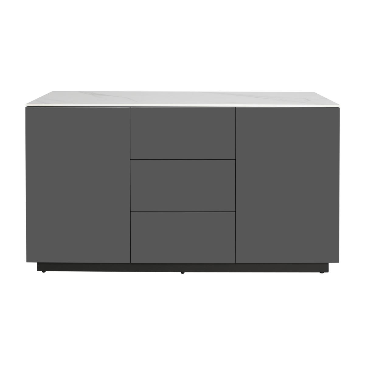 Bold and modern, the Samurai collection combines textures and finishes to eye-catching effect. Table tops are made of sturdy granite-look tempered glass, both practical and stylish. Bases are asymmetric in design, crafted from grey powder-coated metal. The range includes a large extending dining table with an innovative extension mechanism that sees the extra leaf smoothly slide into place in seconds, comfortable dining chairs in a choice of upholstery, dining sets, occasional tables and storage pieces. With its creative design and striking aesthetic, the Samurai collection makes it easy to bring home cool contemporary style. This large sideboard combines two on-trend finishes – white stone top and satin grey frame – to fabulous effect. And with two cupboards and three drawers, it doesn’t lack storage space. Why you'll love it. Large sideboard with white stone top delivers plenty of storage – and plenty of style. Well-crafted and modern. White sintered stone top is absolutely stunning and very hardwearing. Sleek satin grey frame. Cupboard and drawer arrangement offers roomy storage. This large sideboard with white stone top is part of the Samurai range. What you need to know. 2 cupboards each with an adjustable shelf. 3 drawers. Drawers and cupboard doors are soft-closing. Sideboard top is made from sintered stone, which is created using natural stone. Top is coated with glass and may show light surface scratches with use. Use placemats and coasters at all times to protect the surface. Mop spills quickly, and avoid abrasive cloths and cleaning materials. Warning!. Furniture can tip over unexpectedly and cause injury. This item should be fixed to a wall using the anti-tip kit provided with the furniture. Be sure to use the correct wall fixings suitable for the walls in your home.