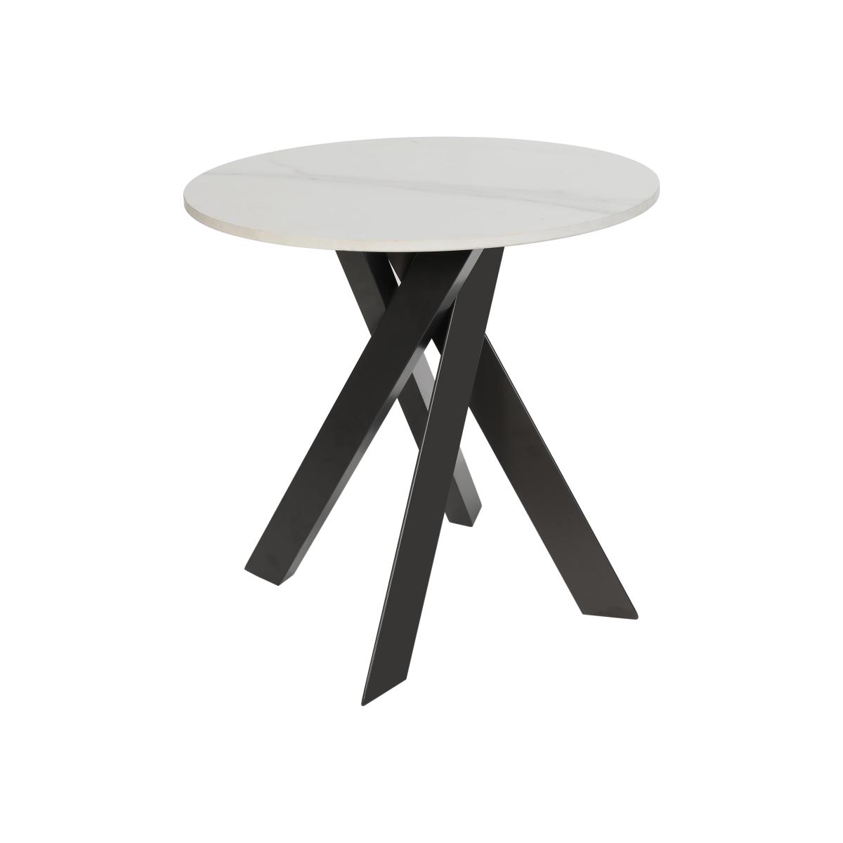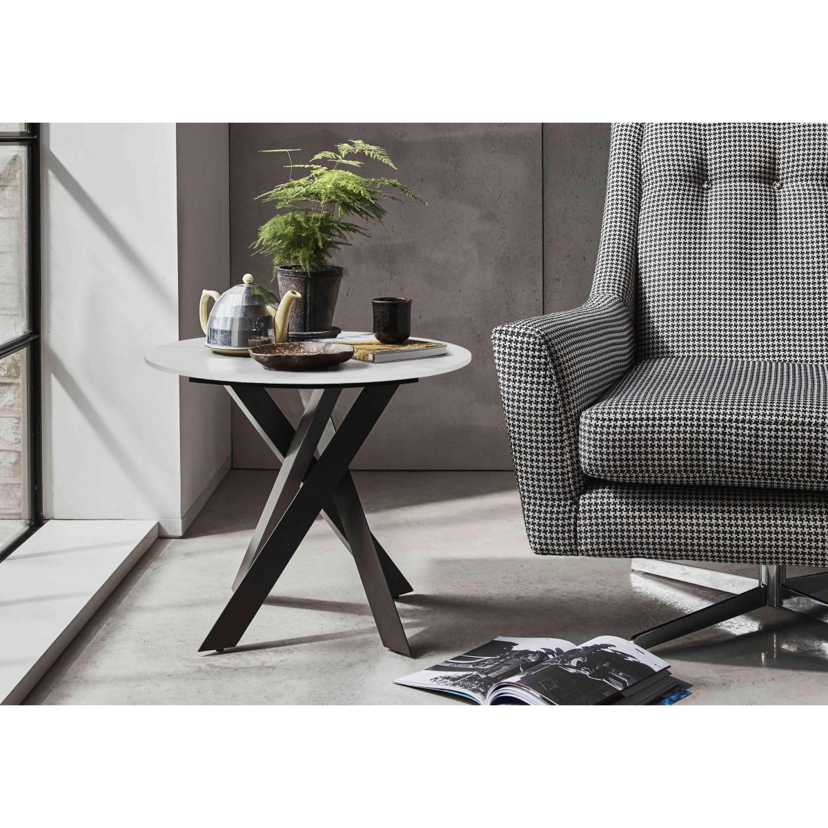 Bold and modern, the Samurai collection combines textures and finishes to eye-catching effect. Table tops are made of sturdy granite-look tempered glass, both practical and stylish. Bases are asymmetric in design, crafted from grey powder-coated metal. The range includes a large extending dining table with an innovative extension mechanism that sees the extra leaf smoothly slide into place in seconds, comfortable dining chairs in a choice of upholstery, dining sets, occasional tables and storage pieces. With its creative design and striking aesthetic, the Samurai collection makes it easy to bring home cool contemporary style. Even a small occasional table can pack a style punch as this round lamp table with white stone top so ably demonstrates. We love that bold grey metal asymmetric base too. Why you'll love it. Round lamp table with white stone top may be small but it’s perfectly formed. Well-crafted modern style. White sintered stone top is absolutely stunning and very hardwearing. Unique asymmetric base design in graphite grey powder-coated metal. This round lamp table with white stone top is part of the Samurai range. What you need to know. Metal base. Table top is made from sintered stone, which is created using natural stone. Top is coated with glass and may show light surface scratches with use. Use placemats and coasters at all times to protect the surface. Mop spills quickly, and avoid abrasive cloths and cleaning materials. Pairs with the Samurai coffee table and console table.