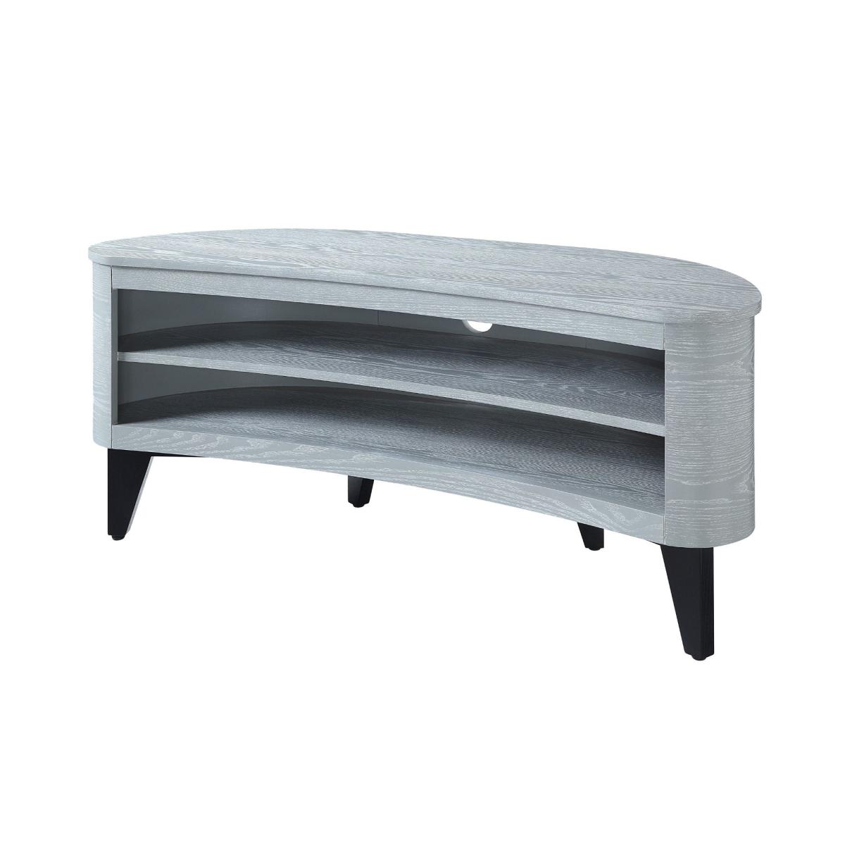 I’m a fan of this grey corner TV unit because its curved front and slender, dark-tapered legs give it a subtle mid-century vibe without dominating the room. It slots neatly into contemporary, Scandi or pared-back interiors, making the most of awkward corners while keeping sightlines clean. To style it, hide wires behind the back panel and tuck your games console or streaming box on the lower shelf. Use uniform baskets or decorative boxes on the middle shelf for remotes and cables. A small potted plant or sculptural vase on one side of the top surface balances your screen, while a stack of art or design books on the other adds personality without clutter.