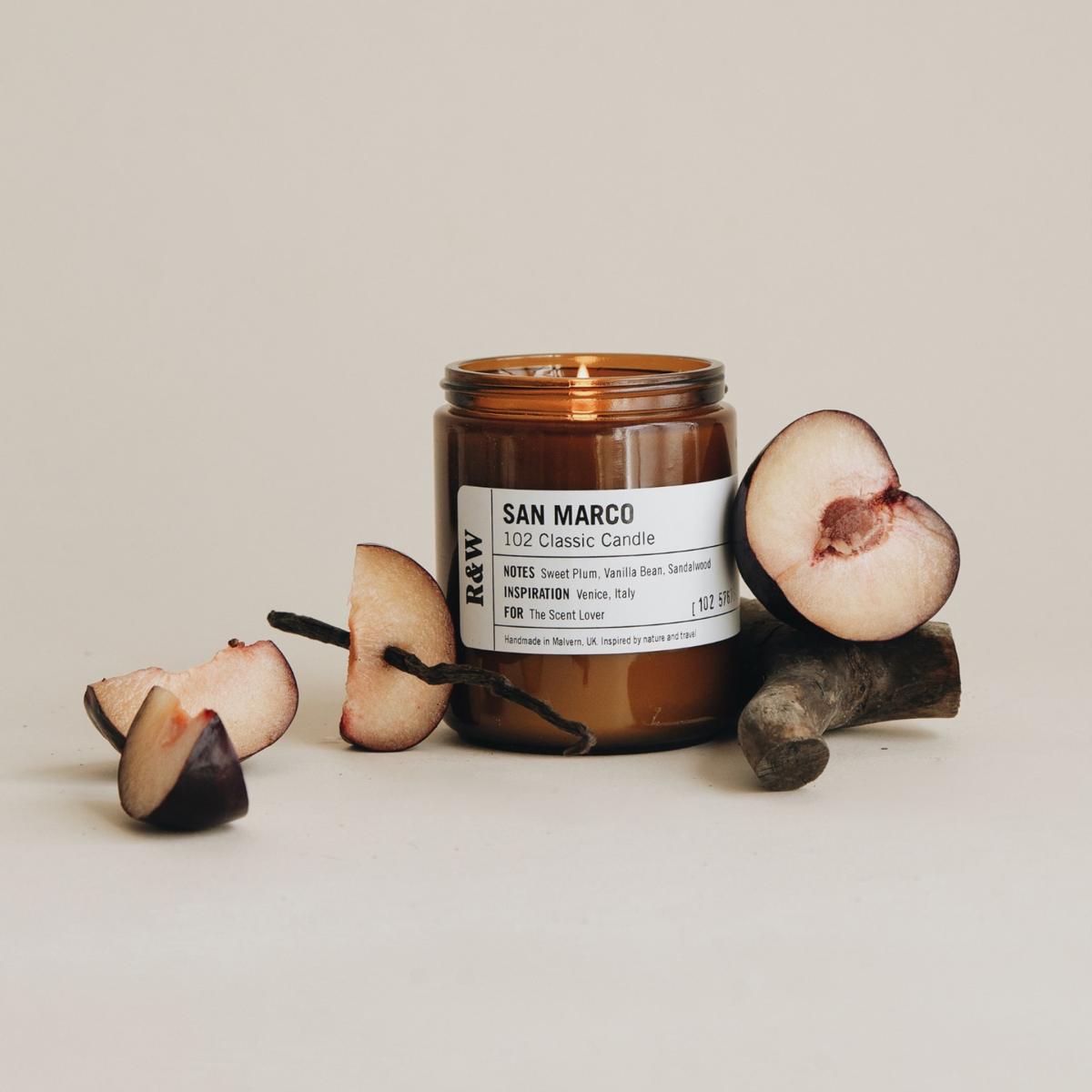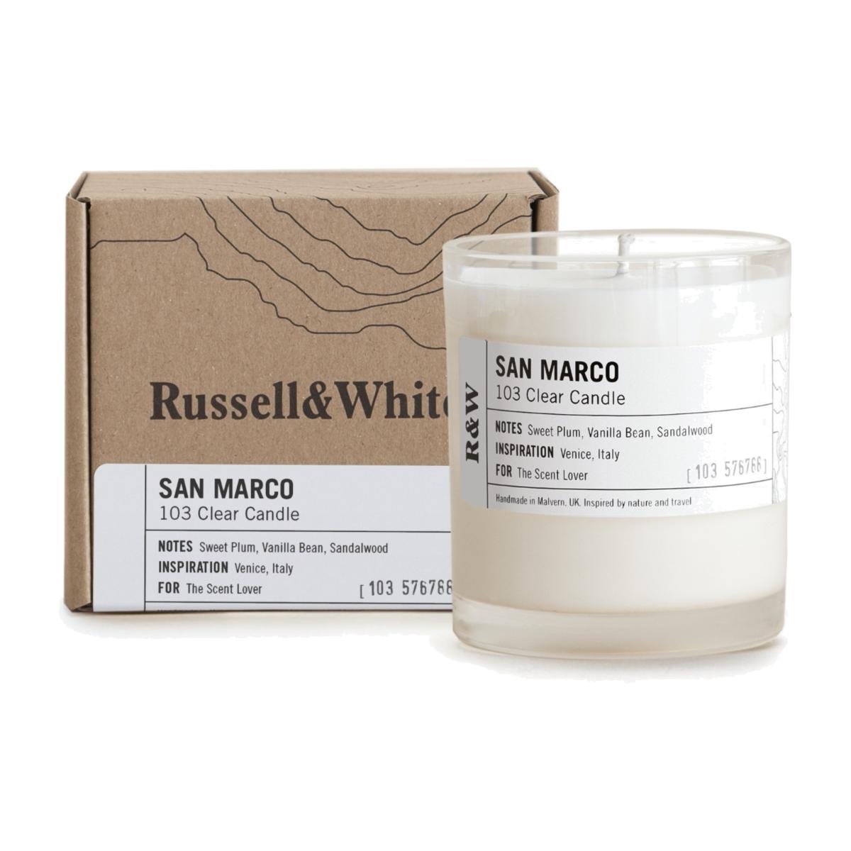 Reminiscent of the affluent city of Venice, this blend takes inspiration from the cities timeless and historic culture. Velvety notes of sweet plum and vanilla bean are rounded off with a deep undertone of sandalwood. Our clear candle fits all occasions and fragrances every type of room or space. Made using 100% soy wax and set in a clear glass jar with a single cotton/linen mix wick. Enclosed within a signature Russell & White box, inspired by the hills in our hometown of Malvern.