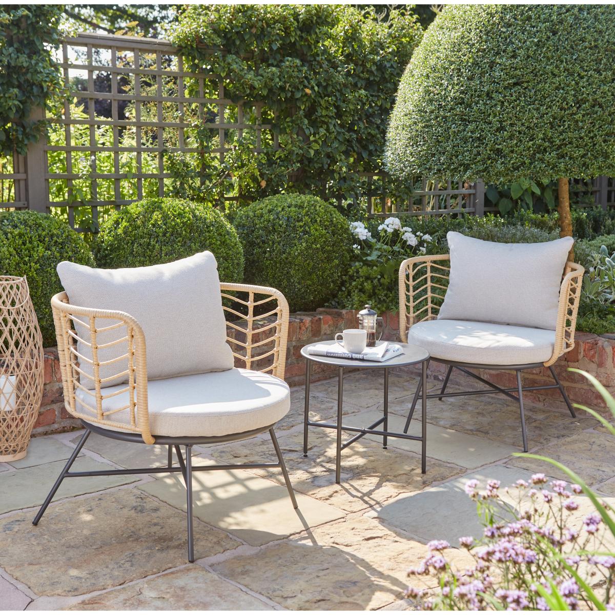 Introducing the San Marino Bistro Set with a Natural colourway, perfect for relaxing in the sun this summer. Beautifully designed with a unique rattan structure and a steel powder coated frame, paired with a powder coated steel table. The chairs come complete with padded seat and backrest cushions for a comfortable sit. This modern bistro set will make a stylish addition in any outdoor garden space.