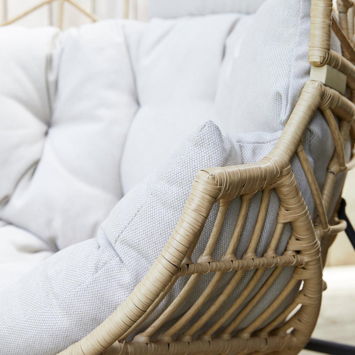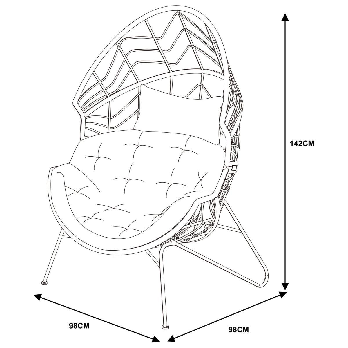 Perfect for adding a cosy and relaxed feel to your garden, this beautiful San Marino pod chair is comfortable and stylish. Boasting a rattan finish, this chair would compliment any garden or outdoor space beautifully. This chair is also available in black. The large cushion and head cushion are included however the patterned cushion is not included.