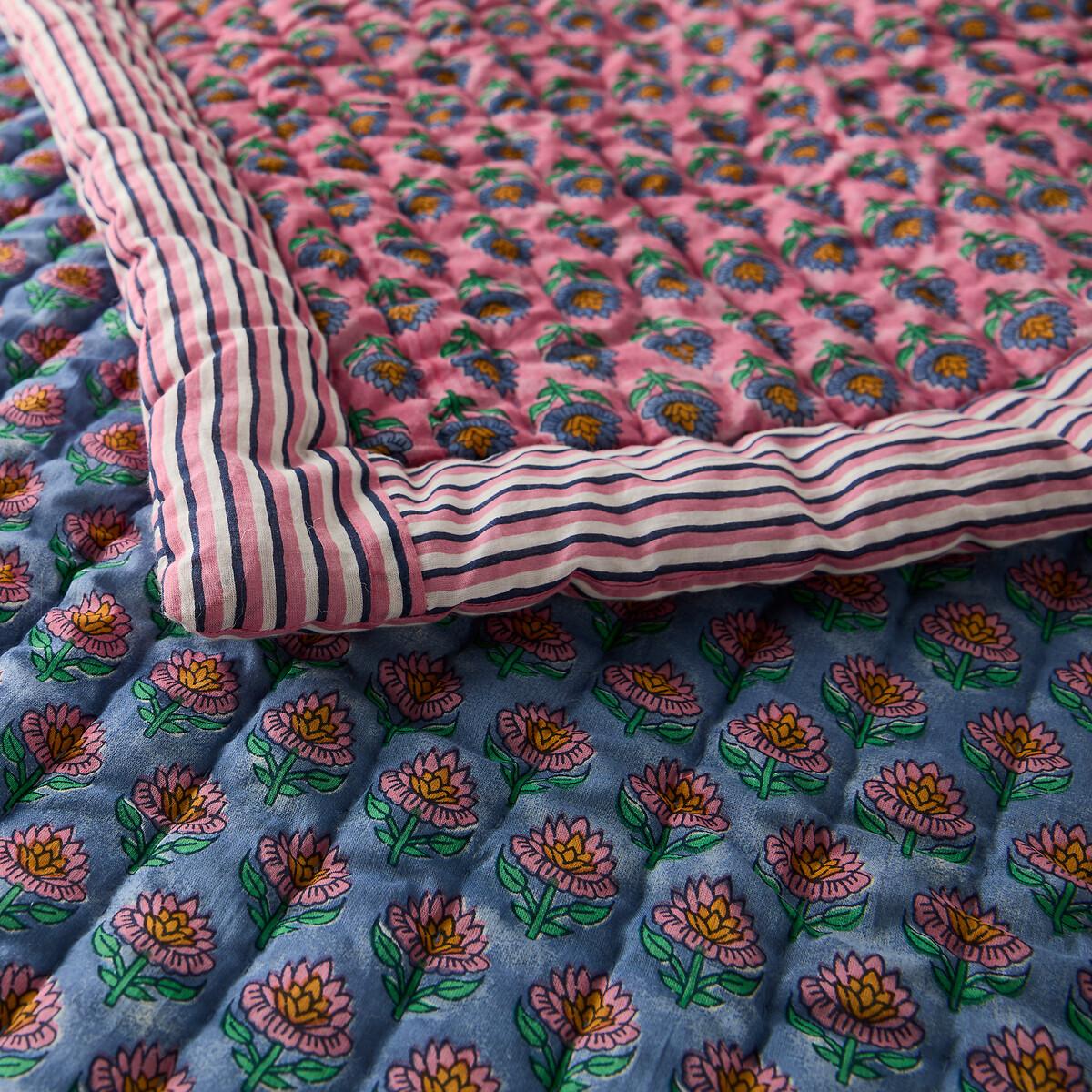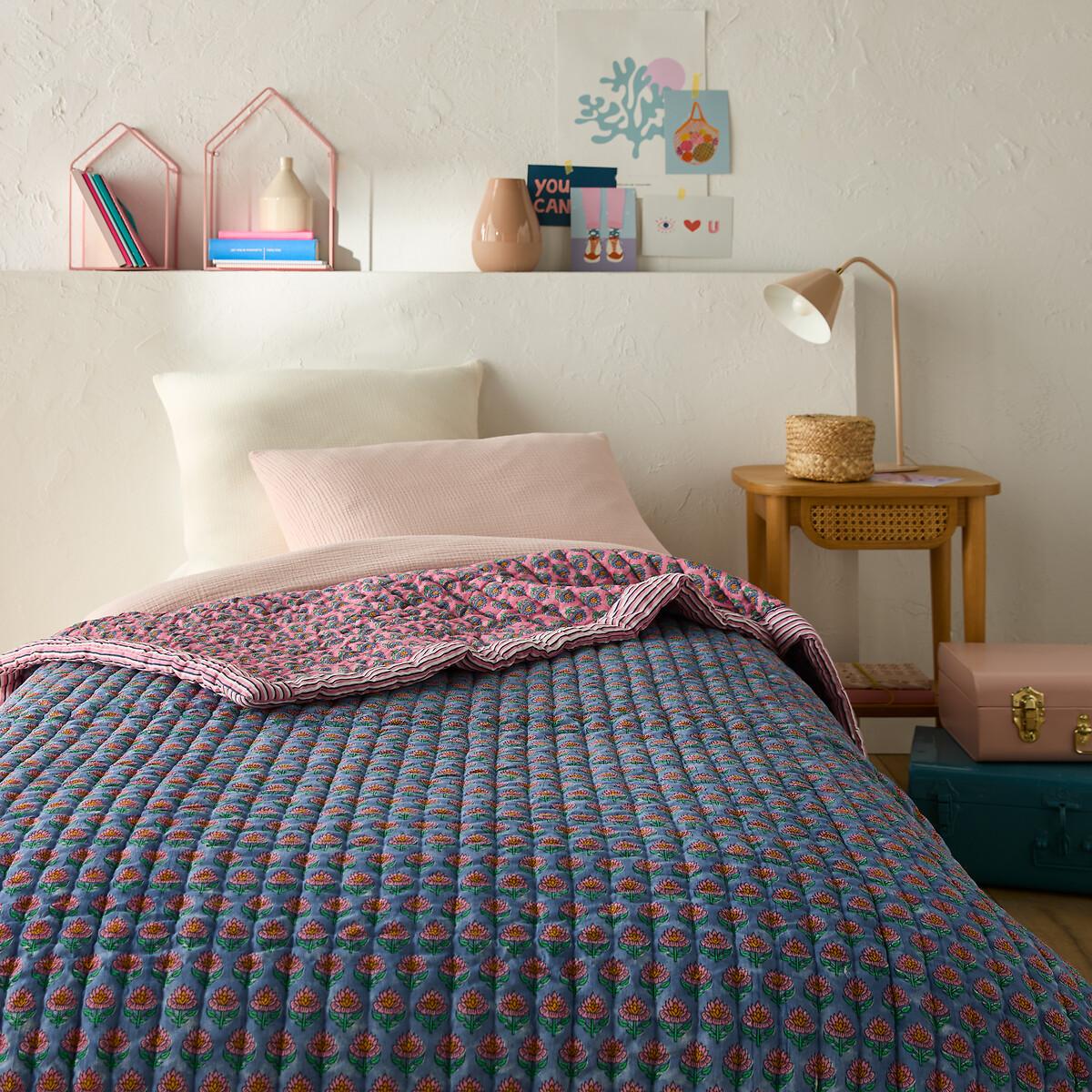 The softness of cotton voile and the freshness of an Indian style print: the Sanaa quilted bedspread adopts a spring floral pattern inspired by block print, available in pastel colors. Ideal for creating a cosy, bohemian atmosphere in a child's bedroom. Product Details • 100% cotton • Cotton voile • Block print flower pattern printed on both sides • Striped border • Padding in 100% polyester (120g/m2)Care Advice • Machine washable at: 30°CSize • 140 x 200cm • OEKO-TEX® Standard 100. Standard 100 certification by OEKO-TEX® tests textile products for harmful substances via an independent, international label.