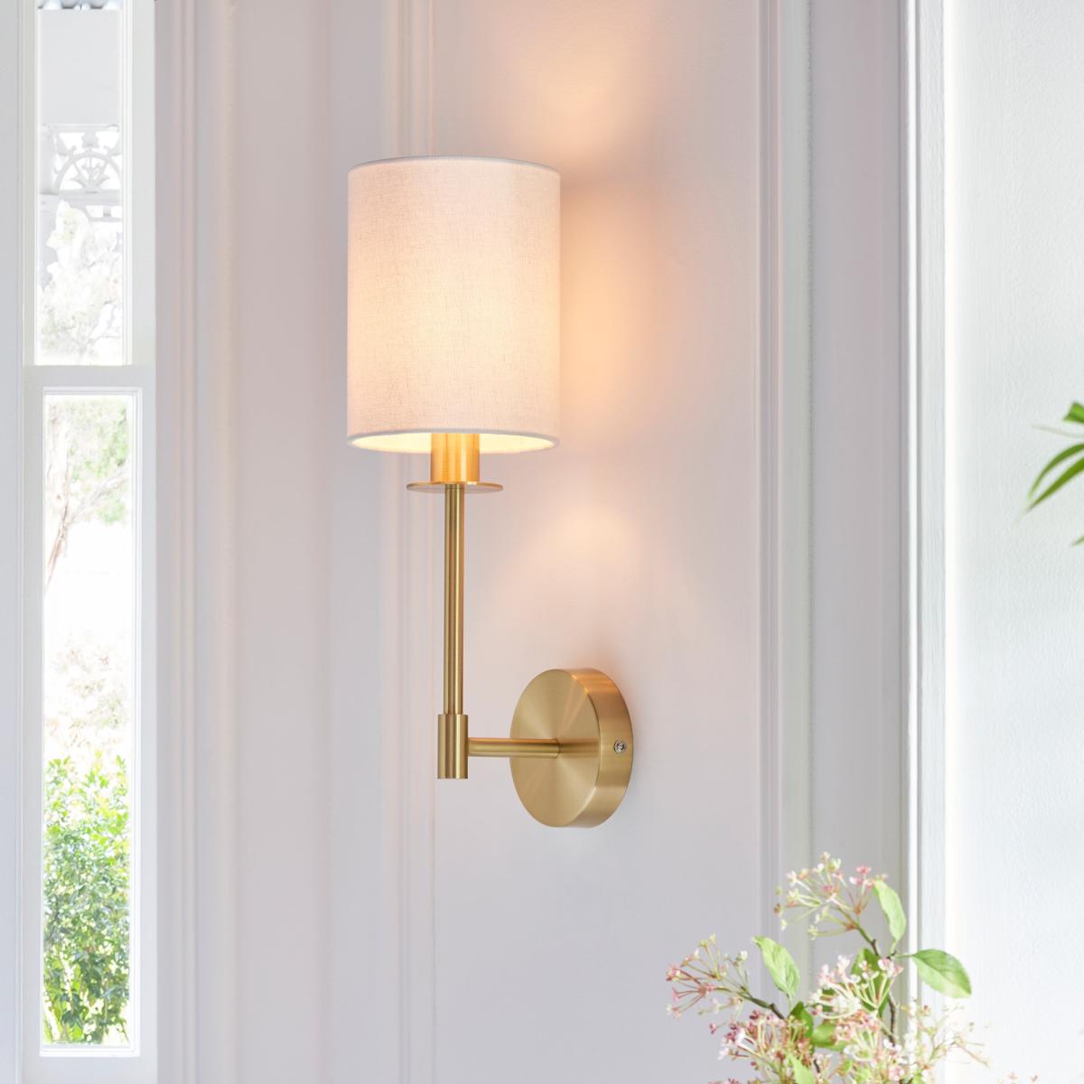 A simple and easy to place modern classic style wall light. Finished in satin brass with vintage white fabric shade.