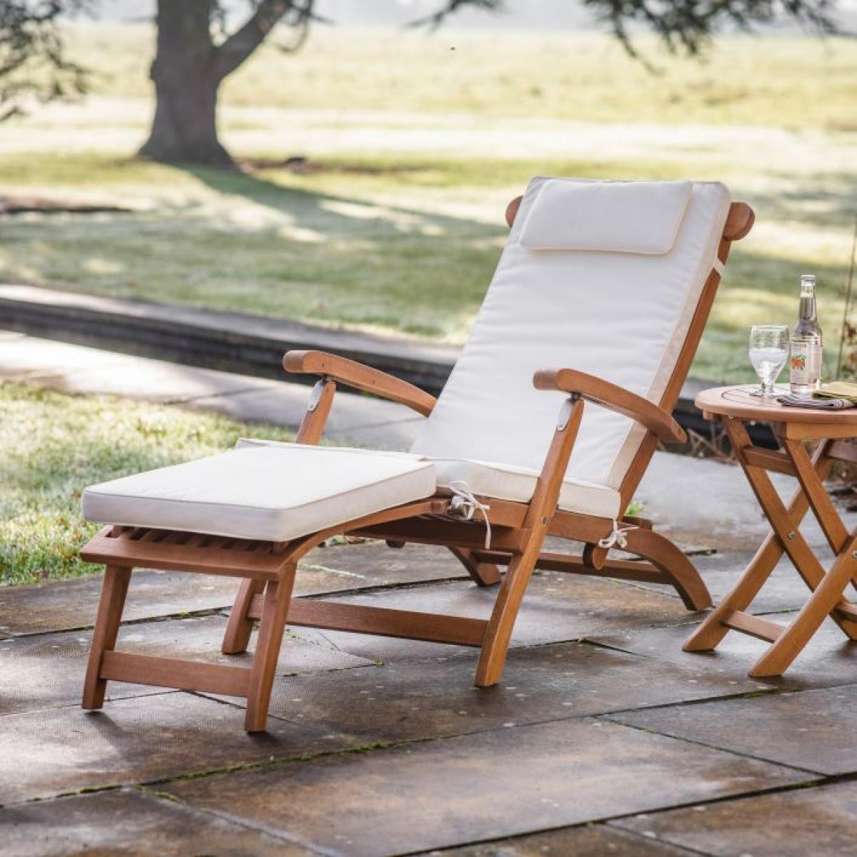 This Outdoor Lounger offers a stylish, luxurious solution for relaxing outside. The lounger features an integrated footrest and the back reclines for added relaxation. The back cushion has a small pillow, and there are seat and leg cushions as well, all for added comfort. It is crafted from eucalyptus wood which is ideal for outdoor furniture, as the wood is naturally resistant to moisture and so offers durability and resilience to colder wetter climates. It also offers a great sustainable resource with its fast growth levels. Material: Acacia Wood. Colour: Brown.