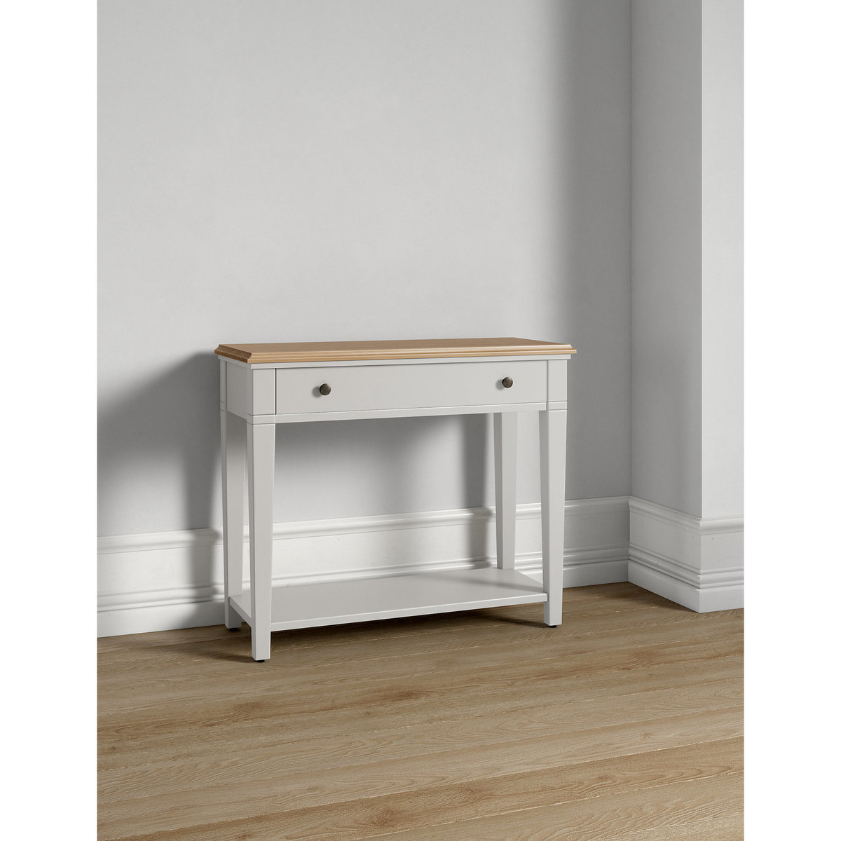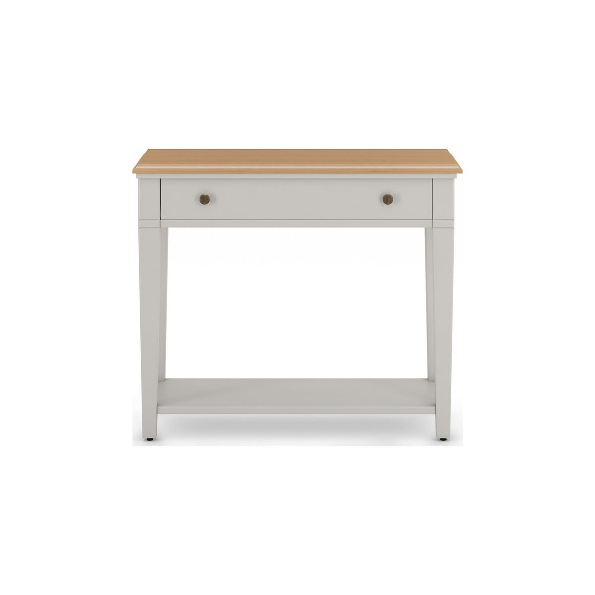Rustic meets contemporary with this practical console table. The top is crafted from solid pine with a contrast painted frame. Drawer with antique-effect metal knobs. Ledge on the bottom, great for stowing books and other items."}