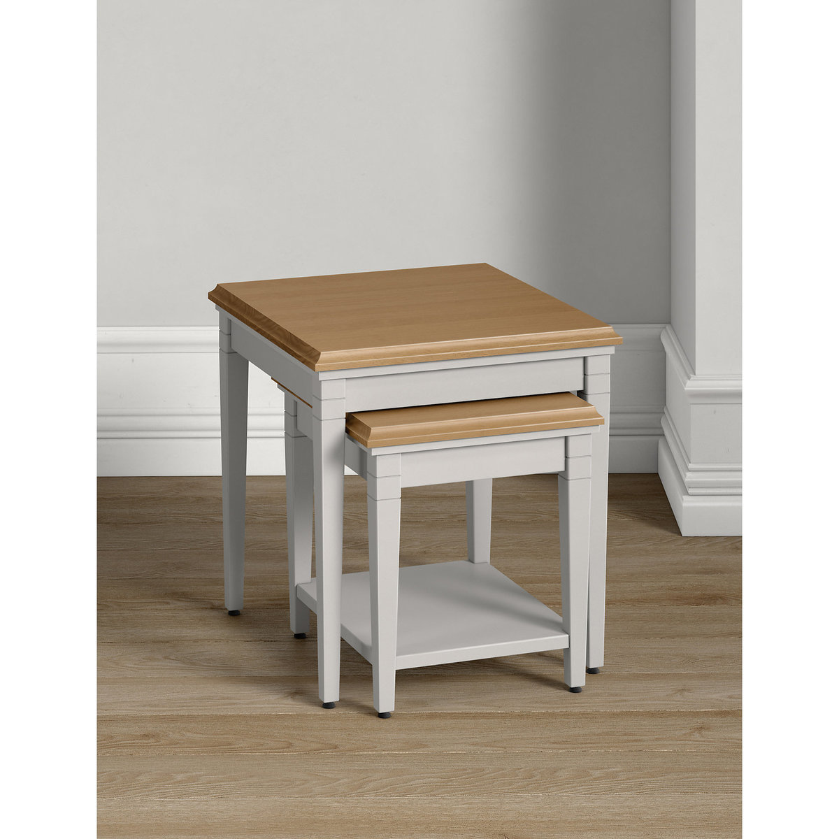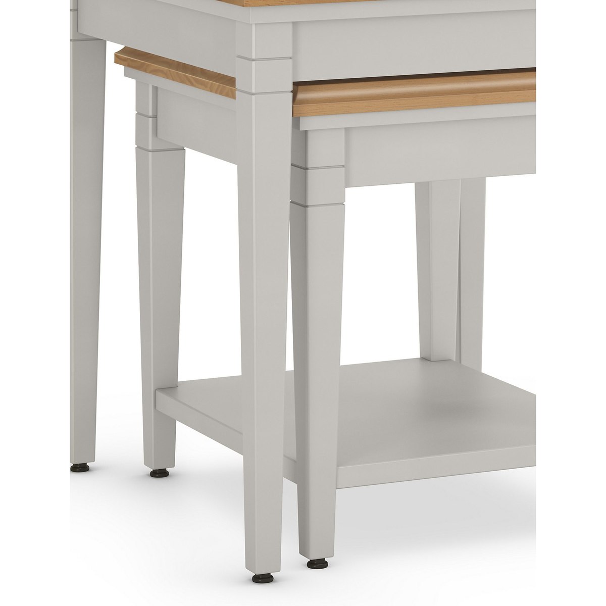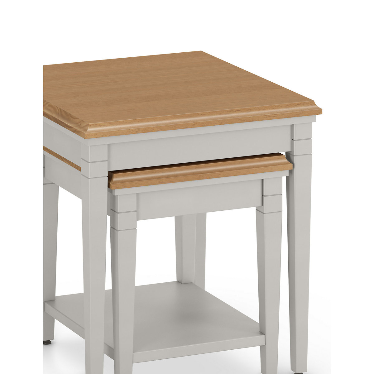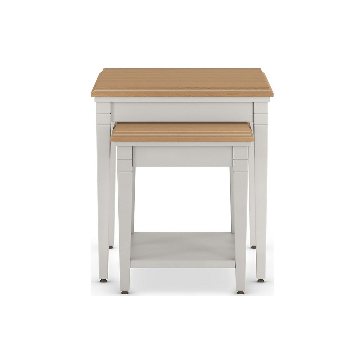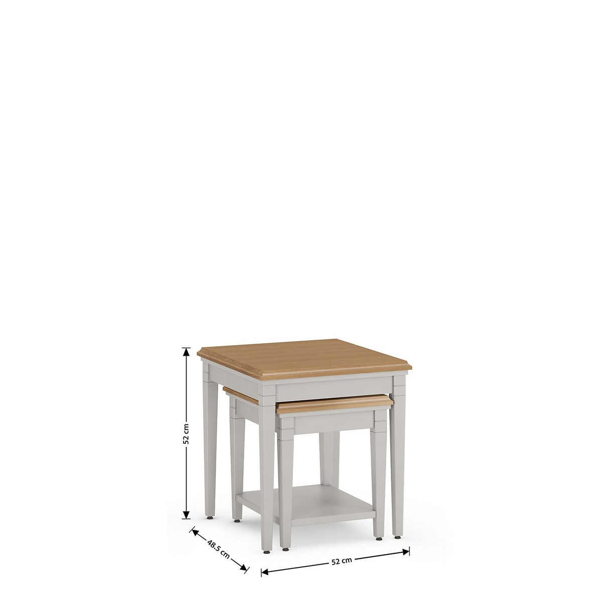 Modern meets rustic in this country-inspired nest of tables. Crafted from a solid pine top with a contrast painted frame. Bottom shelf on the smaller of the two tables."}