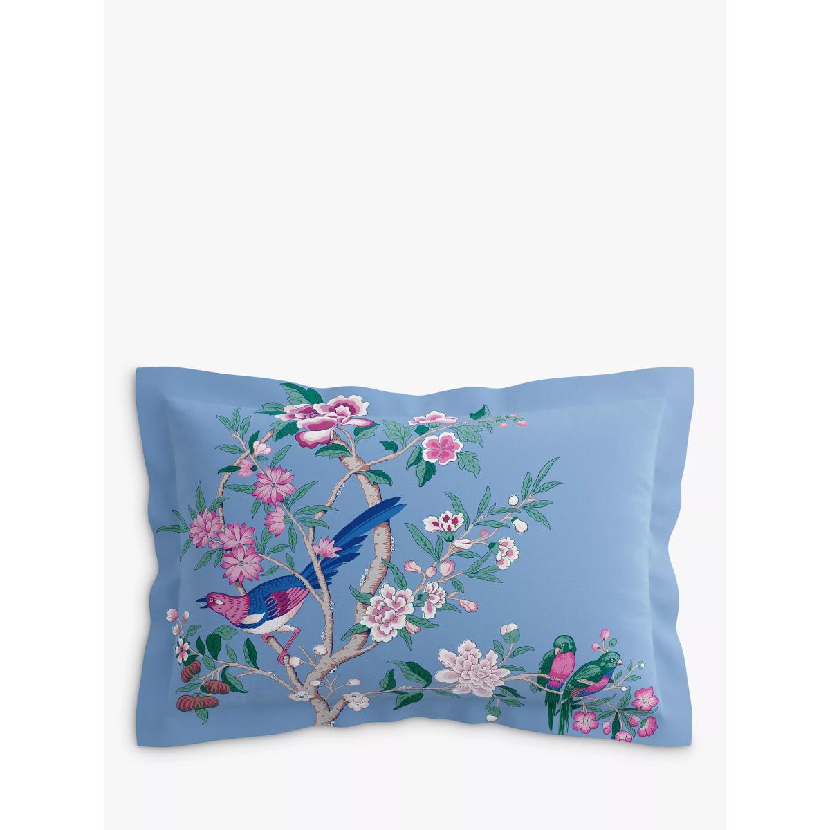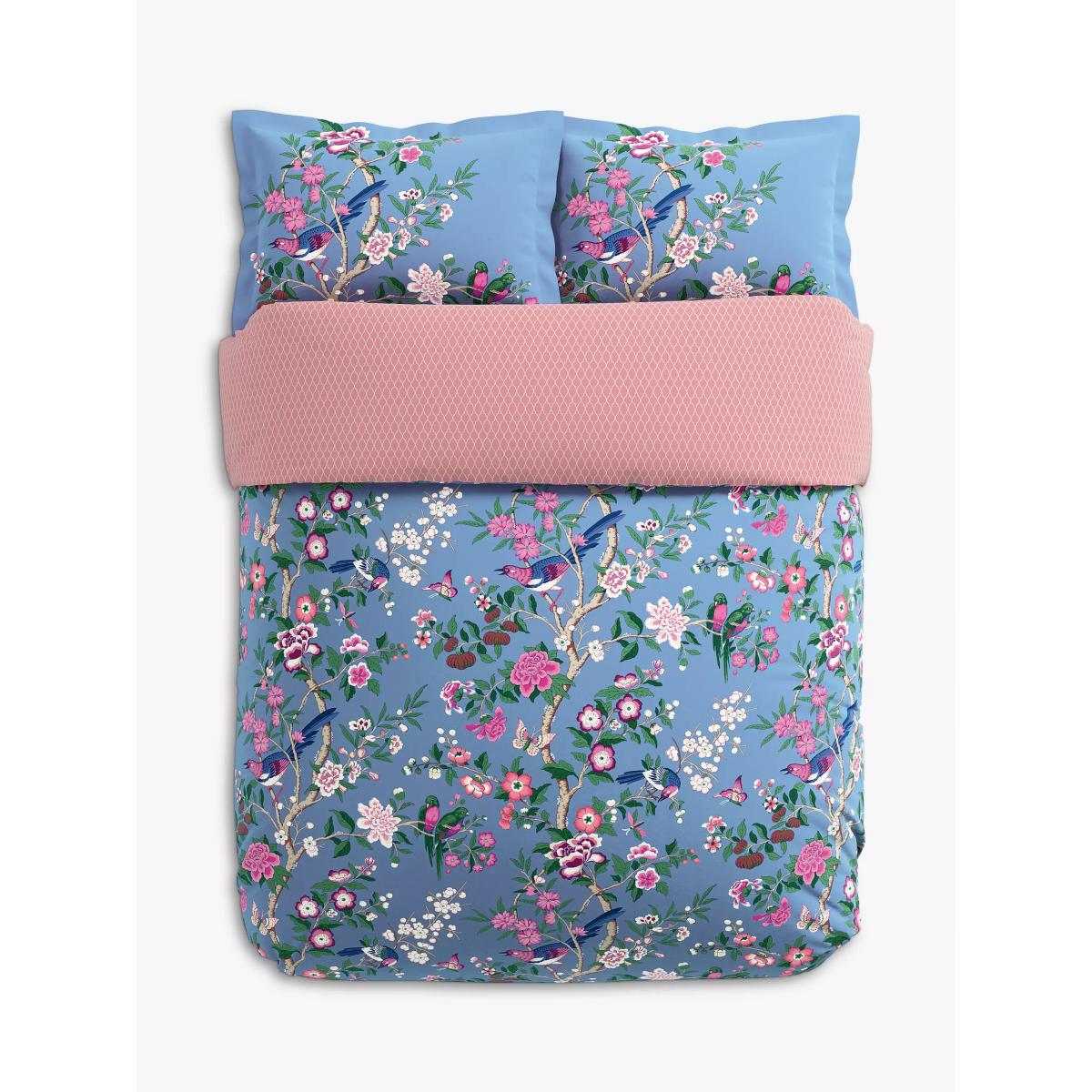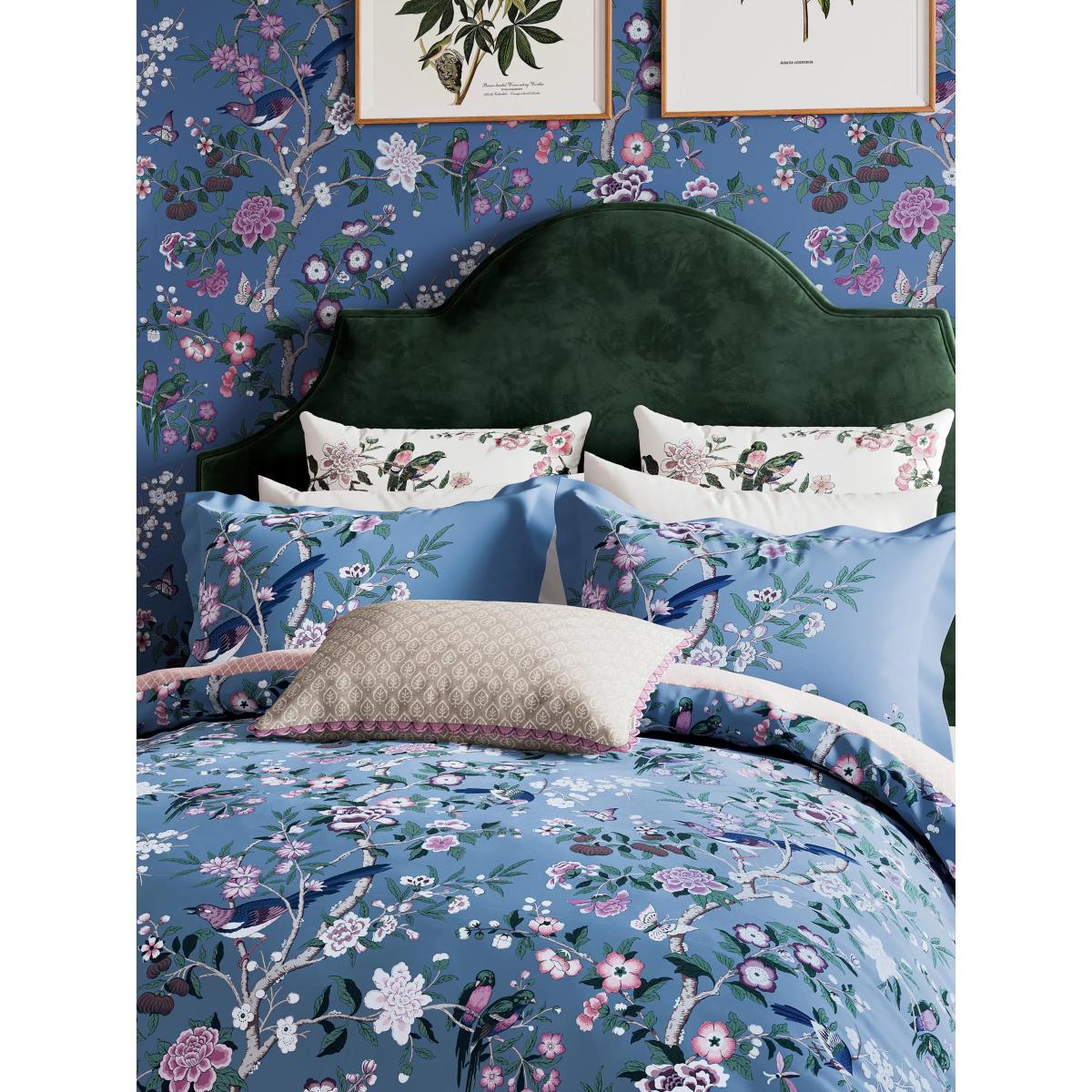 Beautiful and richly coloured, Chinoiserie Hall is inspired by an archive wallpaper believed to be designed by William Turner (1867-1936). In this 200 thread count BCI cotton sateen interpretation, intricate budgies perch on delicate branches amongst springtime blossom and neat buds. The duvet cover’s reverse is finished with a small scale trellis and concealed transparent button opening. All sets contain 2x Oxford pillowcases. Bedding sizes To fit duvet/pillow size (cm) Oxford pillowcase, L75 x W50cm (excluding trim) Double duvet cover, L200 x W200cm King duvet cover, L220 x W225cm Super king duvet cover, L220 x W260cm