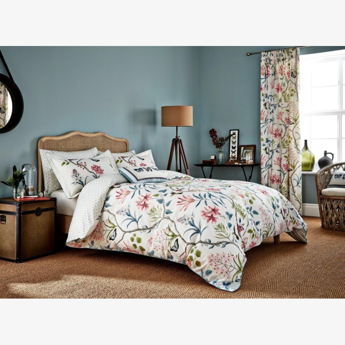 Bring a fresh burst of color and elegance to your bedroom with the Sanderson Clementine Duvet Cover Set in Duck Egg. This beautifully designed bedding set features a soft, calming duck egg blue hue, creating a serene and tranquil atmosphere in any bedroom. The delicate clementine floral pattern adds a touch of warmth and nature-inspired charm, with intricate blooms that exude a sense of timeless beauty. Made from high-quality cotton, the duvet cover set offers ultimate comfort, ensuring a restful and luxurious night’s sleep. The breathable fabric is gentle on the skin and perfect for year-round use, keeping you cozy in the cooler months and comfortably cool during warmer nights. With its sophisticated color palette and graceful floral design, the Sanderson Clementine Duvet Cover Set in Duck Egg is the ideal choice for those who appreciate classic elegance with a modern twist. Add this exquisite duvet set to your bedroom and enjoy a blend of style, comfort, and timeless charm. Thread Count: 200 Composition: 100% cotton Percale Includes Single Duvet Cover SET Includes 1 Single Pillowcase Double, King and Superking Size Duvet Cover SET Includes Pair of Pillowcases Care Instructions Machine Washable at 30°c Tumble Dry safe All screens vary in colour reproduction and whilst every effort has been made to display the colour as accurately as possible it is for guidance only