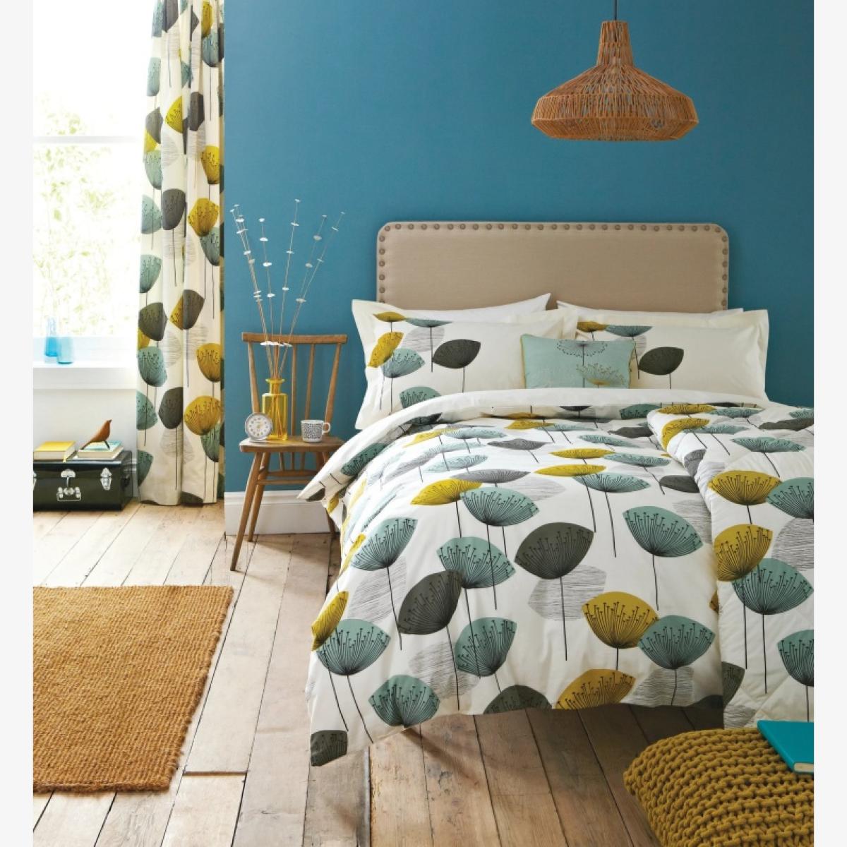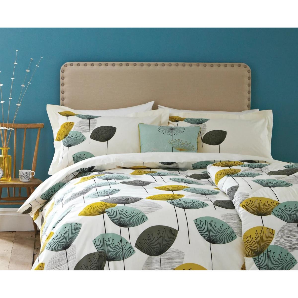 Bring a fresh, retro feel to your bedroom with the Sanderson Dandelion Clocks Duvet Cover Set in Chaffinch, featuring the iconic stylized dandelion motif in soft, uplifting colours Dandelion Clocks is a fun and funky 50's inspired retro print taken from the Sanderson fabric and wallpaper of the same name. Stylised dandelion heads with seeds radiating from a central point are printed on crisp 200 thread count cotton percale. The duvet cover and oxford pillowcase are bordered with contrasting fine cord piping. Features: 100% Cotton 200 Thread Count Single Duvet Includes Single Pillowcase Double, King and Superking Size Duvet Includes Pair of Pillowcases Care Instructions: Machine Washable Please note All screens vary in colour reproduction and whilst every effort has been made to display the colour as accurately as possible it is for guidance only.