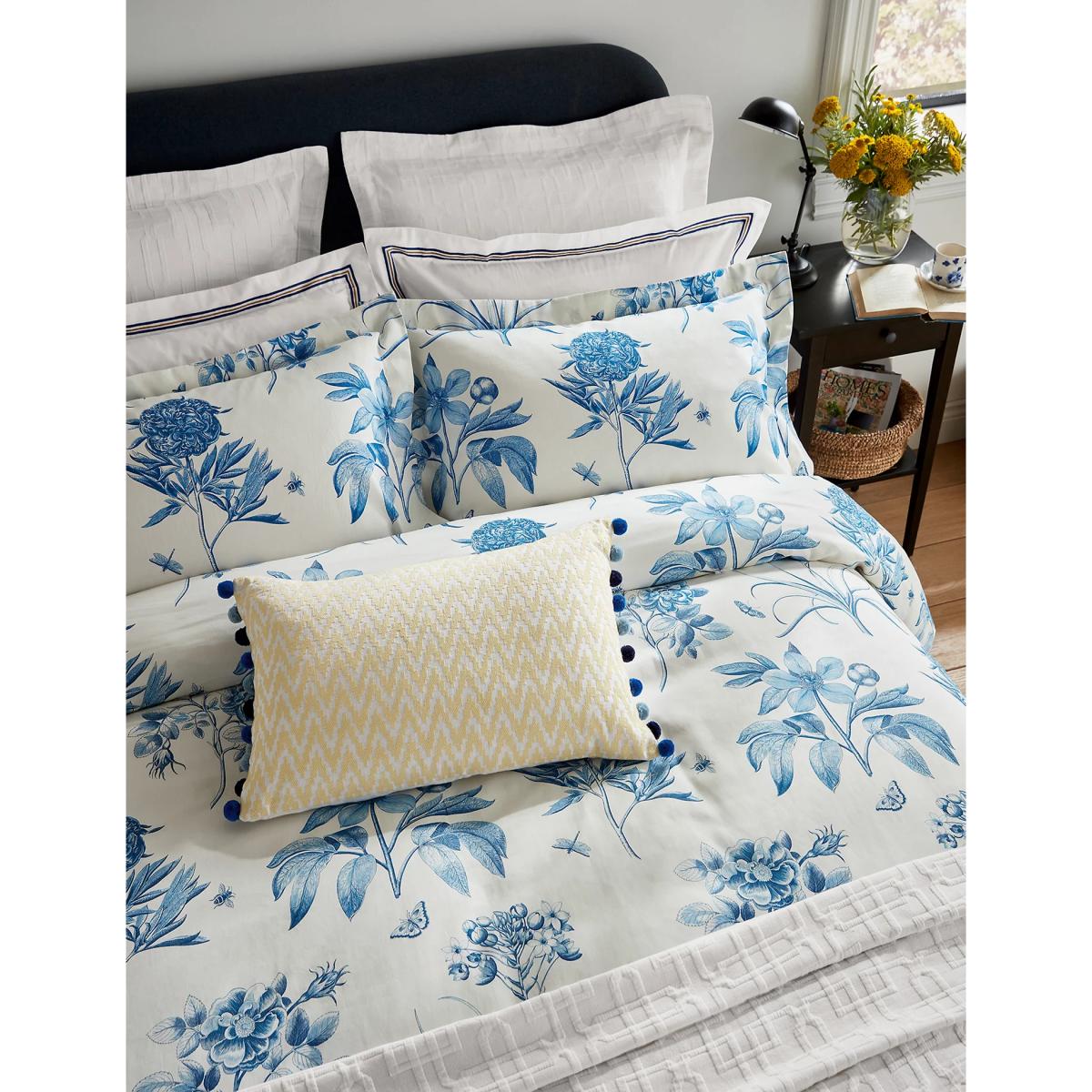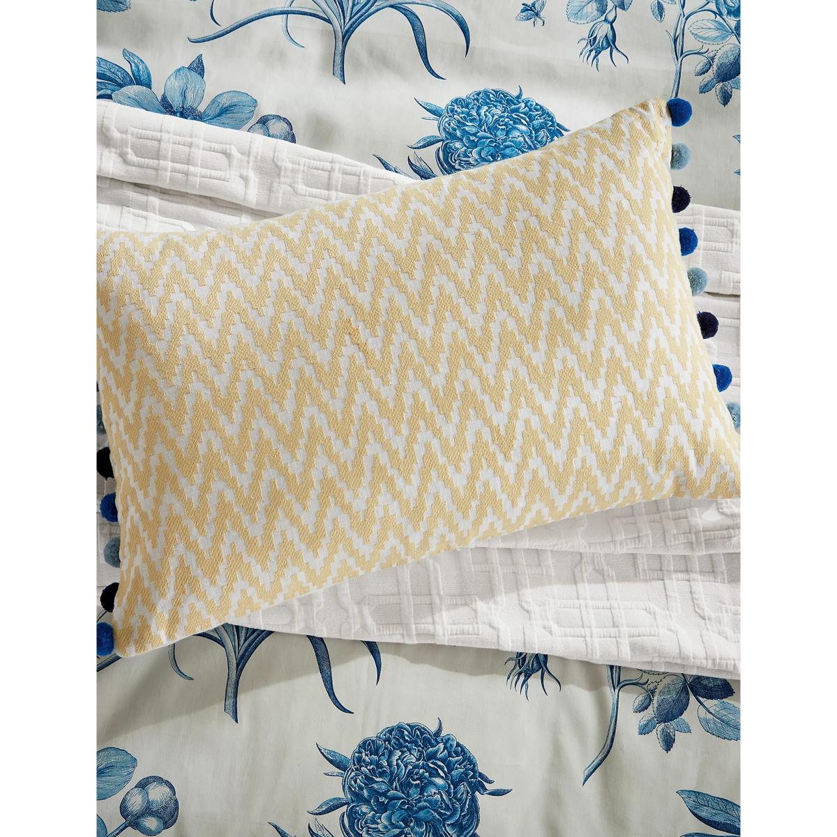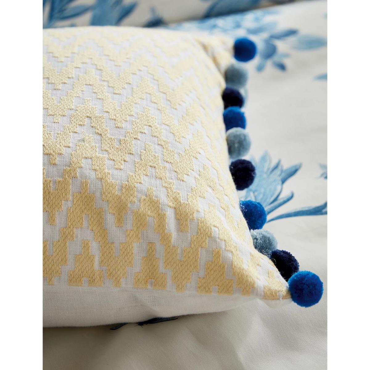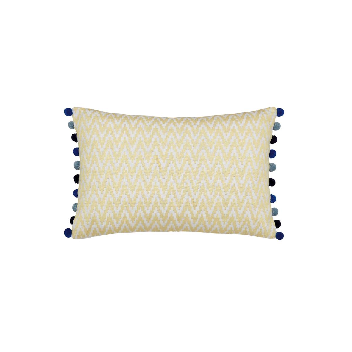 Bring extra flair to your decor with this linen-rich cushion from Sanderson. A raised geometric design and playful pom poms on either side create a wonderfully textured look.