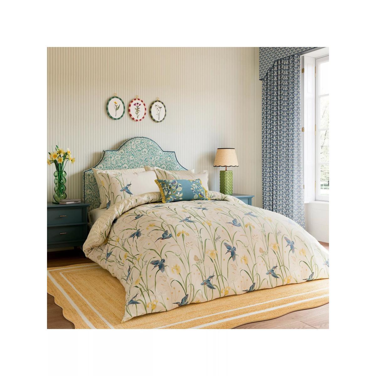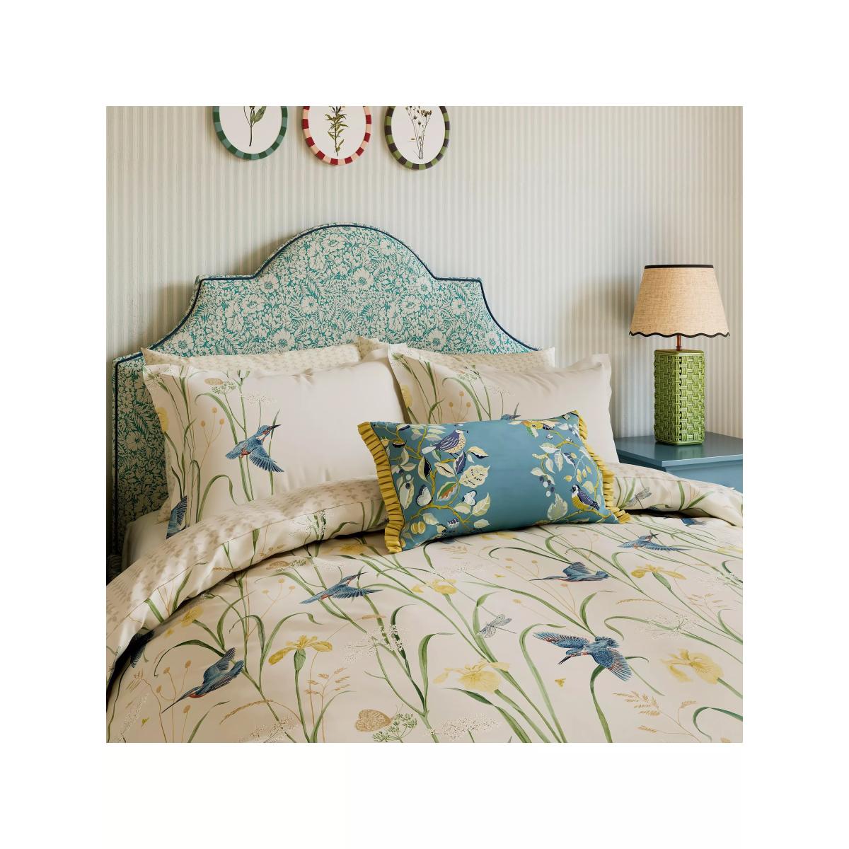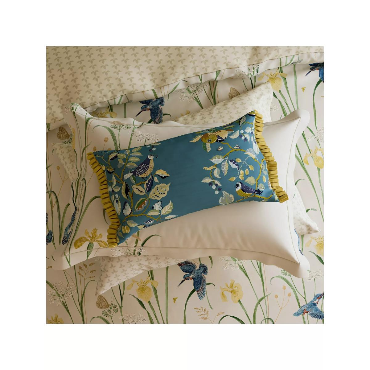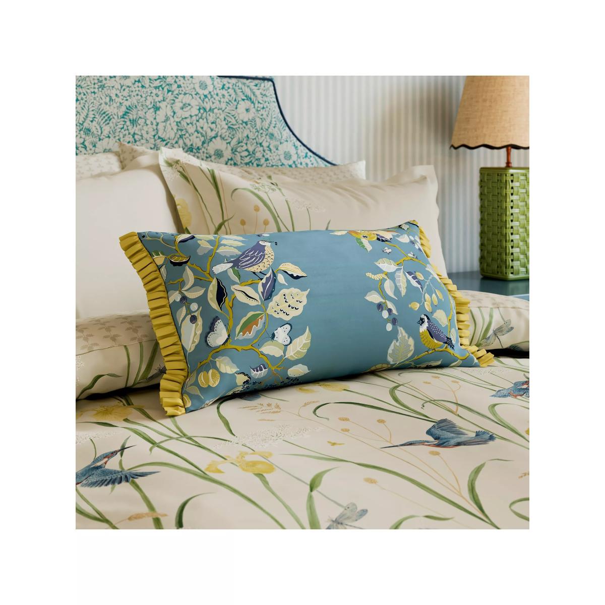 A vibrant and spring-like cushion made from 100% cotton slub. The front reveals printed birds and flowers on an azure ground. The reverse is a plain colour, and the ends of each cushion are accented by a pleated edge in ochre.