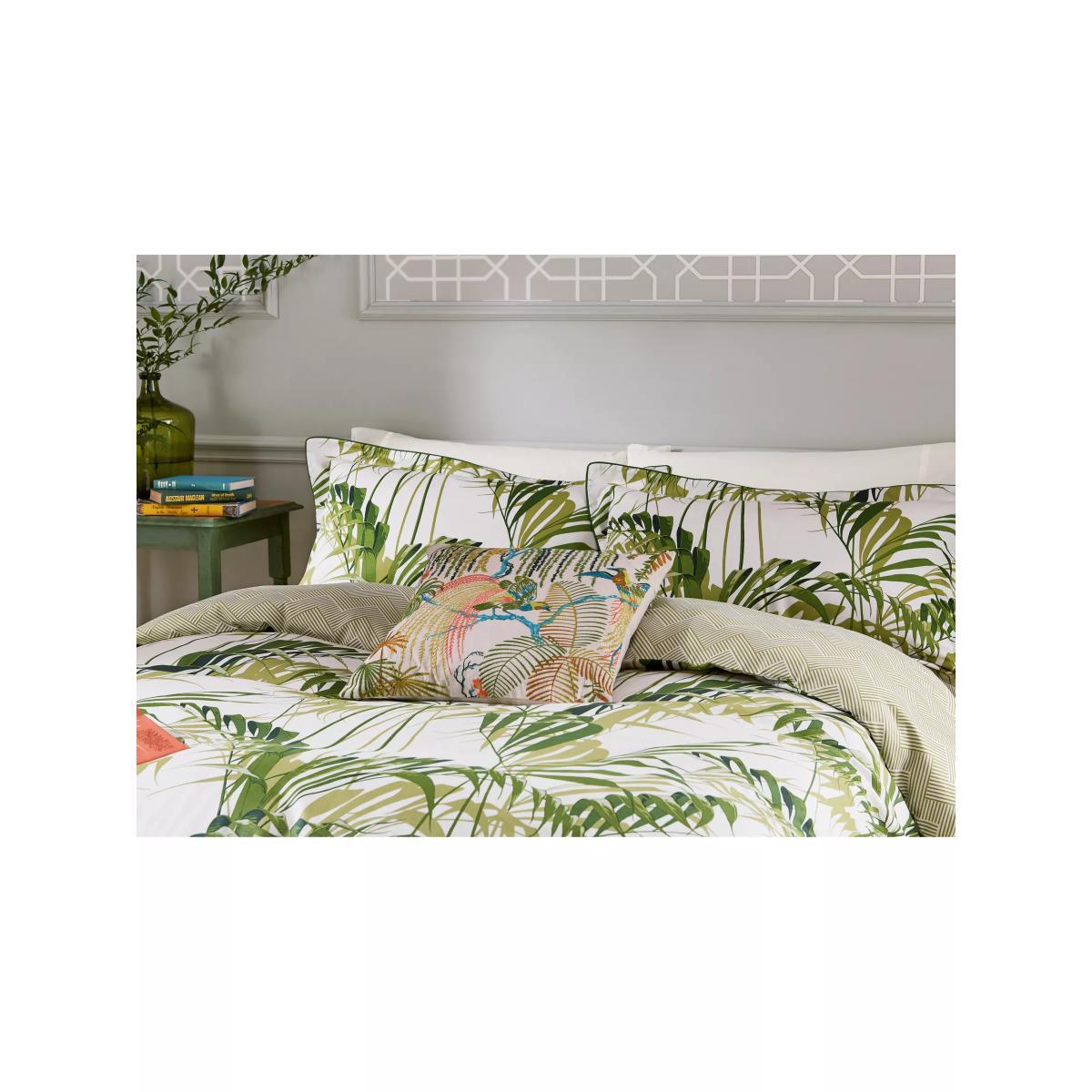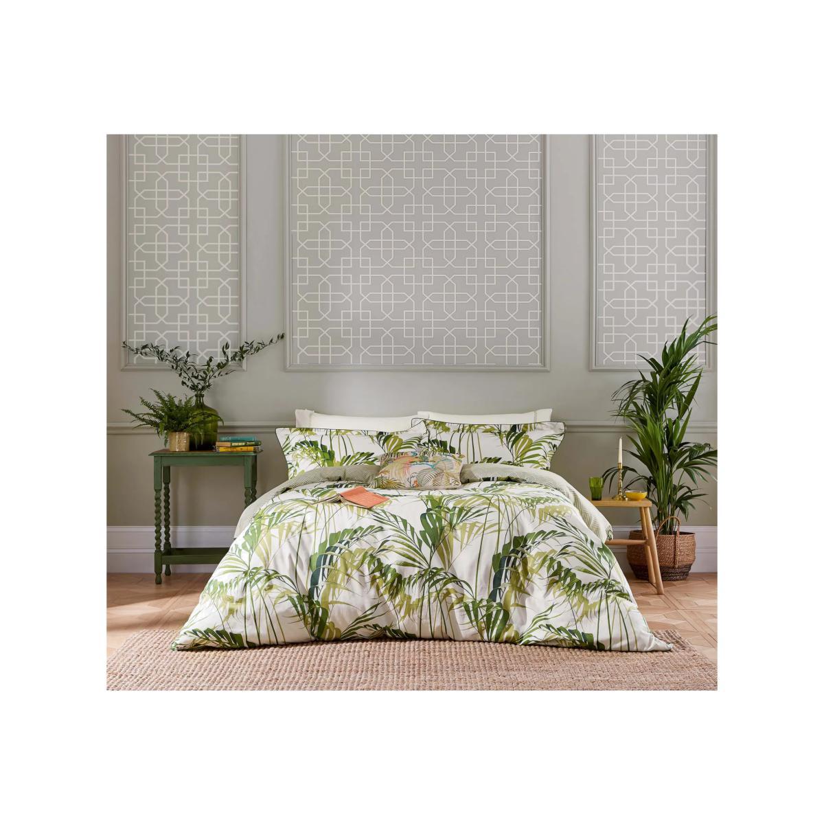 This design's curving foliage makes for a bedroom oasis, with its elegant arrangement of palm leaves and silhouetted shadows in tranquil shades of botanical green. The naturally breathable 200 thread count cotton sateen fabric helps keep you cool and comfortable throughout the night. Please note that duvet covers and pillowcases are sold separately and not in sets. Have you thought about sheeting? Shop. Bedding sizes To fit duvet/pillow size (cm) Oxford pillowcase, L75 x W50cm (excluding trim) Double duvet cover, L200 x W200cm King duvet cover, L220 x W225cm Super king duvet cover, L220 x W260cm