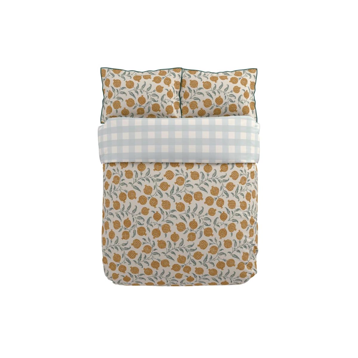 This pomegranate-print bedding set by Sanderson is crafted from pure cotton with a smooth sateen weave. It has a 200 thread count for cool, airy comfort. The set features fine cord piping on the edges and a classic check pattern on the reverse of the duvet cover. It's finished with smart button fastenings.