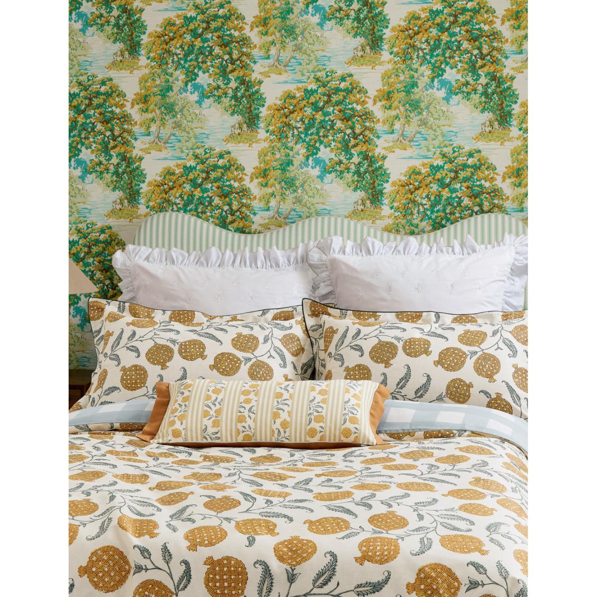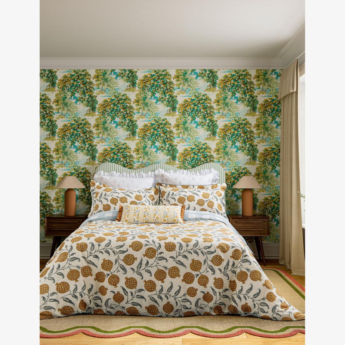 This pomegranate-print bedding set by Sanderson is crafted from pure cotton with a smooth sateen weave. It has a 200 thread count for cool, airy comfort. The set features fine cord piping on the edges and a classic check pattern on the reverse of the duvet cover. It's finished with smart button fastenings.