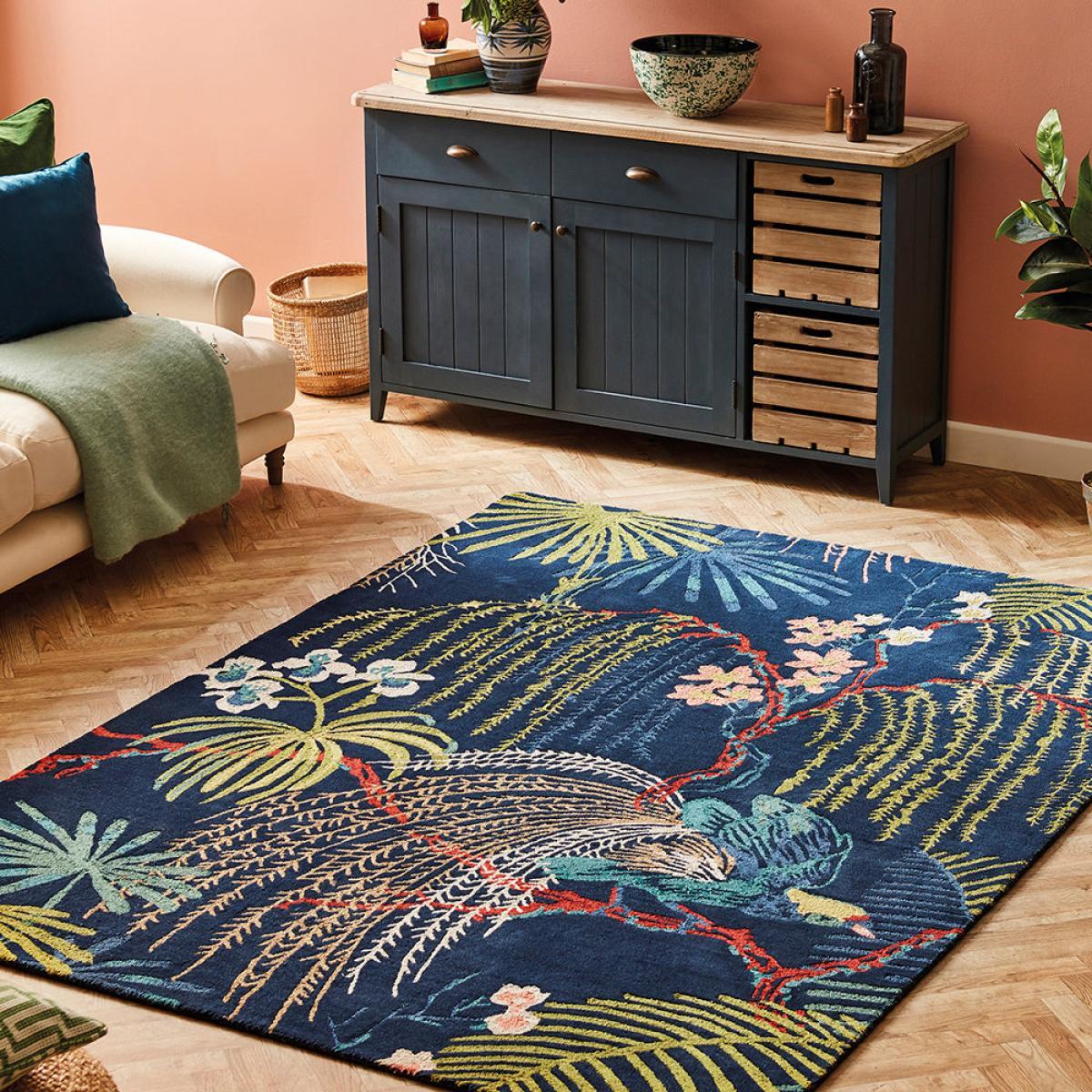 I love this rainforest-inspired rug for its bold, tropical design and rich colour palette, which can add a vibrant focal point to both modern and eclectic interiors. It's particularly effective in living rooms or bedrooms where you want to bring a touch of exotic flair without overwhelming the space. To style it well, consider pairing with neutral or earthy furnishings to let the rug stand out, or coordinate with other accessories in deep green, navy, or blush for a cohesive look. Practical tips include choosing furniture with simple lines to balance the detailed pattern, and layering with textured cushions or throws to add tactile contrast. Its size makes it versatile enough to define a seating area or serve as an eye-catching statement piece in open-plan spaces.