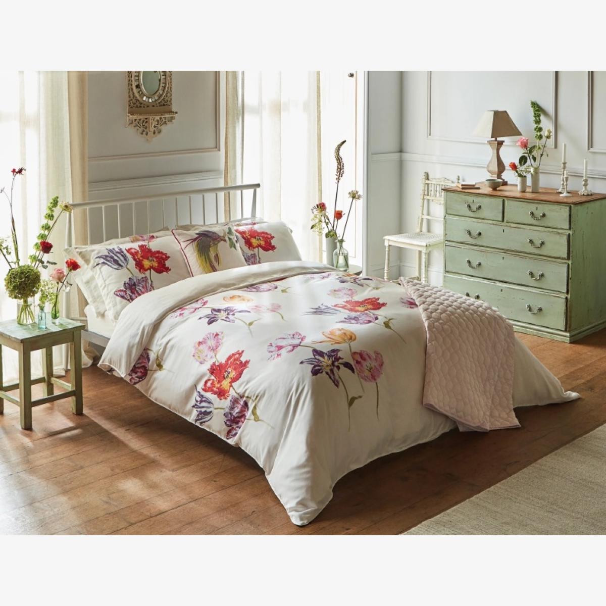 Add a touch of floral elegance to your bedroom with the Sanderson Tulipomania Duvet Cover Set in the rich hues of Rose Red and Amethyst. Inspired by the timeless beauty of tulips, this luxurious duvet set brings a vibrant, yet sophisticated feel to any space. The bold, expressive floral print in warm, inviting tones of deep rose and soft amethyst is a true statement piece, instantly transforming your bedroom into a serene and stylish retreat. Crafted from high-quality, soft cotton, the duvet cover and matching pillowcases ensure a comfortable night’s sleep, while the delicate floral design adds a touch of vintage charm with a contemporary twist. The combination of the classic floral pattern with modern colors creates a perfect balance of tradition and style, making it an ideal choice for anyone looking to elevate their bedding collection. Whether you're updating your master bedroom or adding personality to a guest room, the Sanderson Tulipomania Duvet Cover Set offers both comfort and elegance, bringing a fresh, inviting atmosphere to your home. Finished with flat piped edges Thread Count: 200 Composition: 100% cotton sateen Includes Single Duvet Includes 1 Single Pillowcase Double, King and Superking Size Duvet Includes Pair of Pillowcases Care Instructions Machine Washable at 30°c Tumble Dry on Low All screens vary in colour reproduction and whilst every effort has been made to display the colour as accurately as possible it is for guidance only.