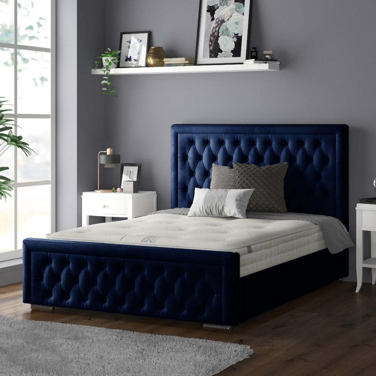 Sandringham Bordered Chesterfield Plush Velvet Bed Frame with Diamonds - Royal Blue / Double