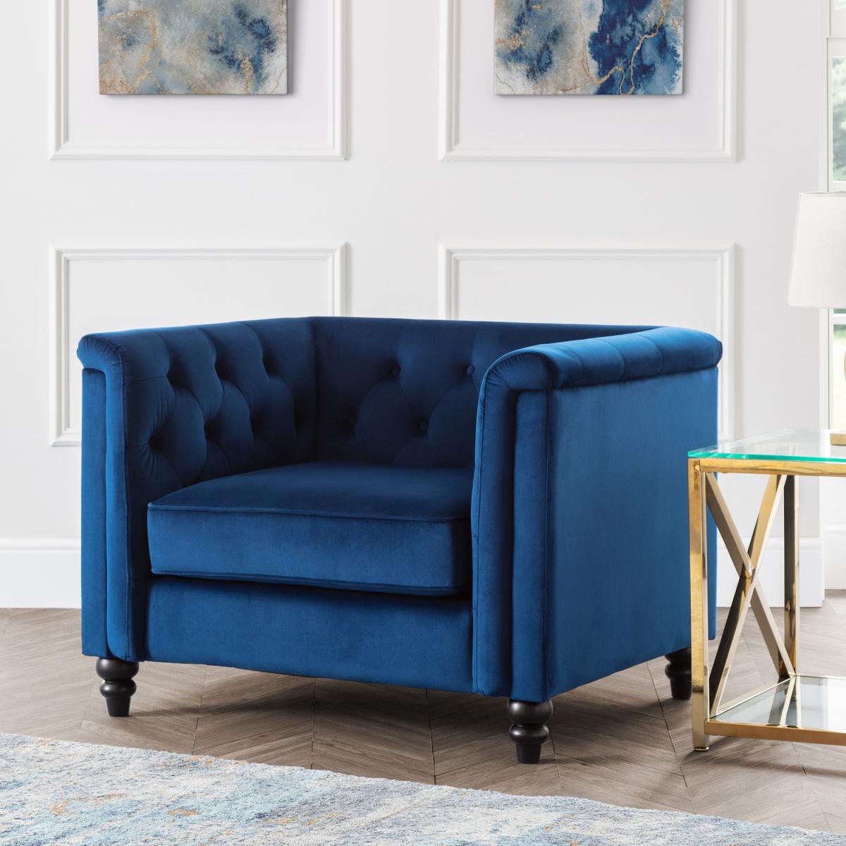 I love this chair for its bold blue hue, which makes it an excellent statement piece in both modern and classic interiors. It works particularly well in living rooms, bedrooms, or even a home study where a pop of colour can elevate the space. The tufted back adds a touch of elegance, while its compact size makes it versatile for smaller rooms or as an additional seating option. Practical styling tips include pairing it with neutral cushions or throws to soften the look, or mixing in some patterned accessories for added visual interest. Its rich colour also pairs beautifully with brass accents or wooden furniture, making it easy to incorporate into a variety of colour schemes.