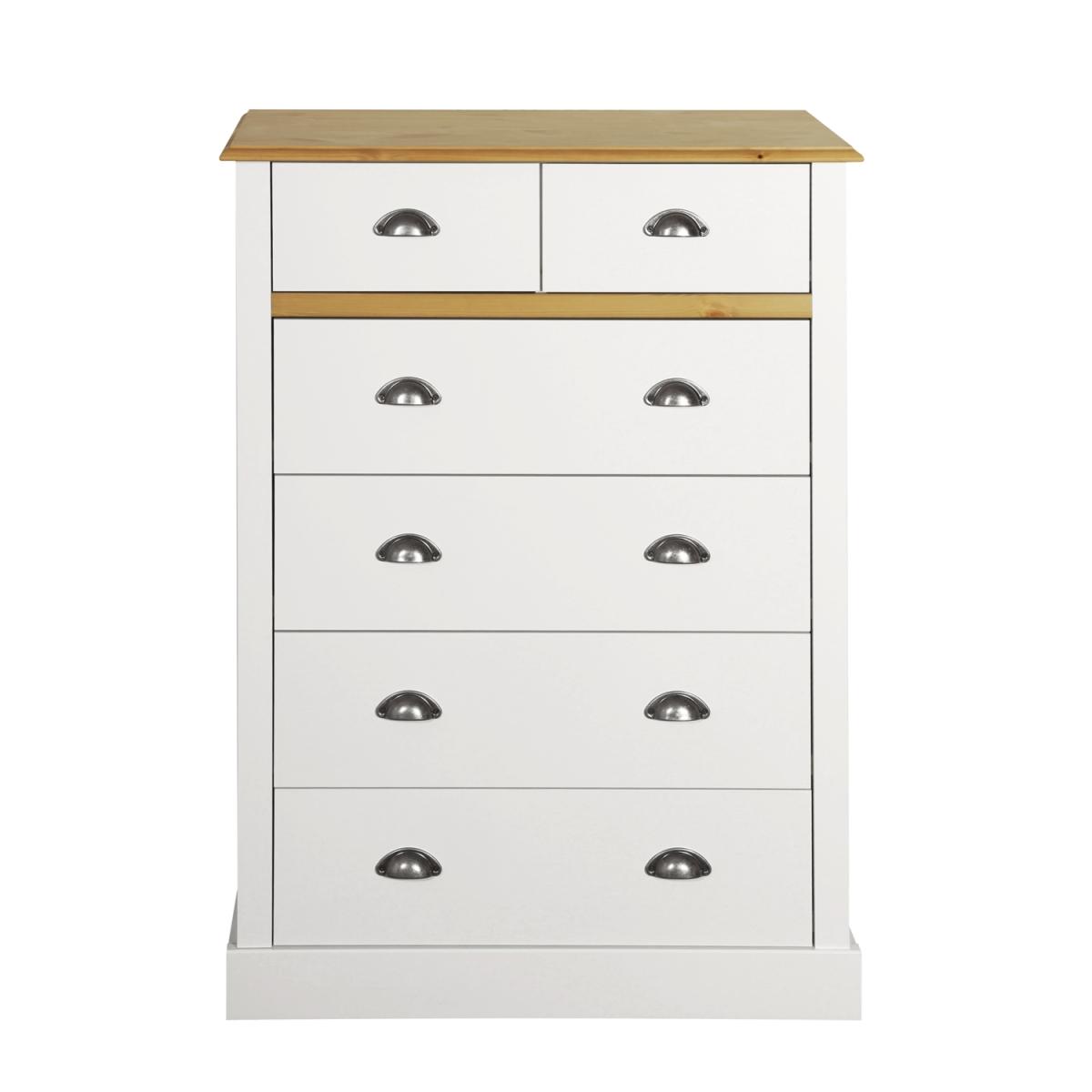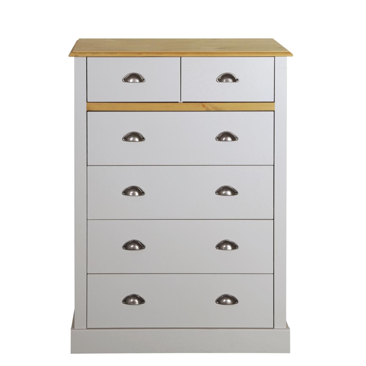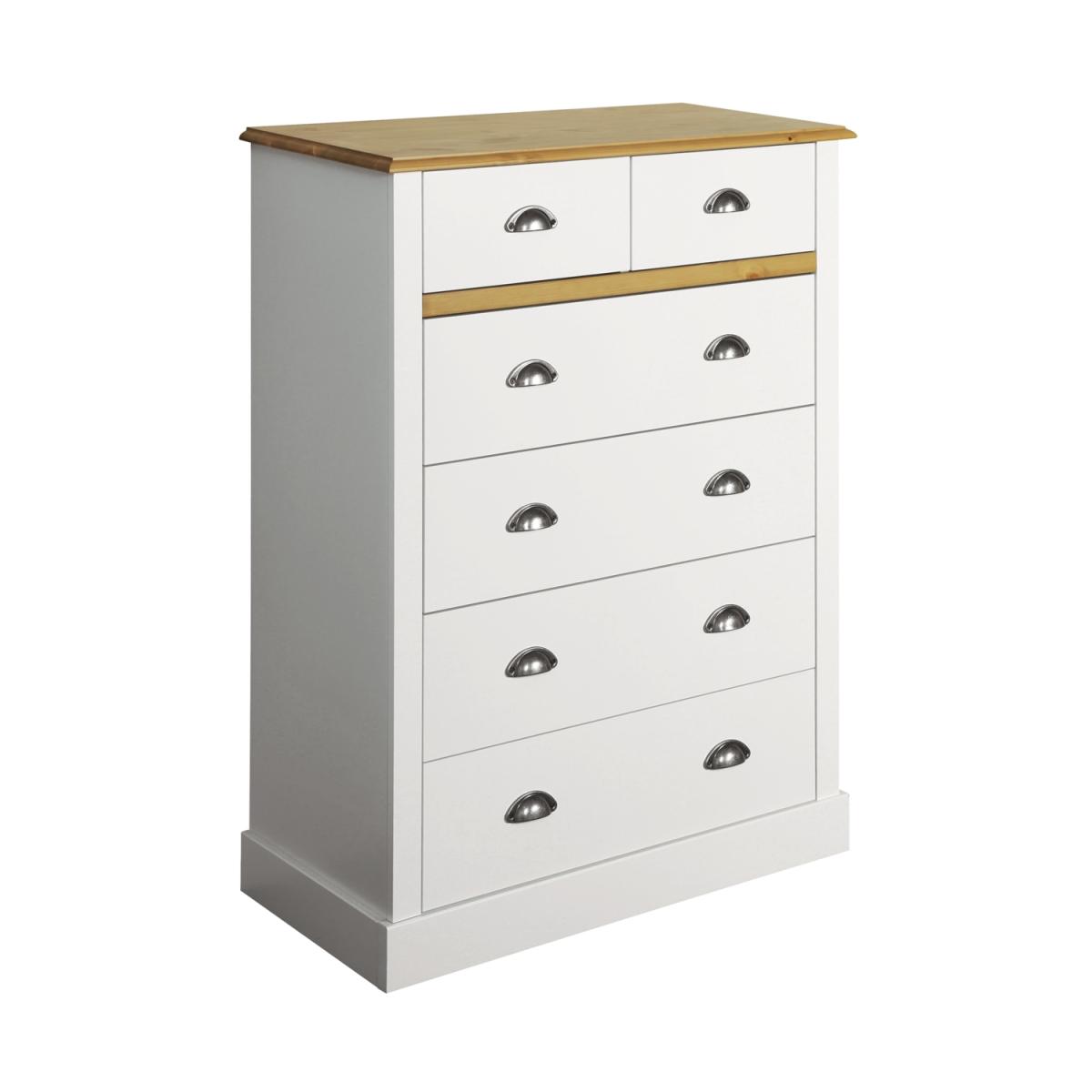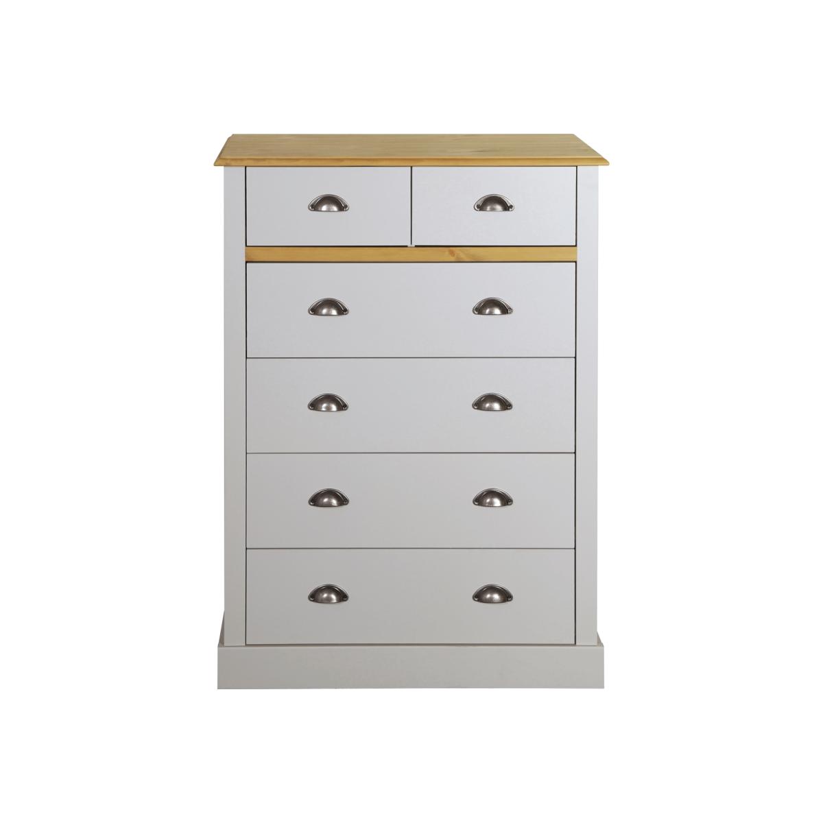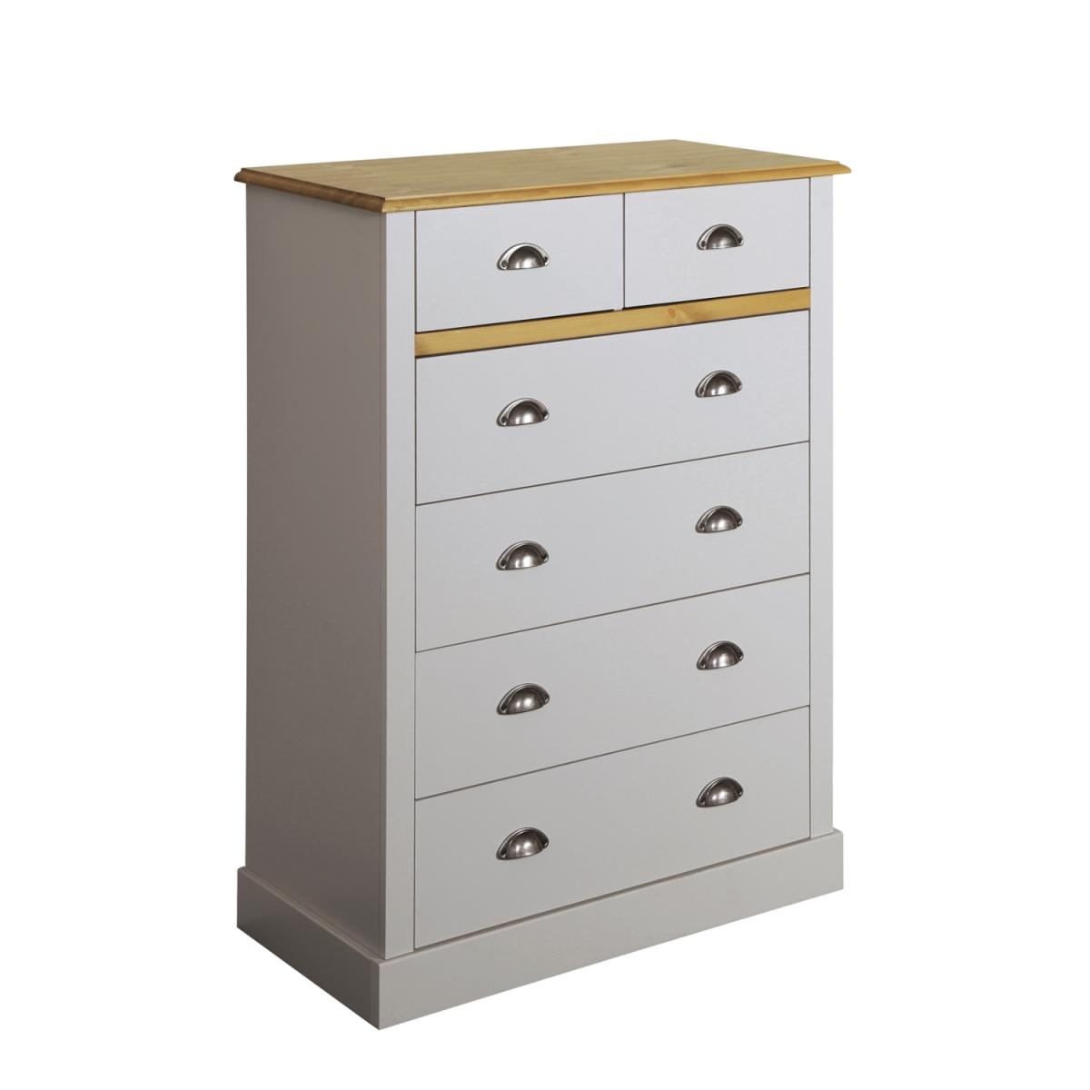 Oozing style and sophistication, the Sandringham Two plus Four Drawer Chest will provide the perfect storage solution for all your treasured items. The cabinet has been classically styled with an oak stained solid pine top and accented with vintage-inspired metal cup handles to form a sophisticated piece of furniture. The sturdy frame is comprised of four larger and two smaller drawers, all mounted on under slung metal roller runners for an easy glide action. With plentiful storage, you can house everything from books and paperwork to cosmetics and spare keys. The large flat top surface provides yet more storage, ideal for housing floral bouquets or decorative ornaments. Simply place this cupboard in your bedroom, hallway or dining room to give your home an elegant edge and that extra dimension it has been looking for.