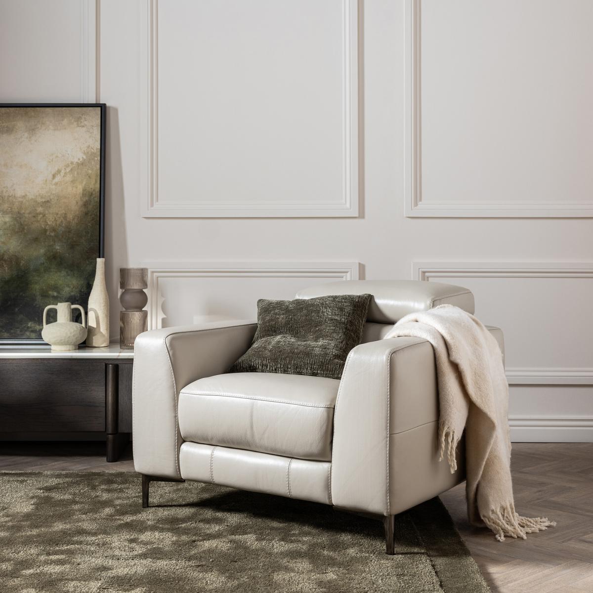 I love this armchair for its sleek, contemporary look combined with practical comfort. The grey leather finish makes it versatile enough to work in both modern and minimalist interiors, as well as more classic schemes when styled with textured throws or patterned cushions. Its clean lines and understated design means it can hold its own as a statement piece or blend seamlessly into a coordinated living space. For styling tips, pair it with neutral-toned rugs, metallic accents, or layered textiles to add depth. Its compact shape works well in smaller rooms or as an accent piece in larger living areas, making it both stylish and functional for a variety of interiors.