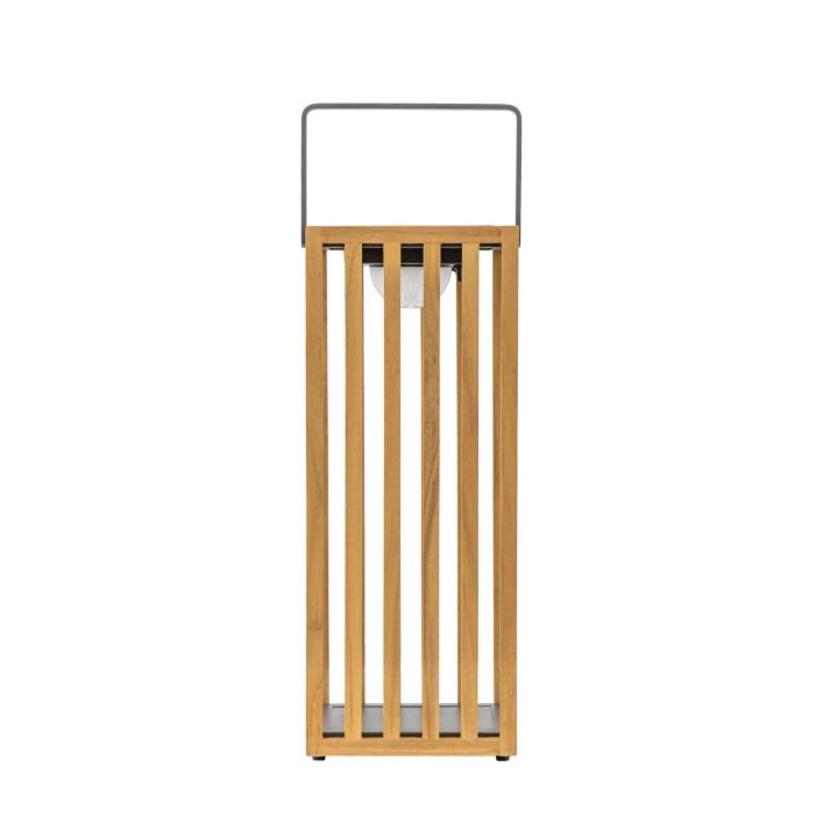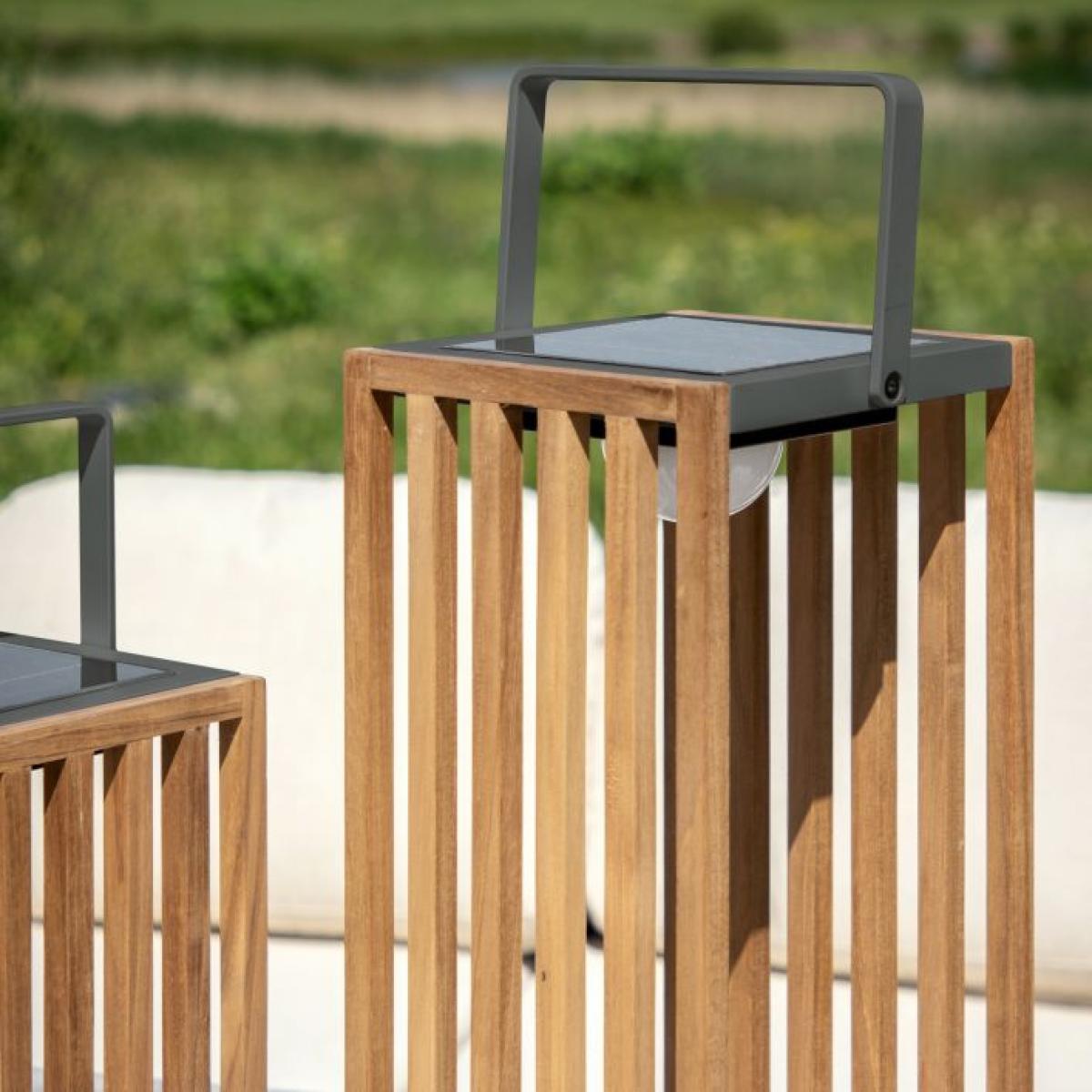 Relax and enjoy your outside space late into the evening with the glow of this solar lamp. The aluminium frame and teak wood strips create a stunning light when lit. The lamp is easy to position wherever you need it, thanks to the a sleek carry handle. With 3 light intensity settings, the lamp can run for up to 5 hours on the brightest setting, up to 8 hours on the middle setting, and up to 12 hours on the lowest setting, after charging by direct sunlight. It can also be charged by USB (charger not included), which gives up to 32 hours of light on the brightest setting, and up to 60 hours on the lowest. Coordinating smaller lamp available.