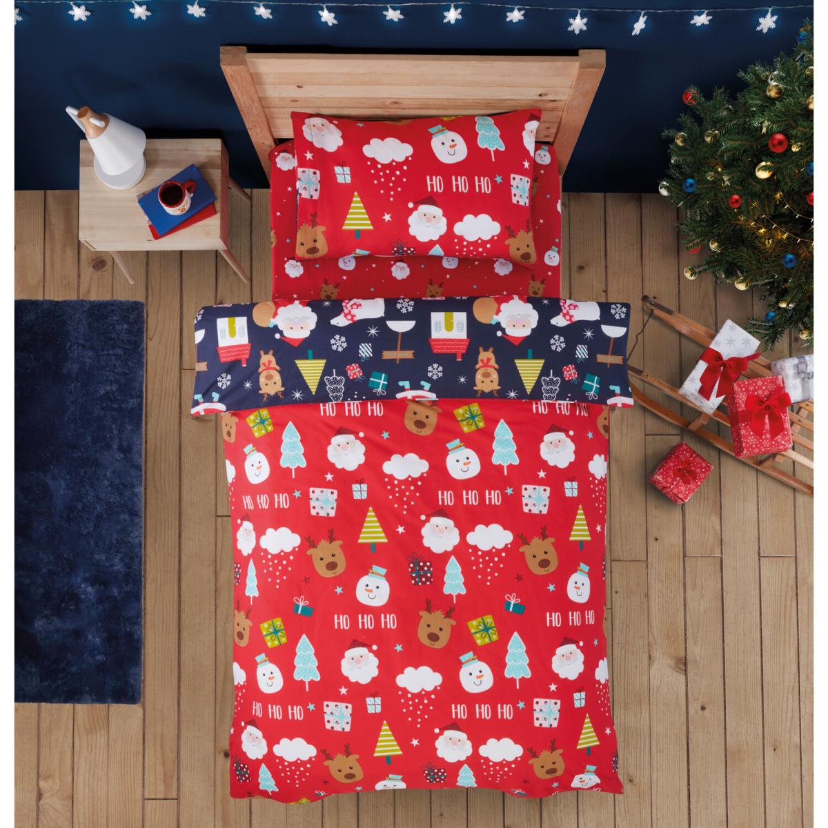 Your little one will love waiting for Santa when they're snuggled up in this Santa and Friends Duvet Cover and Pillowcase Set. Featuring a pattern of fun festive icons, this vibrant bedding is sure to get them in the festive spirit. With a navy design on one side, this set is reversible, boasting a Christmas red on the back.