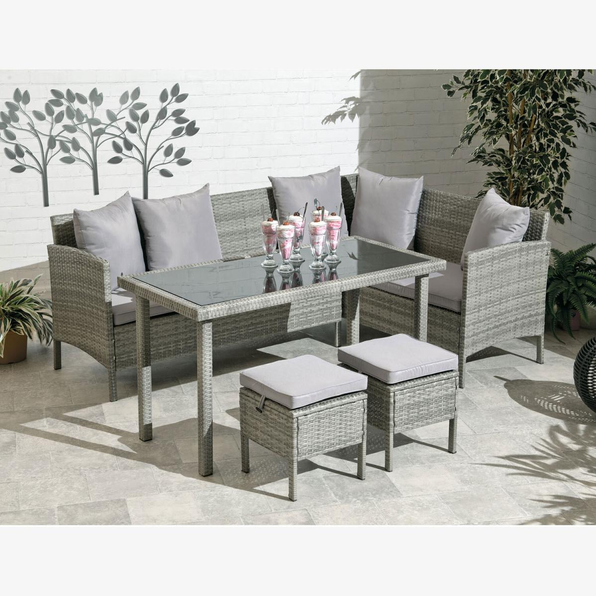 Perfect for al fresco dining, the Santa Clara Sofa Dining Set is a stylish and comfortable outdoor furniture set. Settle down with your family at the long table to feast on BBQ food, knock back some drinks, and enjoy the sunny evenings. This garden furniture includes on corner sofa unit, two stools, and a table that can seat up to eight people. Using grey rattan and pale grey cushions, this stylish set will bring a charming and modern aesthetic to your patio. The synthetic rattan and steel frame ensure that this furniture collection is weatherproof, so it will hold up against changing weather conditions throughout the summer. The tempered glass tabletop adds both durability and class, while the thick and plush cushions will be inviting and comfortable as you use this set.