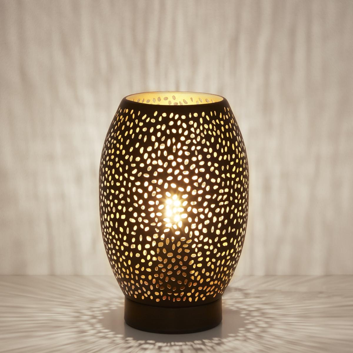 Create a focal point of light with the stunning table lamp. The matt black metal shade has laser cut details, and an gold inner, which will create beautiful light patterns around the room when lit and create a warm ambient glow.