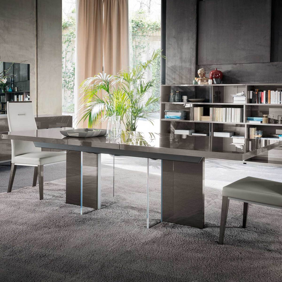 Adding sleek style to any dining space, the Santerno extending dining table features clean lines and oozes understated elegance. In a contemporary greige hue that blends well with any colour scheme, the table’s chic high gloss finish reflects light and enhances space. Transparent panels to the legs provide an additional element of modernity, whilst the rectilinear shapes achieve a bold and unique look. Conveniently extendable for entertaining extra guests, the Santerno combines with other pieces from the range to create a beautifully uniform feel.
