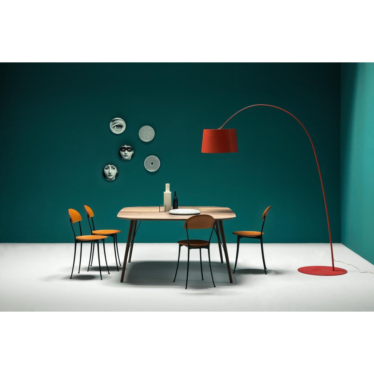 The table Santiago designed by the Austrian Frank Rettenbacher shows a slender and elegant outline, with the light shape of an aircraft wing. «The idea is bringing the same lightness of the metal tables into bigger sizes versions, thanks to a contemporary project with a linear and distinguishing silhouette. The table is made of solid oak with slender legs embraced by thin wires that illustrate the flow of forces: a design inspired by the work of architect Santiago Calatrava, where the best steadiness is ensured even maintaining the wooden legs as thin as possible. The expanded top surface conceals strengthening T-profiles that prevent warping and avoid using bulky cross-bars. Thanks to Zanotta engineering process we created one of the most lightweight tables solid oak tables available in the market».