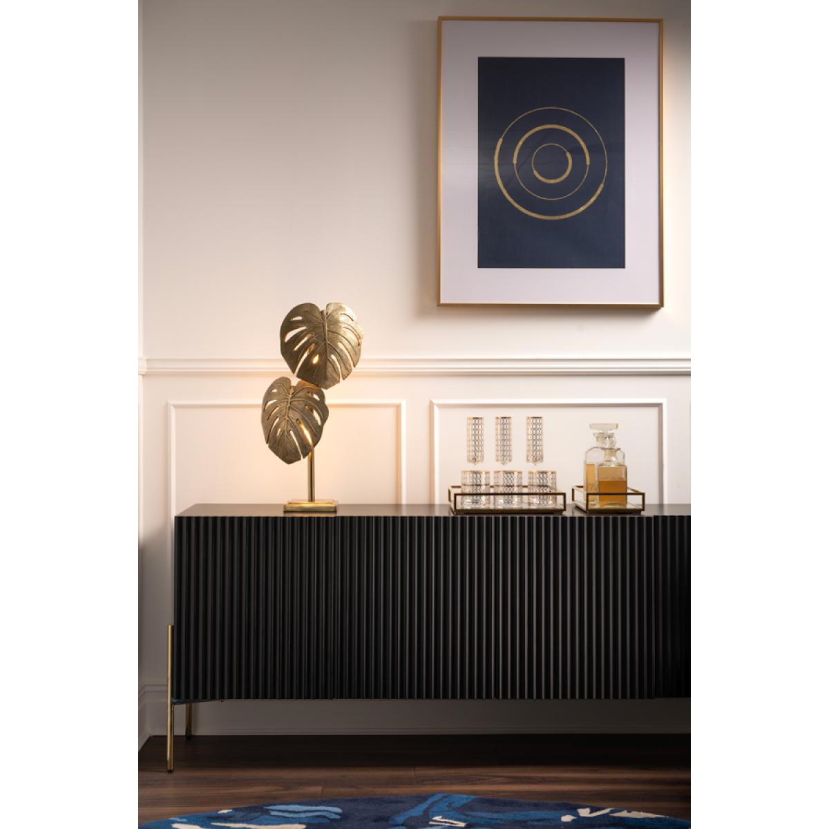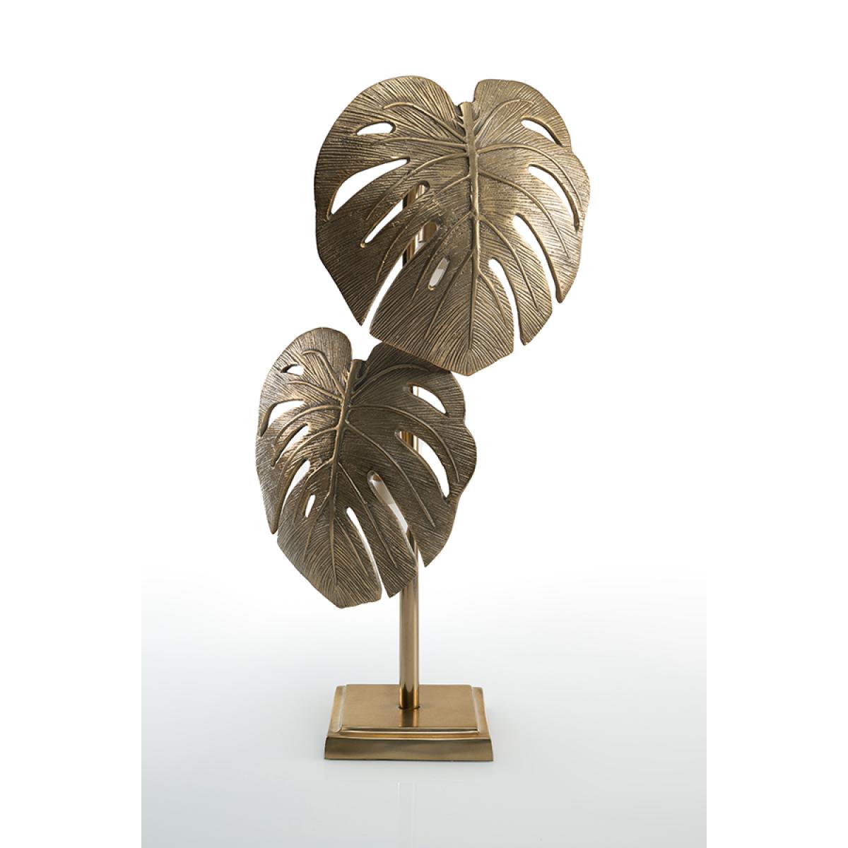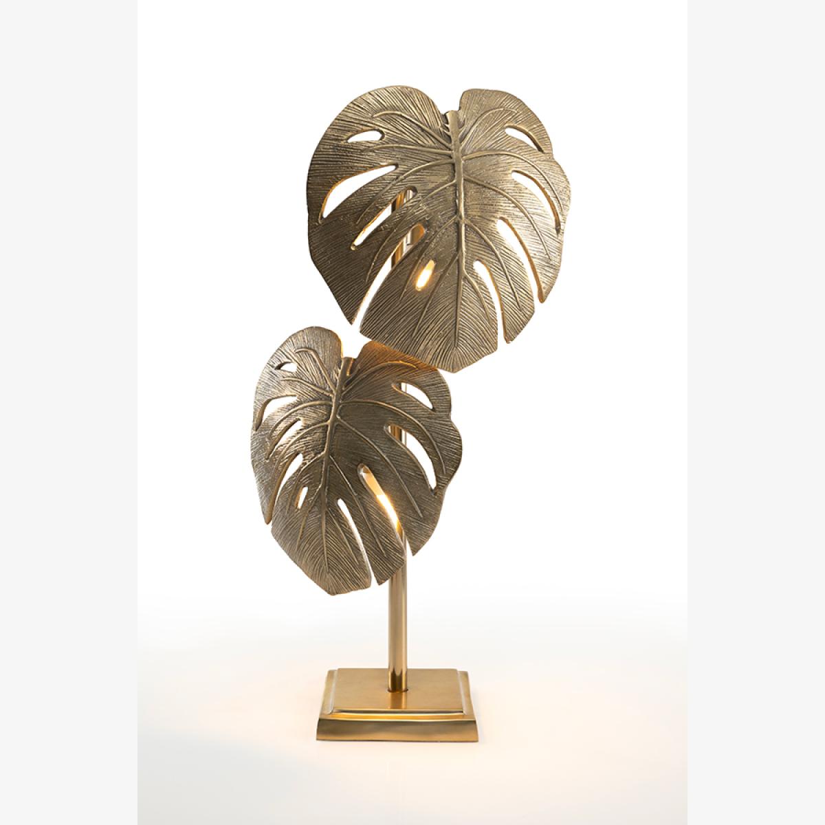 An eclectic, glamourous, tropical inspired two leaf table light. Cast from a hand crafted sculpture in solid aluminium with a brass finish. Suitable for use with 2 x 5. 5W E14 candle bulbs (not supplied). Black flex cable with inline on/off switch.