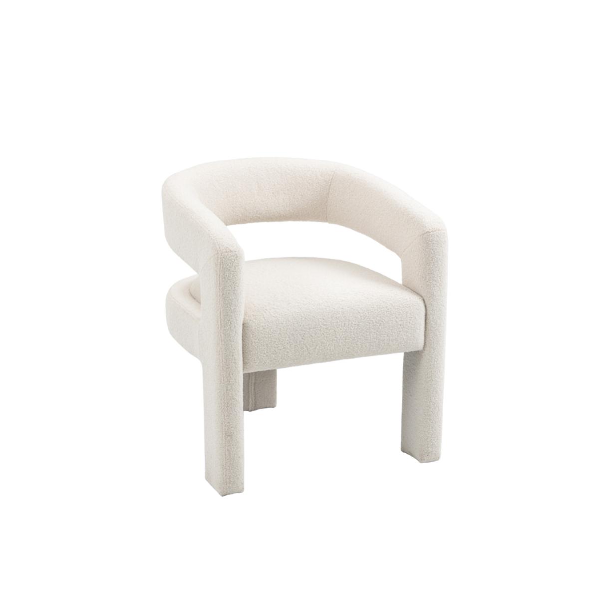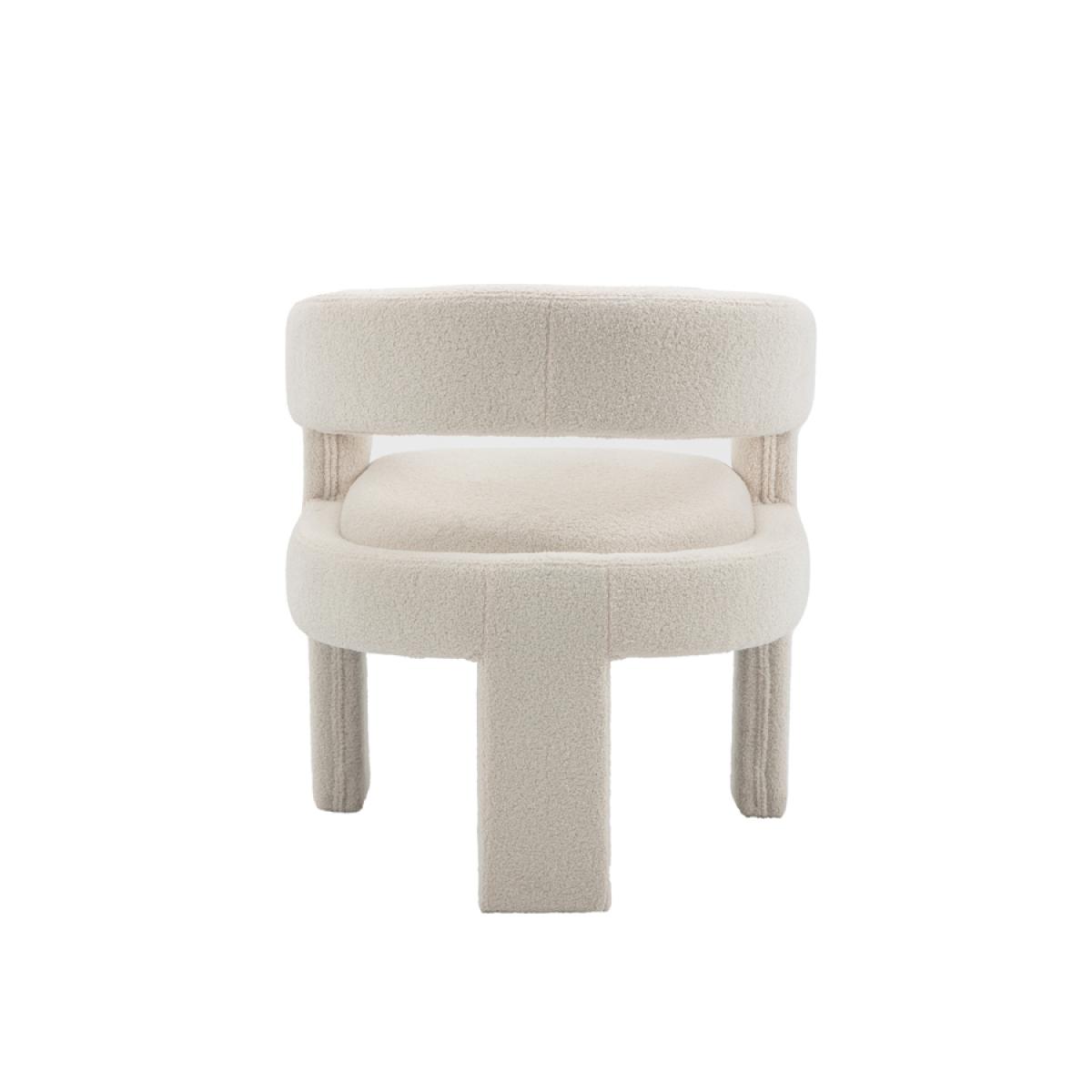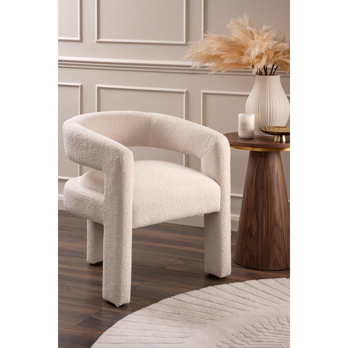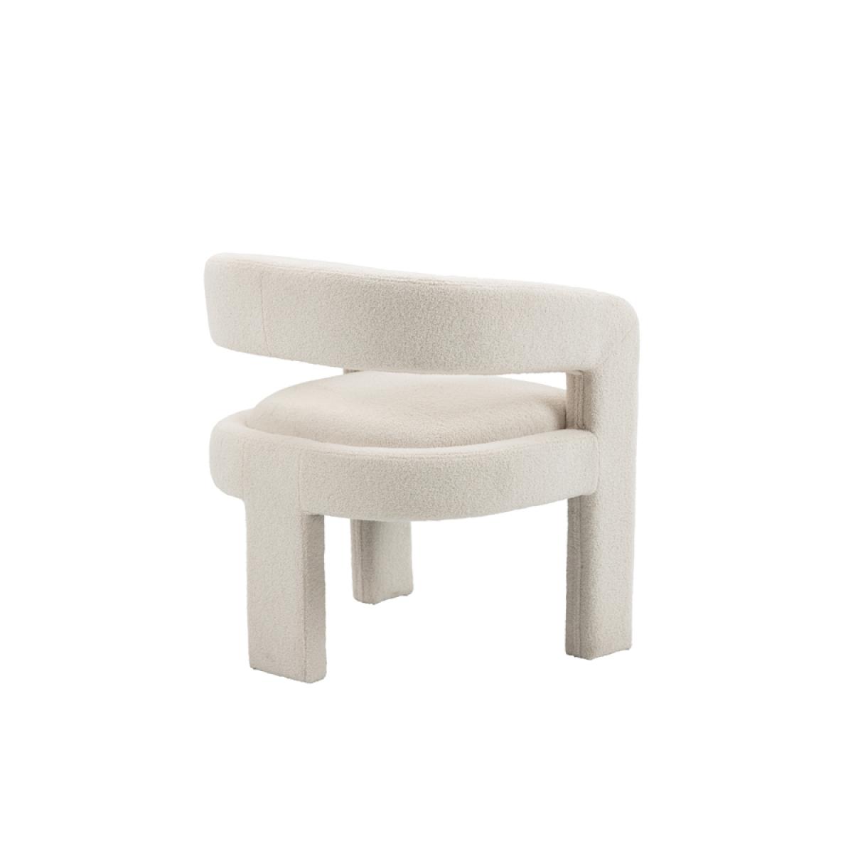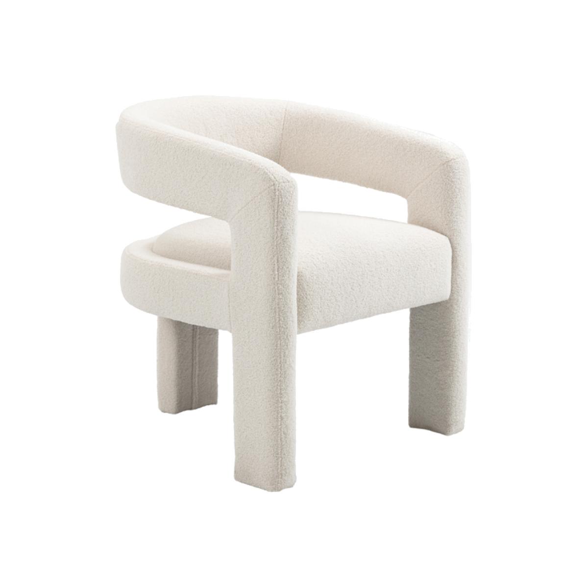 A playful statement chair with a sculptural silhouette. Fully upholstered in a tactile borg fabric. Sprung base with comfortable deep foam and fibre filling. Designed for use as a dining chair but would be equally perfect as an accent or dressing table chair. Supplied fully assembled.