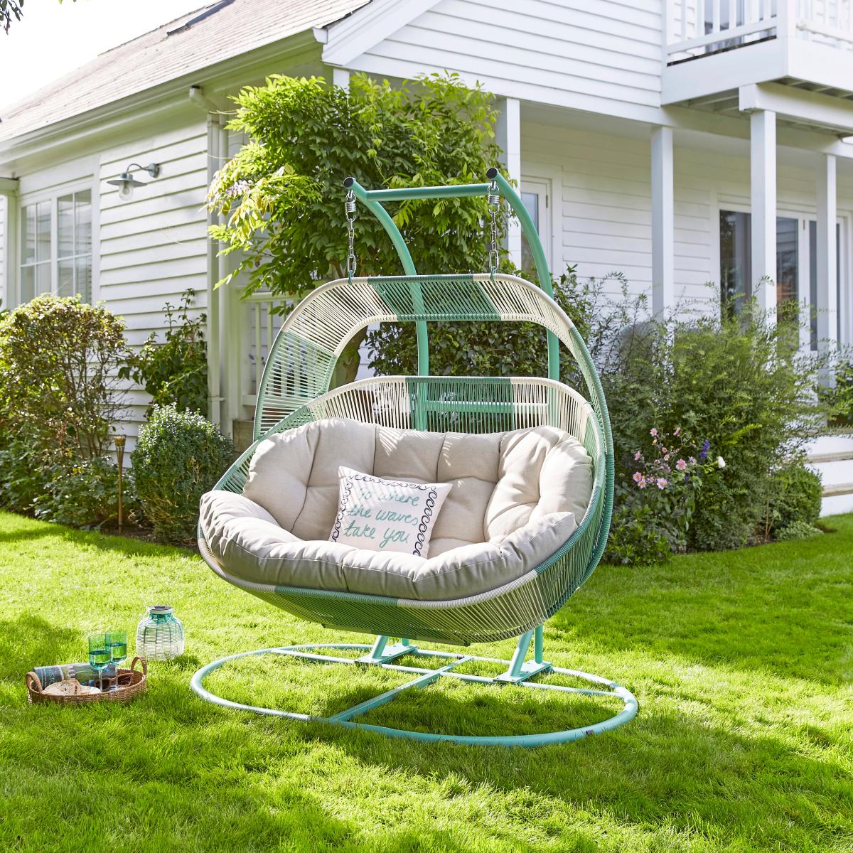 * Hanging Egg Chair * Double capacity * Sturdy steel frame * Weather resistant design Elevate your outdoor lounging experience with the Santorini Double Egg Chair. Designed to comfortably seat two, this hanging chair combines a bold, contrasting colour palette with a unique rattan weave and a special shape design. Crafted with a powder-coated steel frame and weather-resistant materials, it ensures lasting durability and style for any garden or patio.