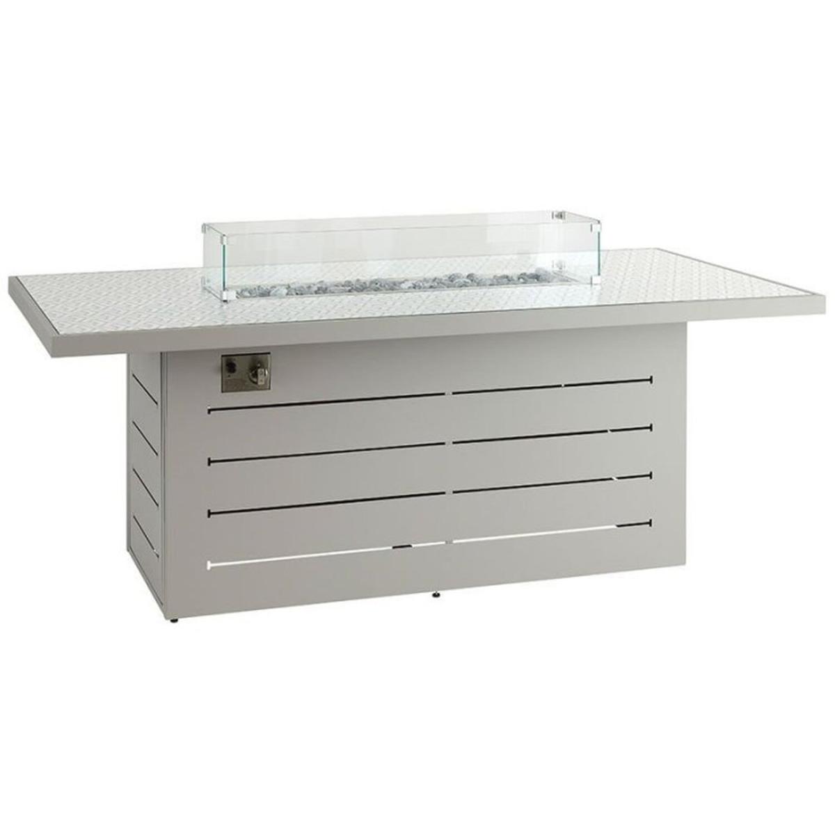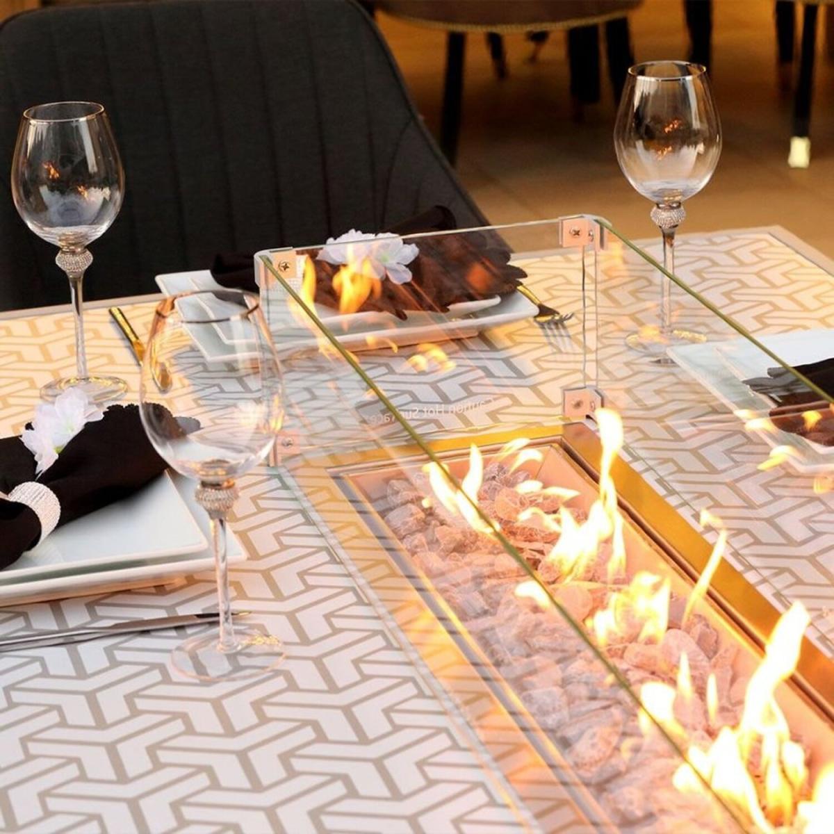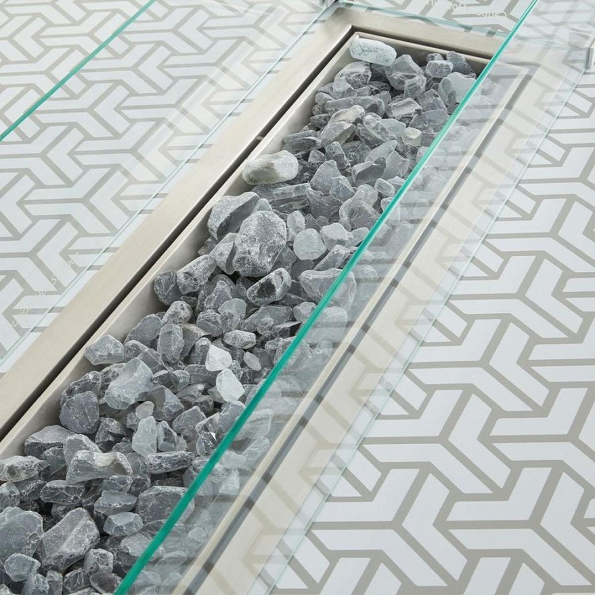 This Santorini Dining Table Set is a spectacular garden centre piece in a style that is sure to wow your guests. Featuring a gas powered built-in fire pit surrounded by tempered glass, the table is finished with a grey and white geometric pattern and is supported by a plinth base that houses your gas bottle. Included in this set are six dining chairs in a modern design and made from UV resistant fabric. The foam in these chairs is made from a honeycomb formation that allows rainwater to go straight through the chair ensuring they dry quickly. The chair legs are built from rust-free aluminium. Take your outdoor dining to the next level with this amazing dining set.